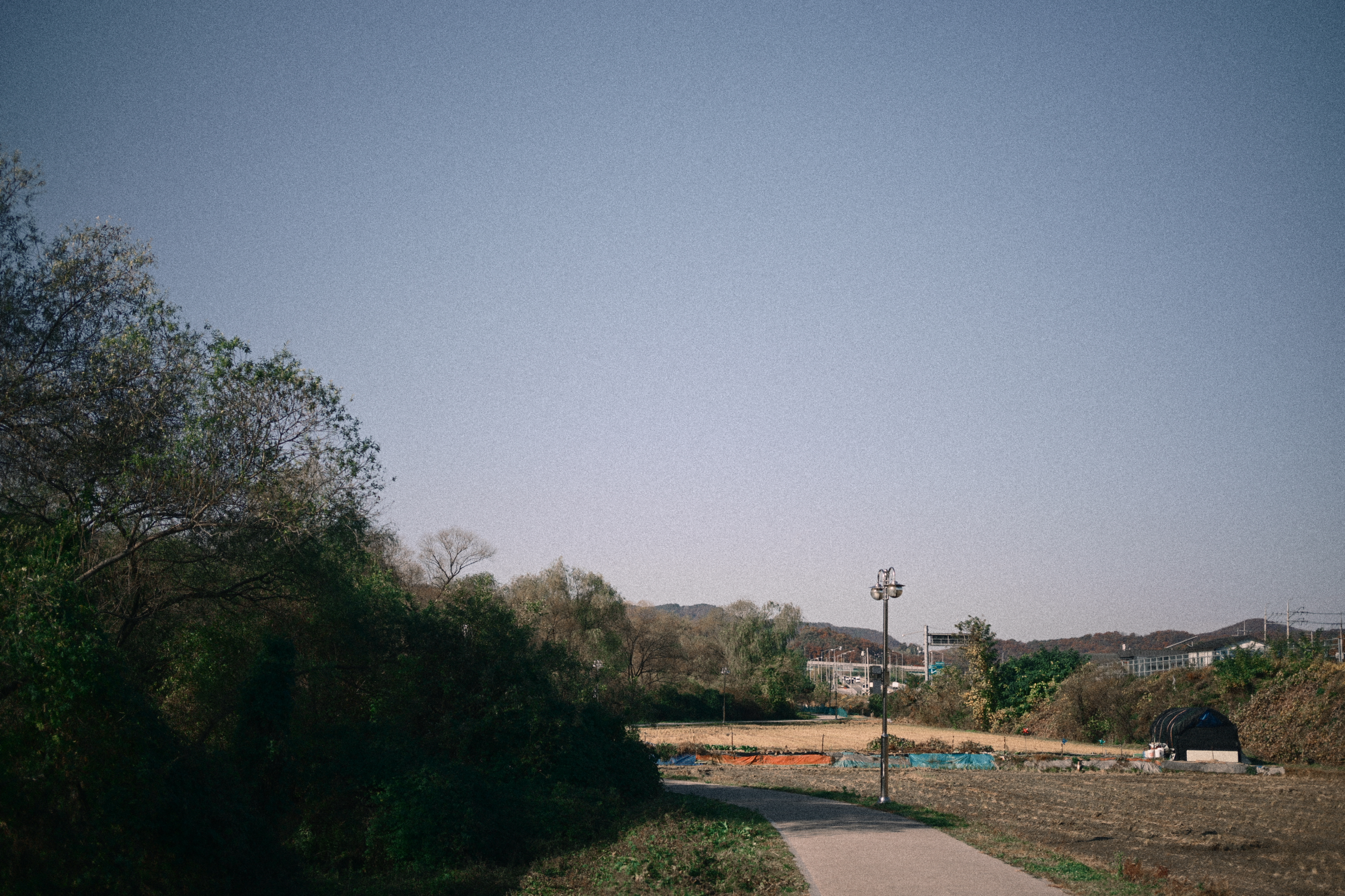 그레인이 더해지면서 마음이 끌리는 순간들이 있다. 이 사진들도 그랬다. 멀리 길게 펼쳐진 하늘과 한적한 산책로, 그리고 주변의 낮은 나무들은 본래라면 그저 평범한 풍경이었을 텐데, 그레인 덕분인지 전체적인 공기가 살짝 눌린 듯하면서도 은근하게 깊이가 생기는 거 같다. 아마 그레인이 없었으면 조금은 밋밋하게 느껴졌을 것 같은데, 그레인이 들어가니 감성적인 사진이 된 거 같아서 좋다.