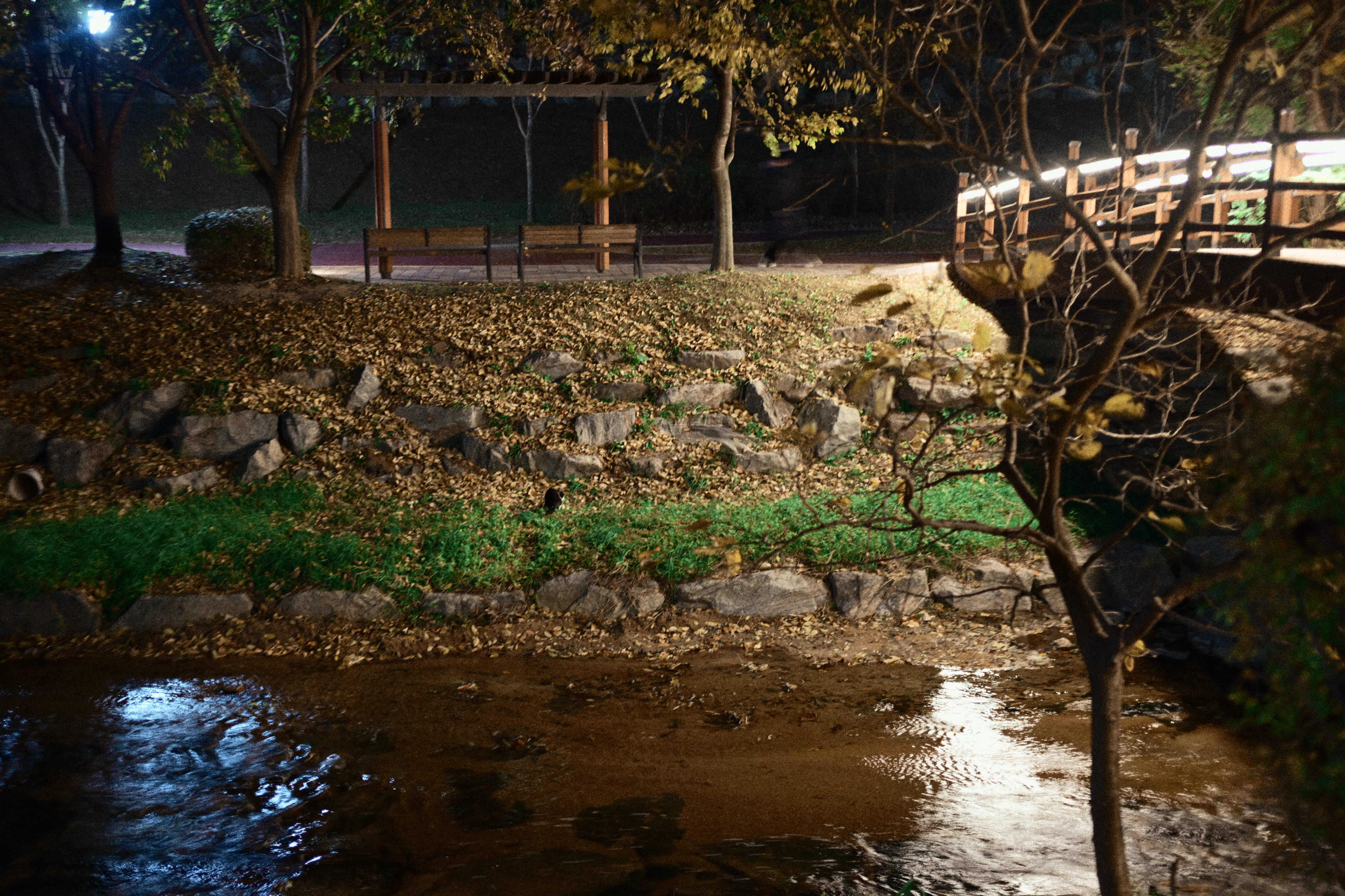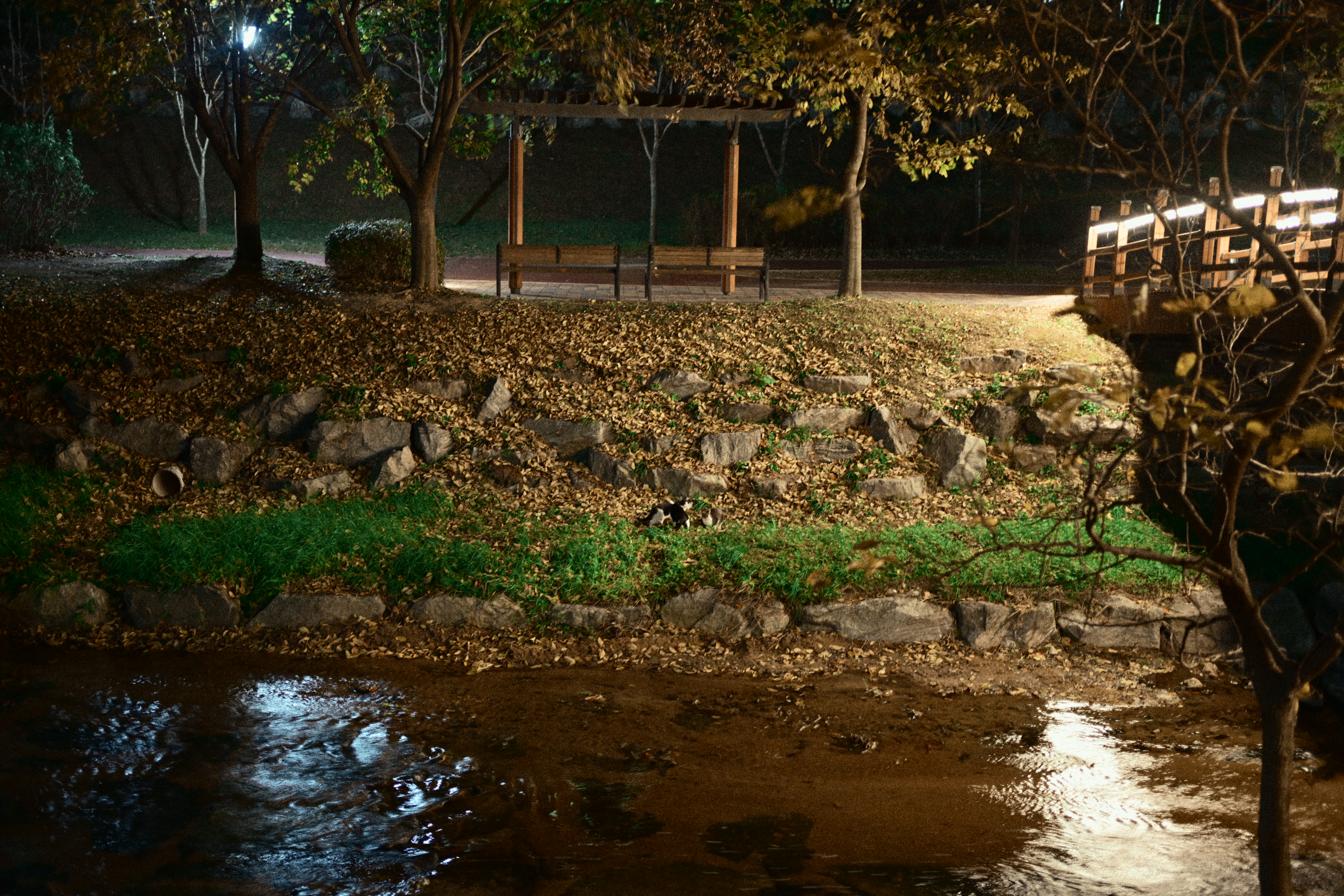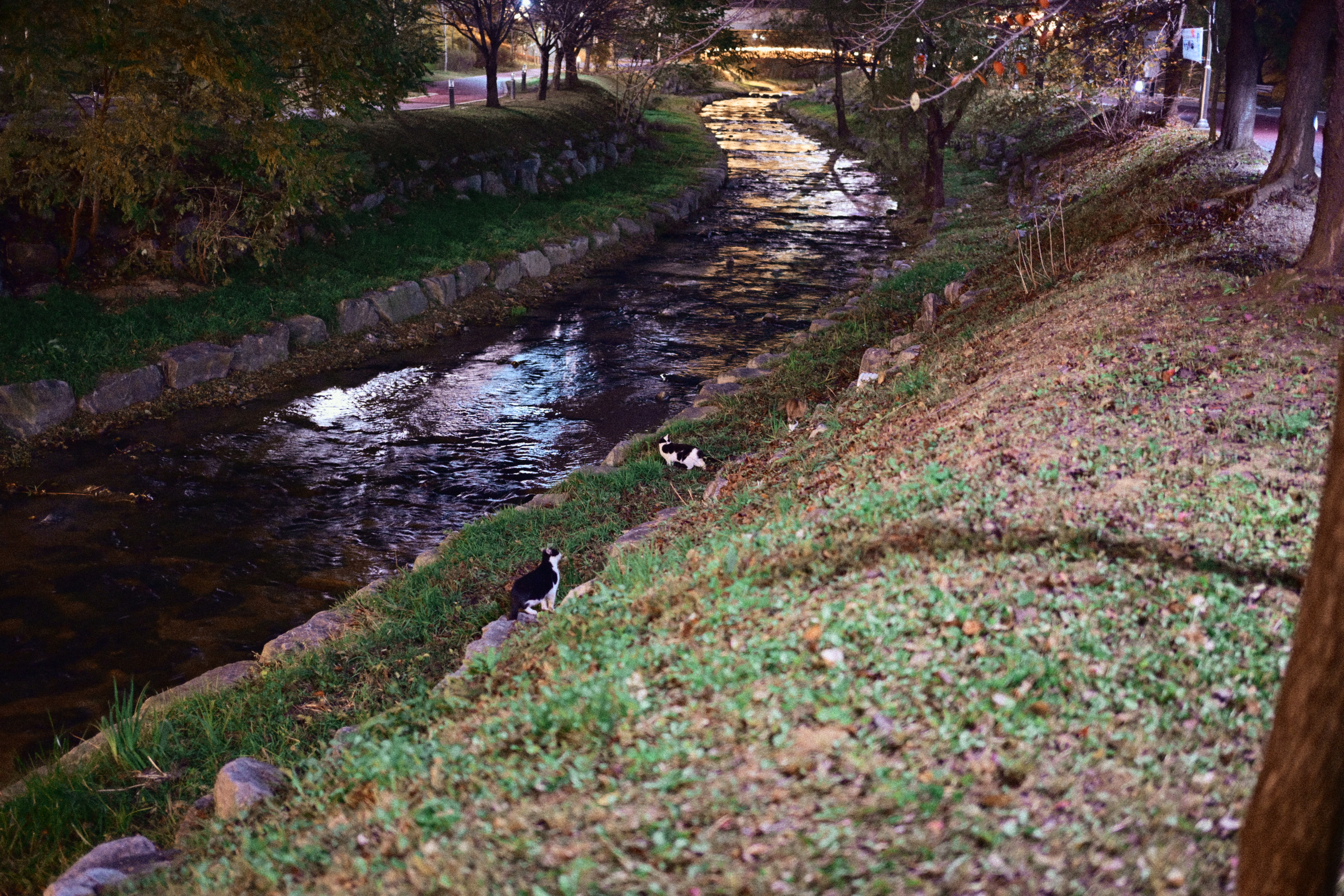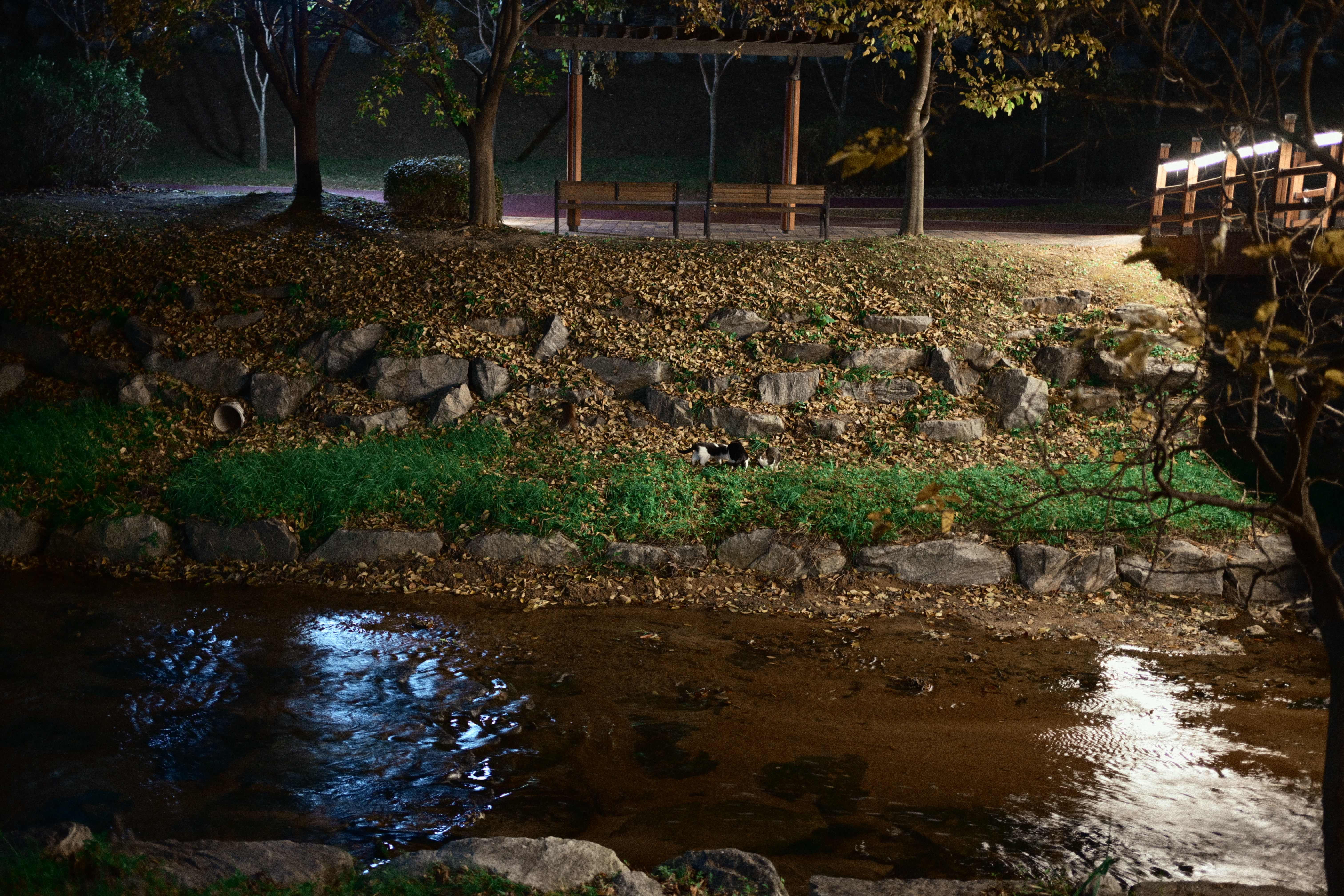 어떤 분이 스마트폰을 들고 사진을 한차 찍고 있길래, 시선이 따라갔다. 자세히 보니 산책로 반대편에 고양이들이 조용히 앉아 있더라. 그래서 나도 얼른 카메라를 들이대기 시작했다. 순간적으로 마음속에서 ‘아, 망원 렌즈가 있었으면...’ 하는 아쉬움이 확 올라왔다. 지금 들고 있는 건 40mm라 멀리 있는 고양이들을 담기엔 조금 부족했지만, 그래도 놓치고 싶지 않아 몇 번이고 구도를 바꿔가며 찍었다. 밤조명에 물든 하천과 그 옆에서 가만히 움직이는 고양이들, 그리고 그걸 찍고 있는 사람까지... 모두 하나의 기묘한 풍경처럼 느껴졌다. 잘 담지는 못했지만, 이런 ‘예상치 못한 순간’을 만났다는 것만으로도 카메라를 들고나온 게 참 다행이라는 생각이 들었다.