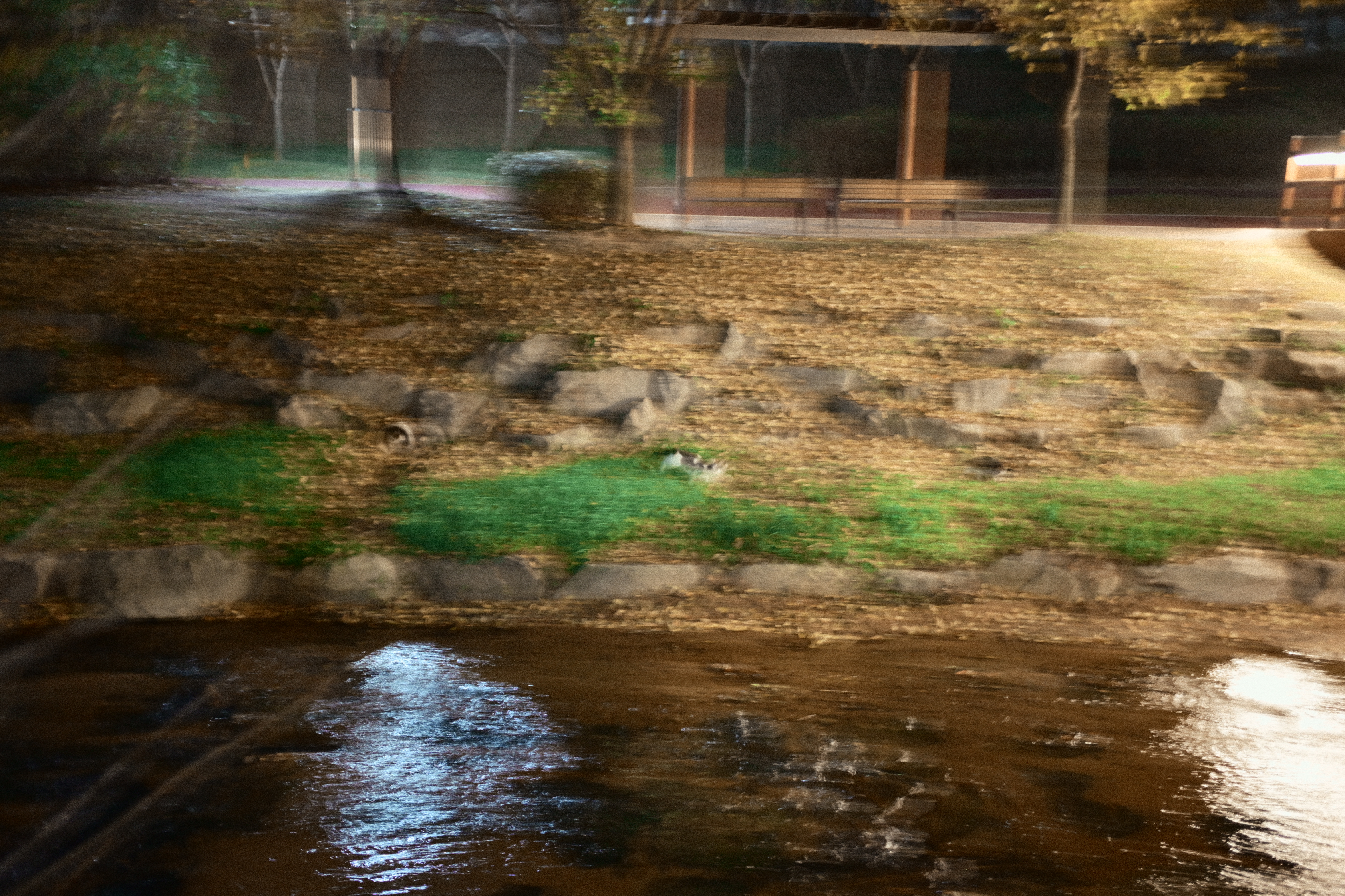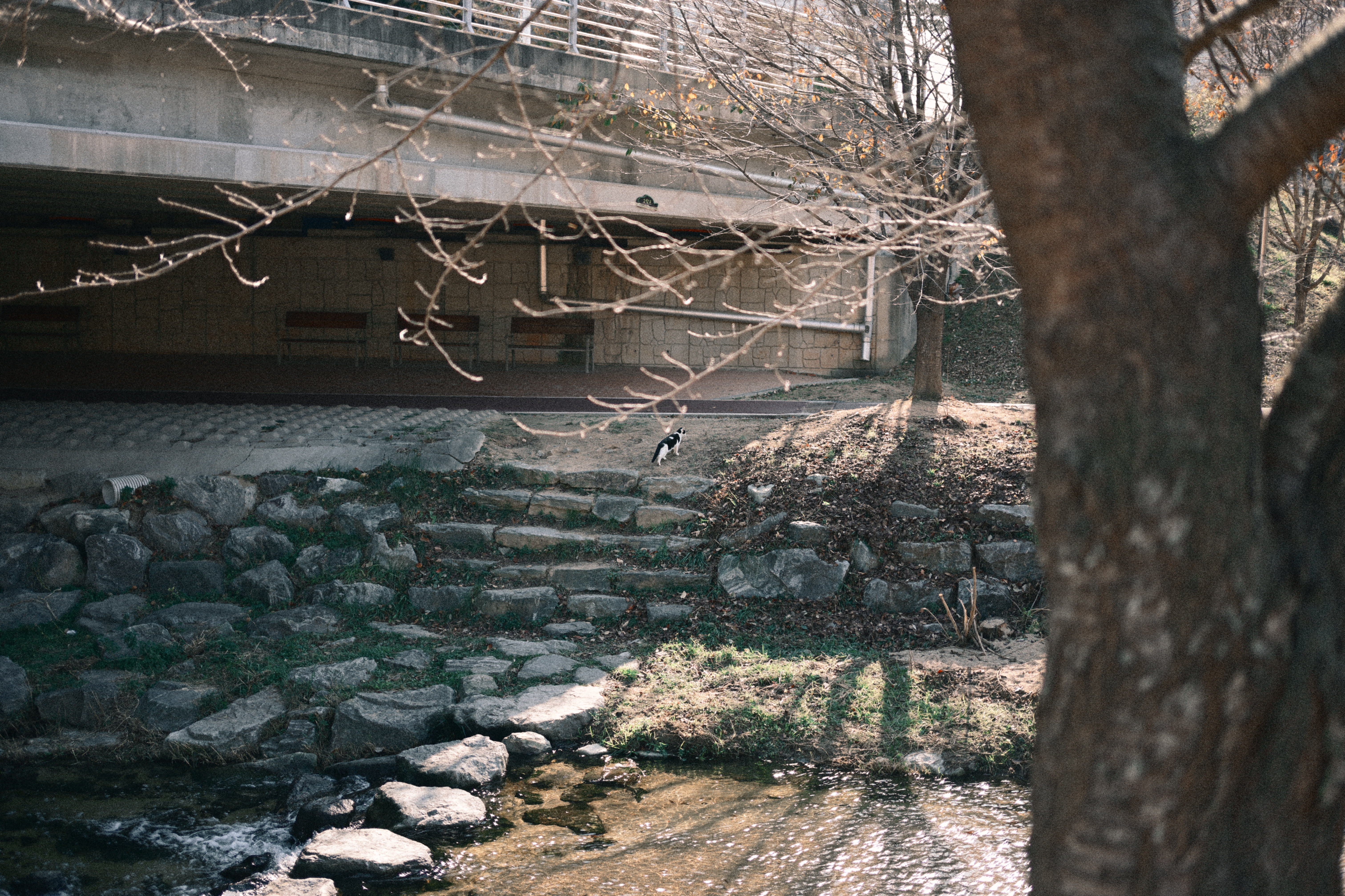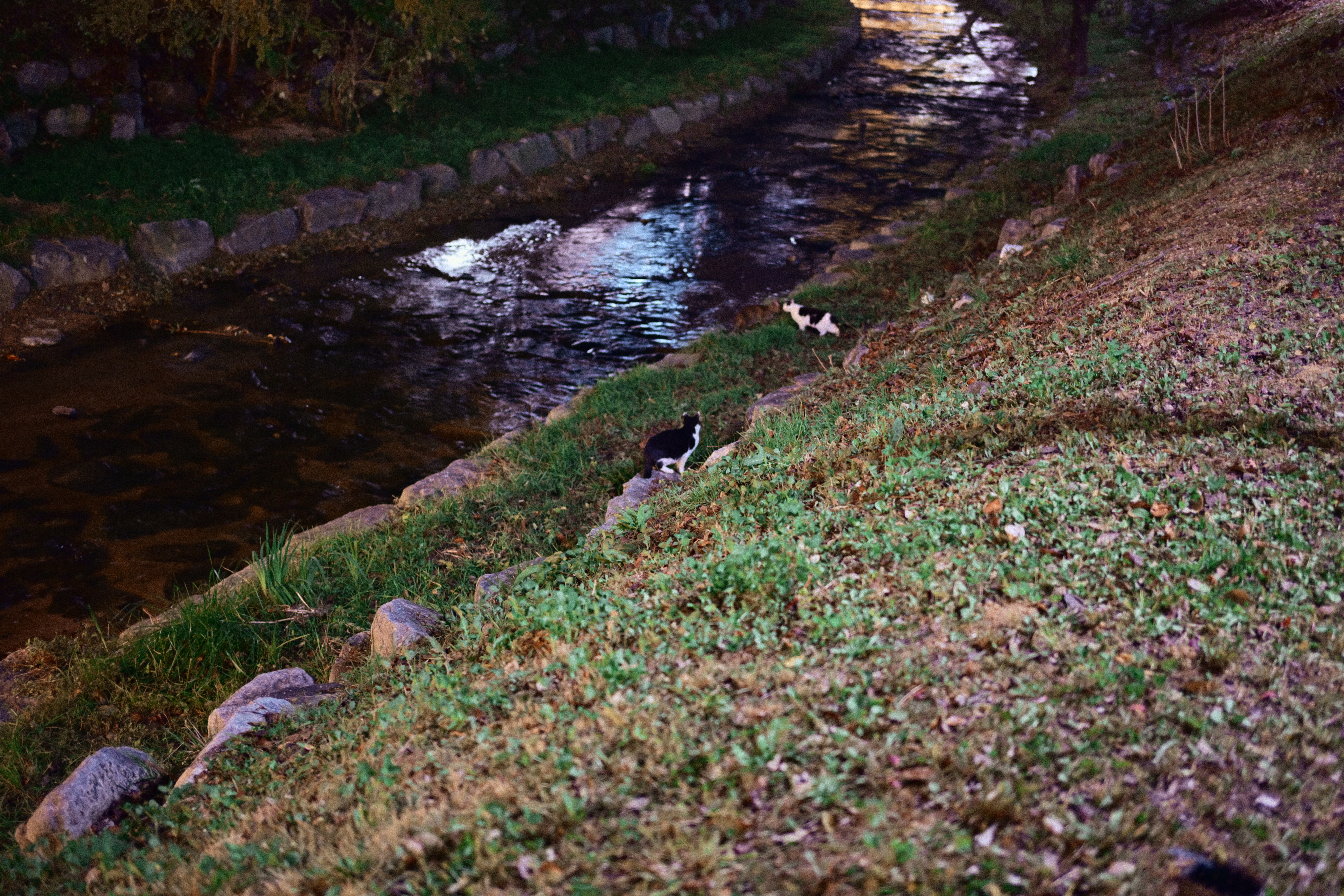 어떤 분이 스마트폰을 들고 사진을 한차 찍고 있길래, 시선이 따라갔다. 자세히 보니 산책로 반대편에 고양이들이 조용히 앉아 있더라. 그래서 나도 얼른 카메라를 들이대기 시작했다. 순간적으로 마음속에서 ‘아, 망원 렌즈가 있었으면...’ 하는 아쉬움이 확 올라왔다. 지금 들고 있는 건 40mm라 멀리 있는 고양이들을 담기엔 조금 부족했지만, 그래도 놓치고 싶지 않아 몇 번이고 구도를 바꿔가며 찍었다. 밤조명에 물든 하천과 그 옆에서 가만히 움직이는 고양이들, 그리고 그걸 찍고 있는 사람까지... 모두 하나의 기묘한 풍경처럼 느껴졌다. 잘 담지는 못했지만, 이런 ‘예상치 못한 순간’을 만났다는 것만으로도 카메라를 들고나온 게 참 다행이라는 생각이 들었다.