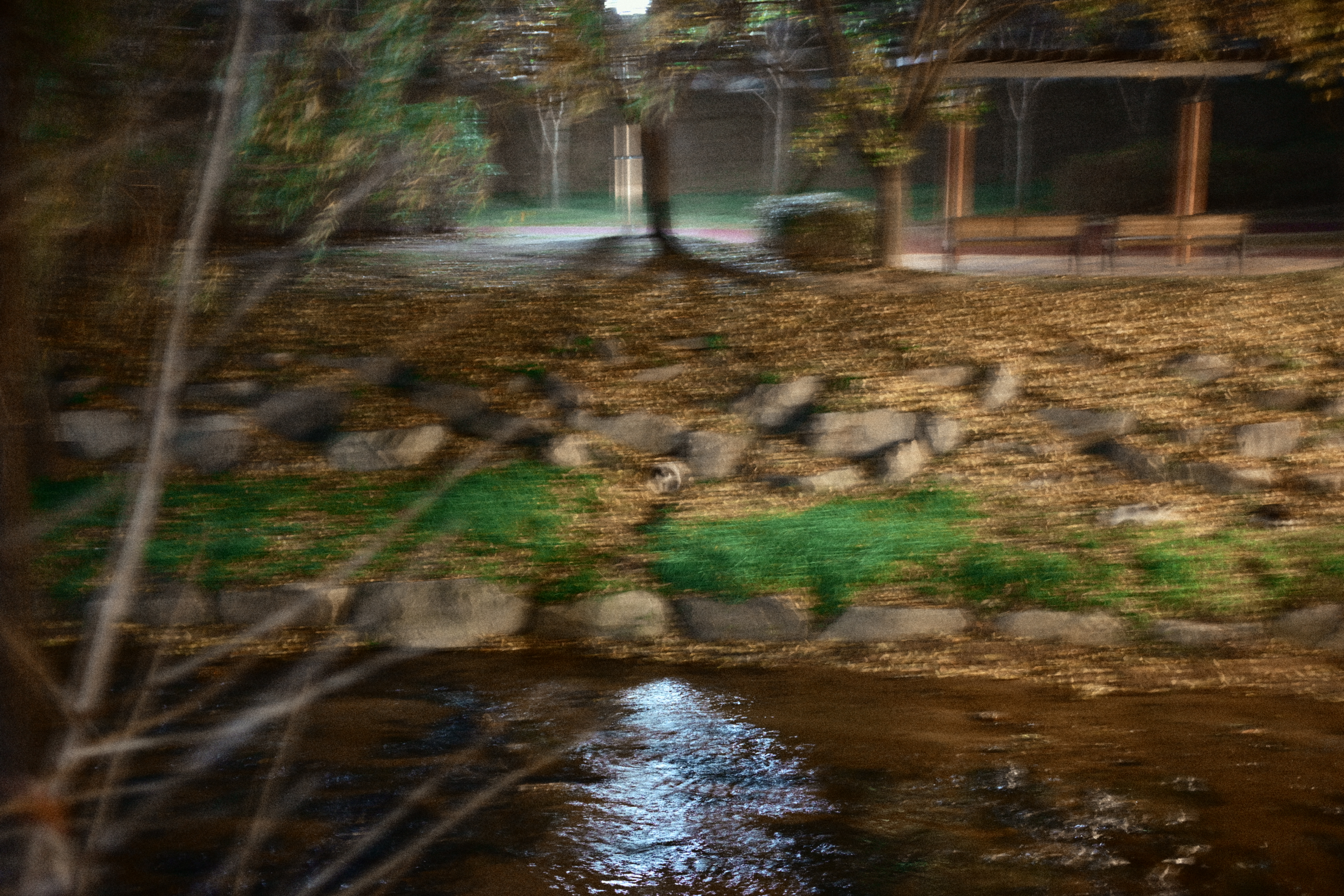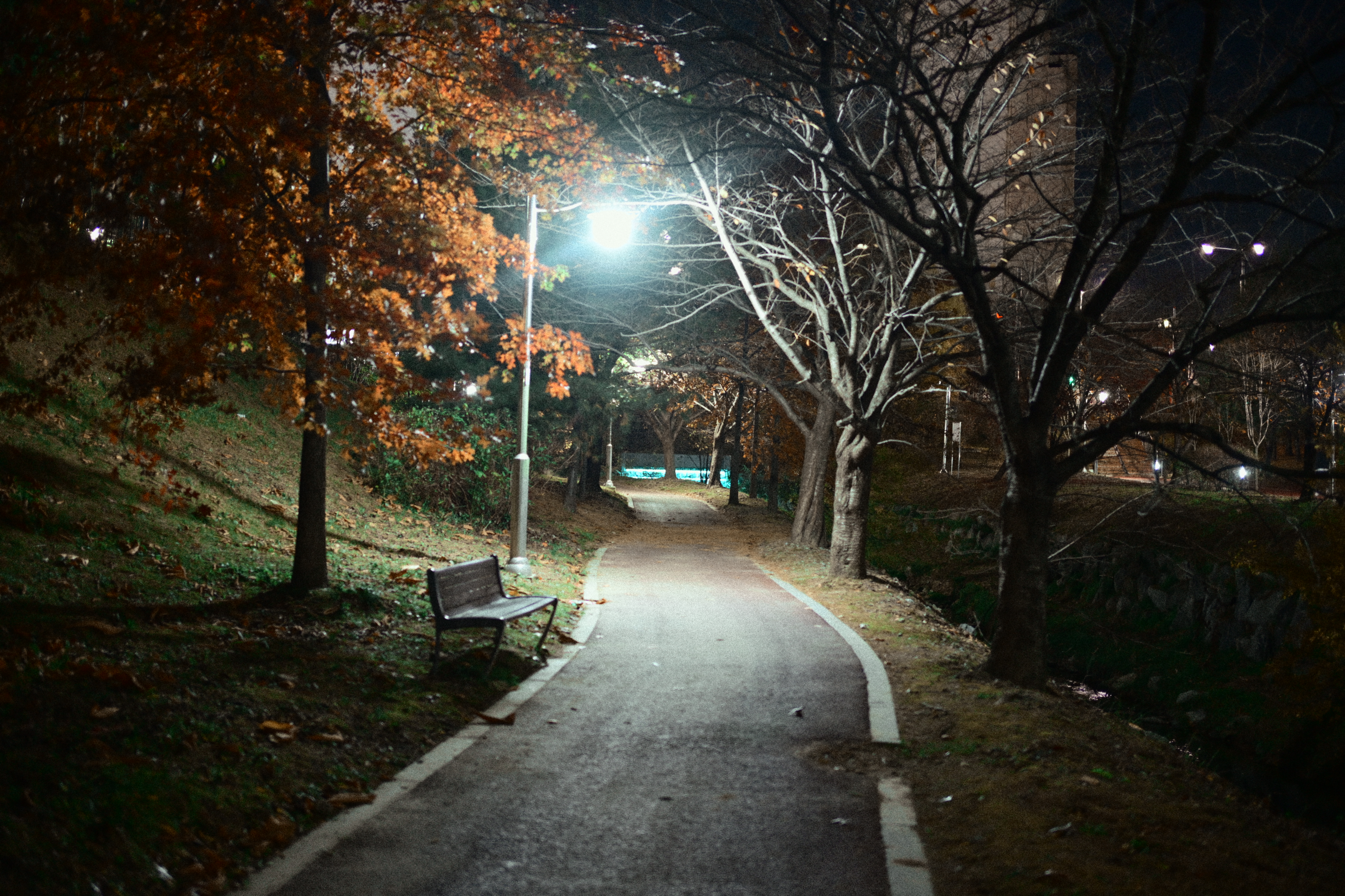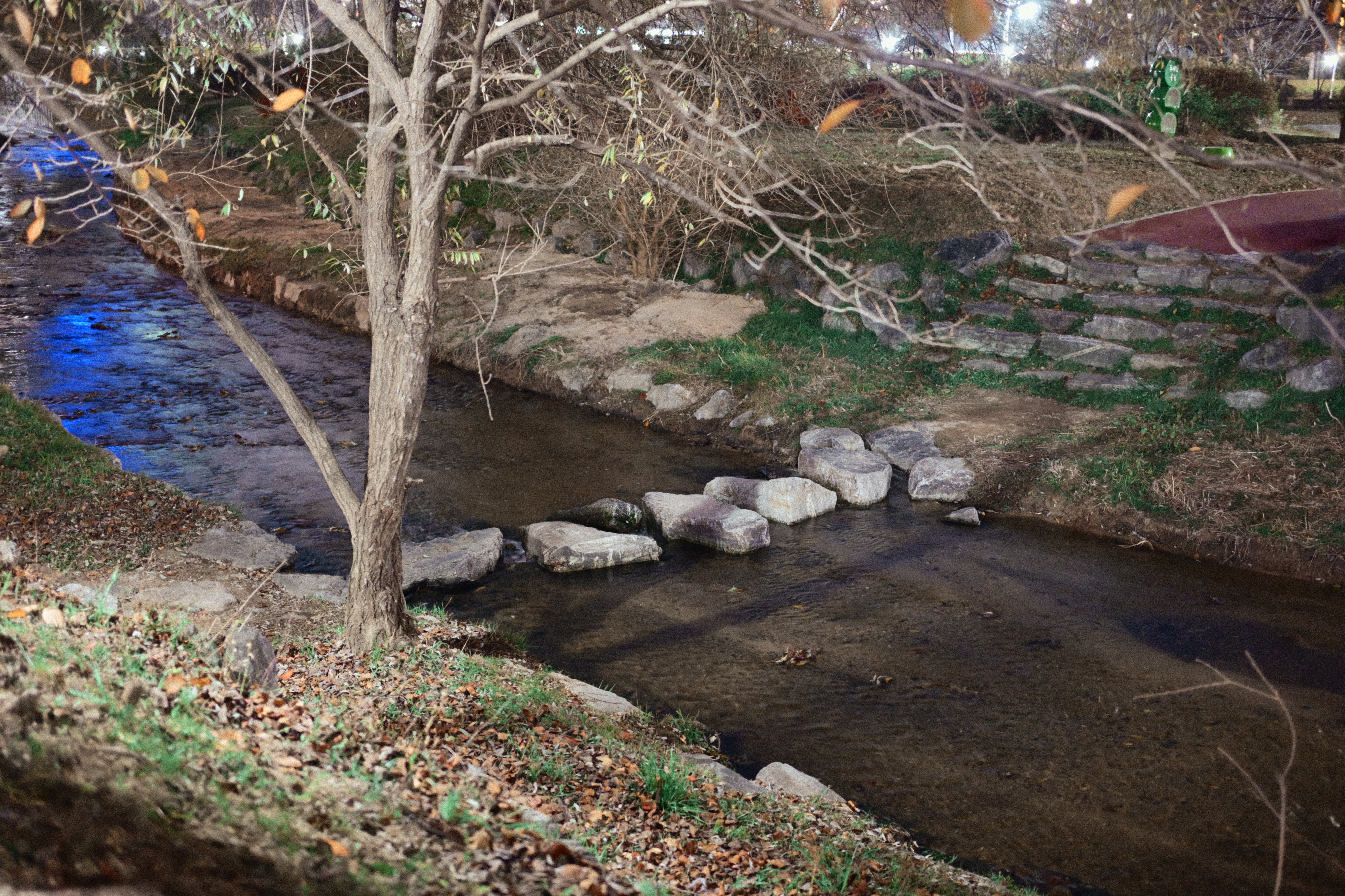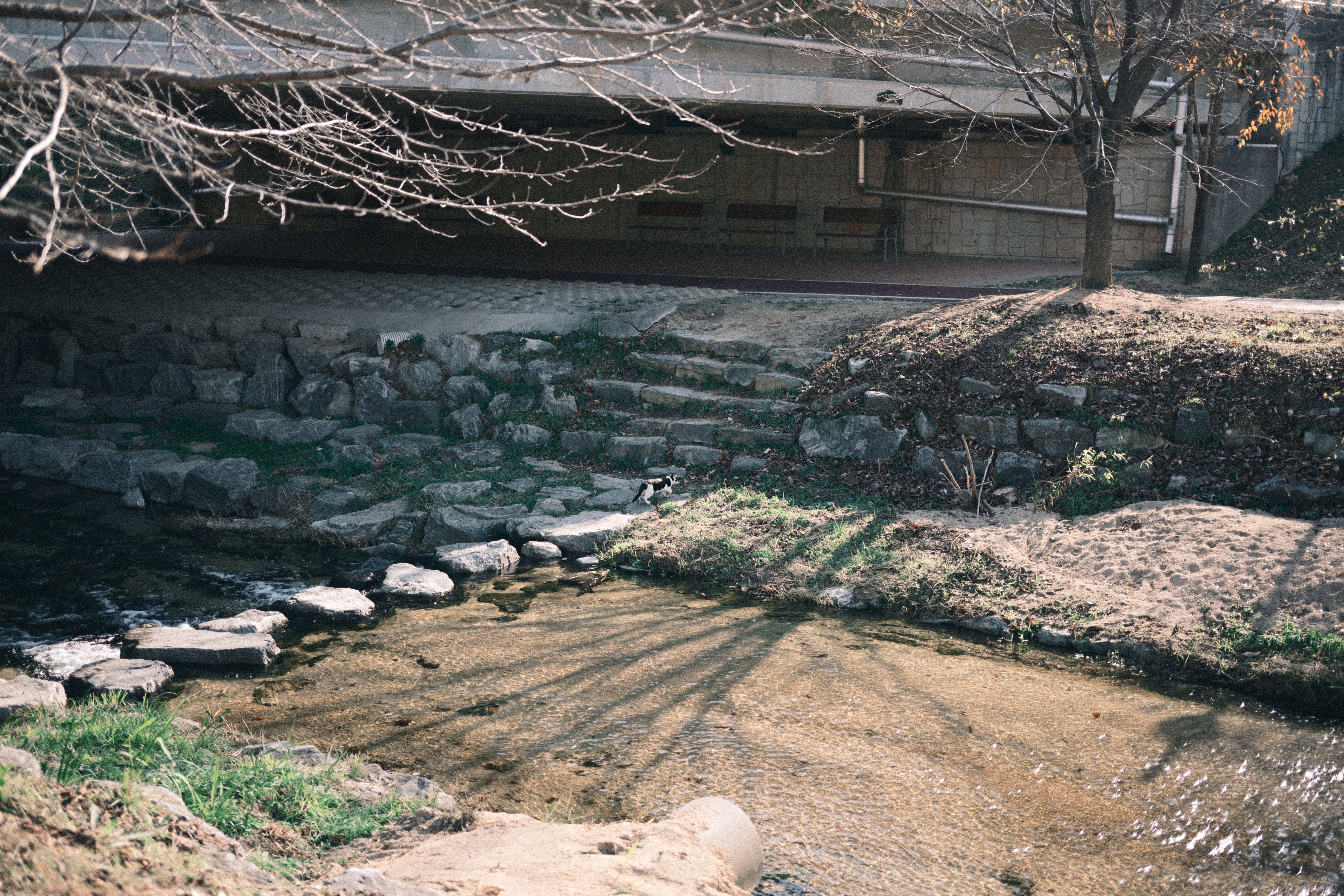 어떤 분이 스마트폰을 들고 사진을 한차 찍고 있길래, 시선이 따라갔다. 자세히 보니 산책로 반대편에 고양이들이 조용히 앉아 있더라. 그래서 나도 얼른 카메라를 들이대기 시작했다. 순간적으로 마음속에서 ‘아, 망원 렌즈가 있었으면...’ 하는 아쉬움이 확 올라왔다. 지금 들고 있는 건 40mm라 멀리 있는 고양이들을 담기엔 조금 부족했지만, 그래도 놓치고 싶지 않아 몇 번이고 구도를 바꿔가며 찍었다. 밤조명에 물든 하천과 그 옆에서 가만히 움직이는 고양이들, 그리고 그걸 찍고 있는 사람까지... 모두 하나의 기묘한 풍경처럼 느껴졌다. 잘 담지는 못했지만, 이런 ‘예상치 못한 순간’을 만났다는 것만으로도 카메라를 들고나온 게 참 다행이라는 생각이 들었다.