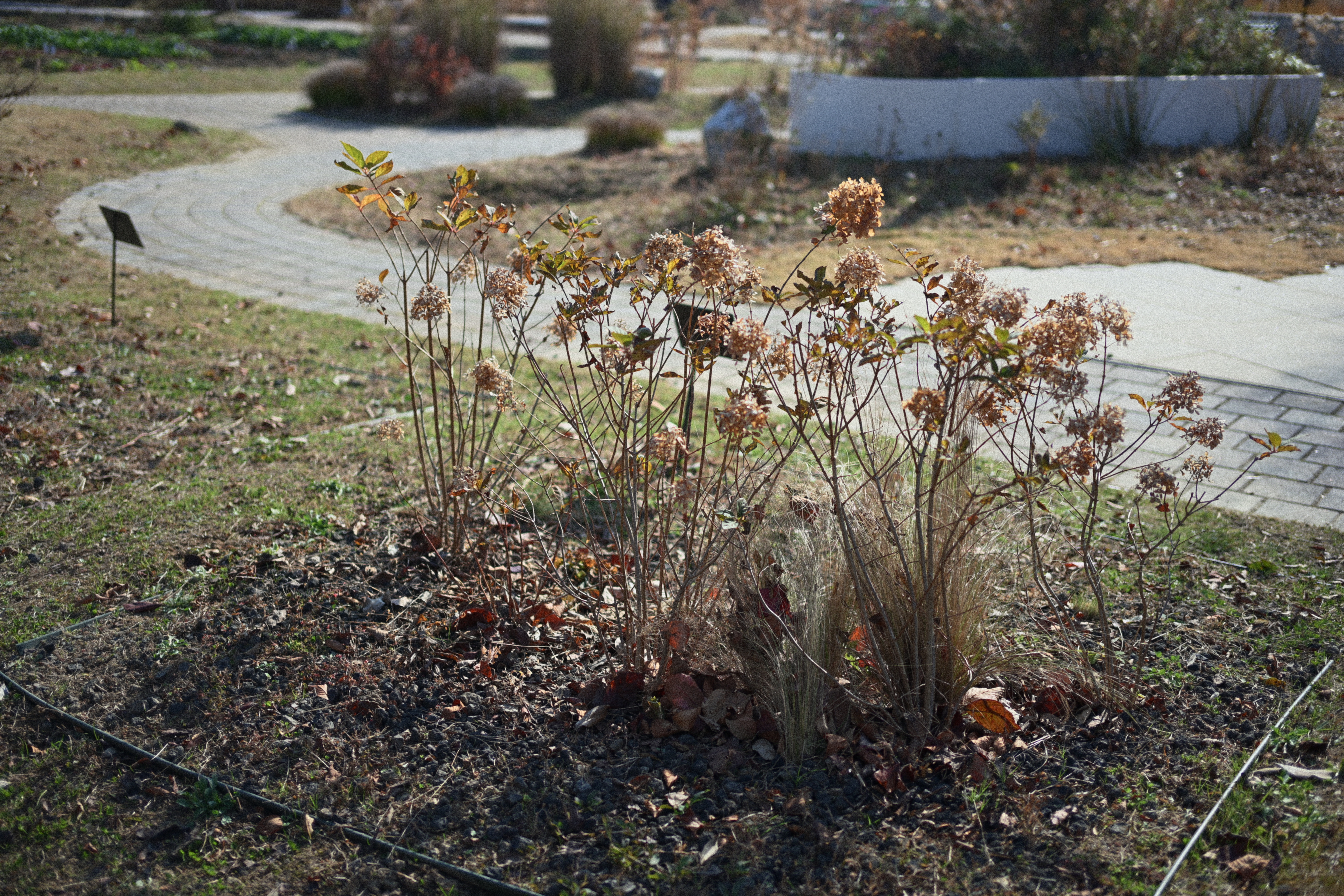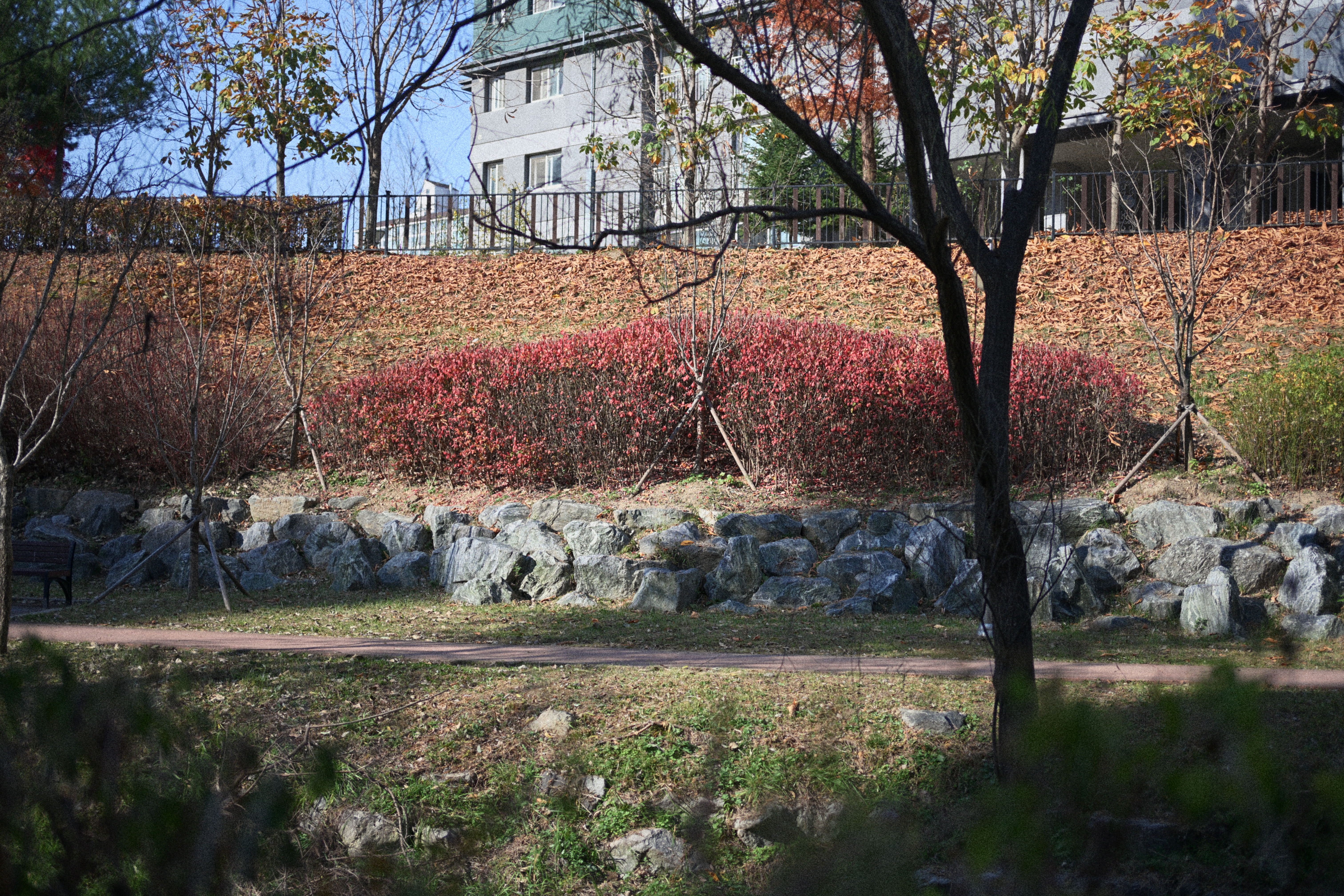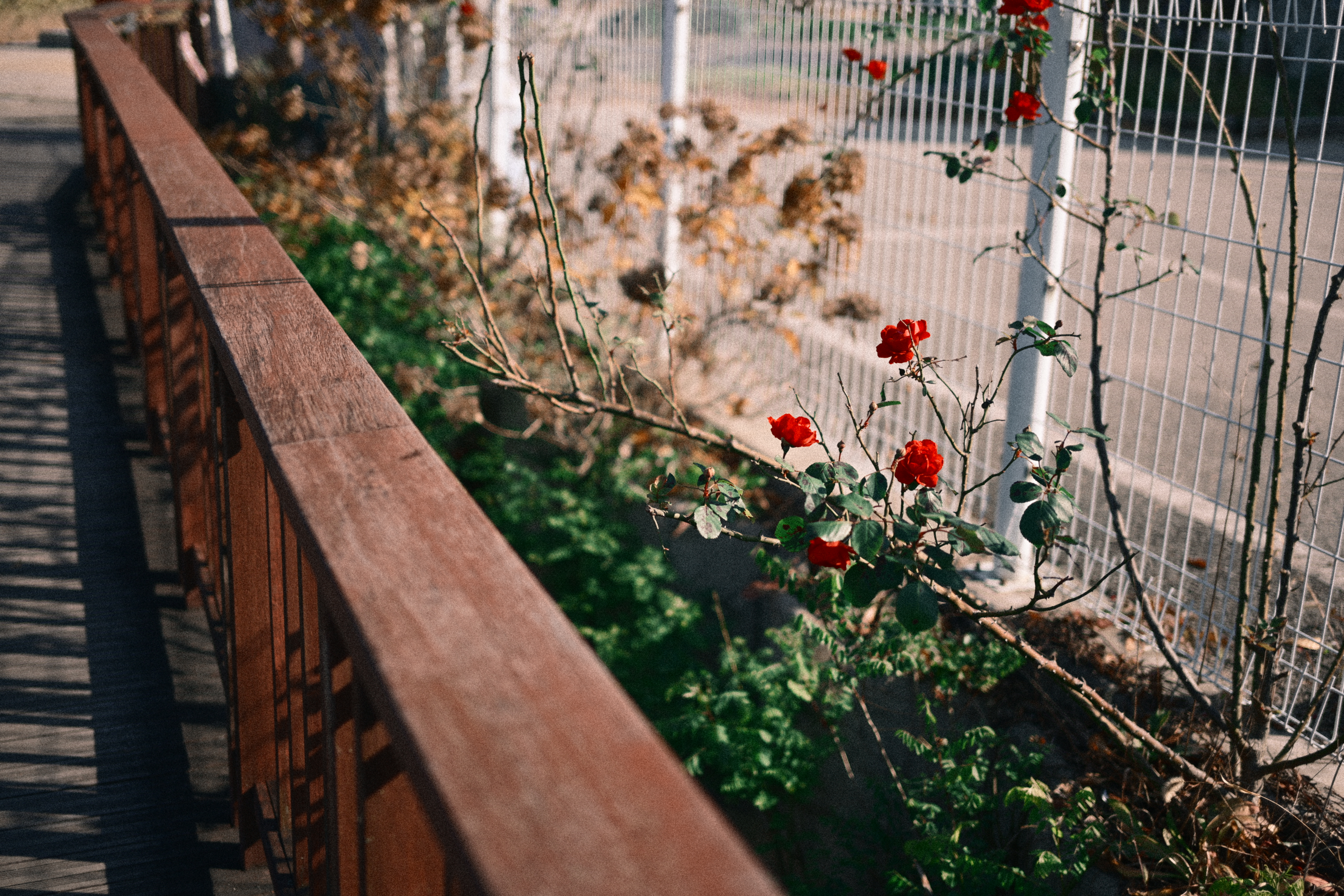 물 위에 떠 있던 연잎들은 이미 많이 말라 있었지만, 그 모습조차 가을 끝자락의 색감과 잘 어울려서 감성적으로 보였다. 멀리 보이는 산과 집들, 그리고 흐릿하게 번지는 그레인까지 더해지니, 흔한 풍경임에도 어딘가 영화처럼 보였다. 산책로를 걷다가 우연히 보게 된 붉은 장미도 참 인상적이었다. 주변 풍경은 이미 계절의 끝으로 향하고 있었는데, 그 가운데서 장미만 유난히 선명하게 빛났다. 빛을 받은 붉은색이 사진 속에서 또렷하게 살아나서, 그 대비가 더욱 강하게 다가온다. 이런 순간들이 카메라를 들고 다니는 즐거움을 더해주는 거다. 평소라면 그냥 지나쳤을 장면도, 렌즈를 통해 보면 전혀 다른 모습을 하고 있으니까.