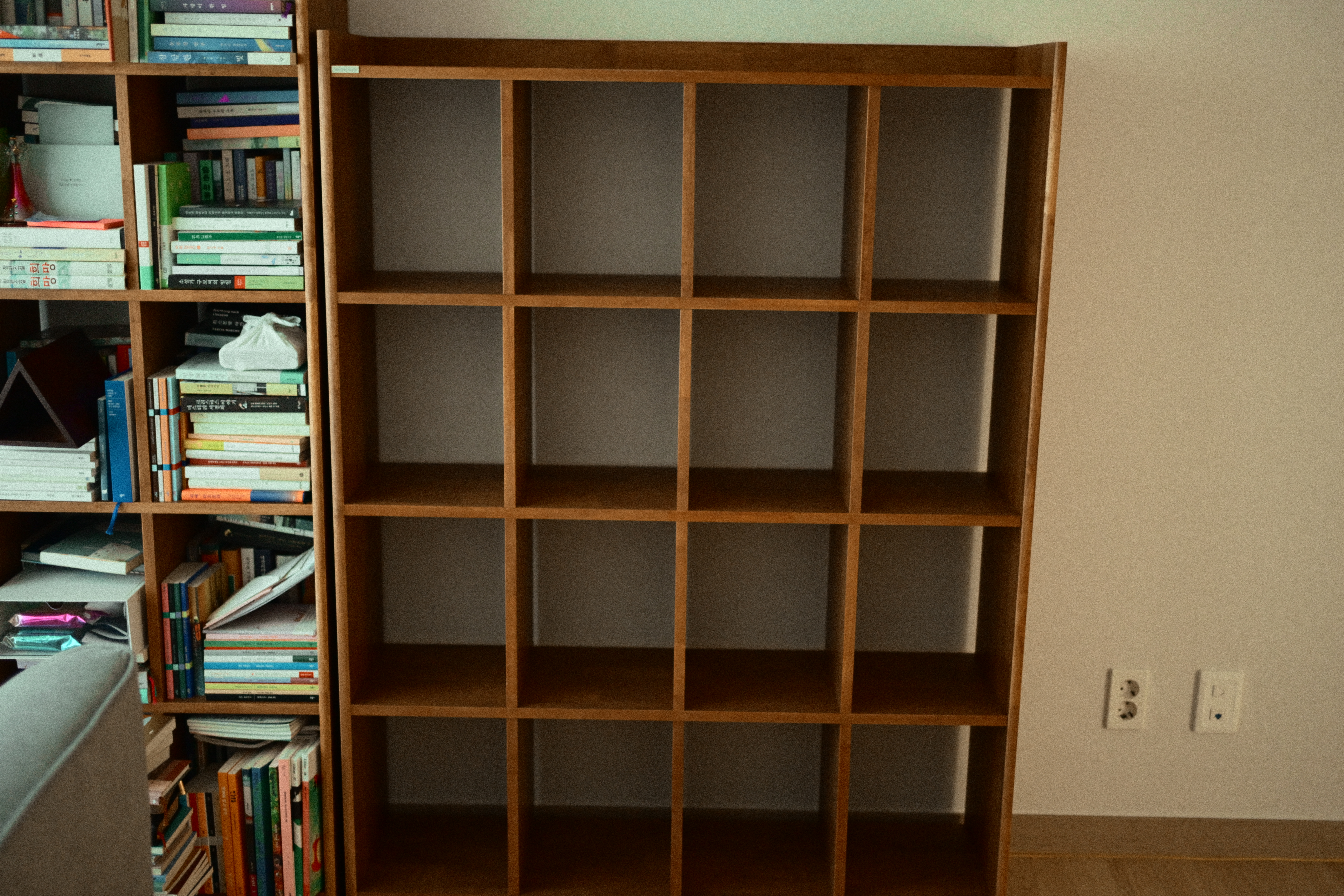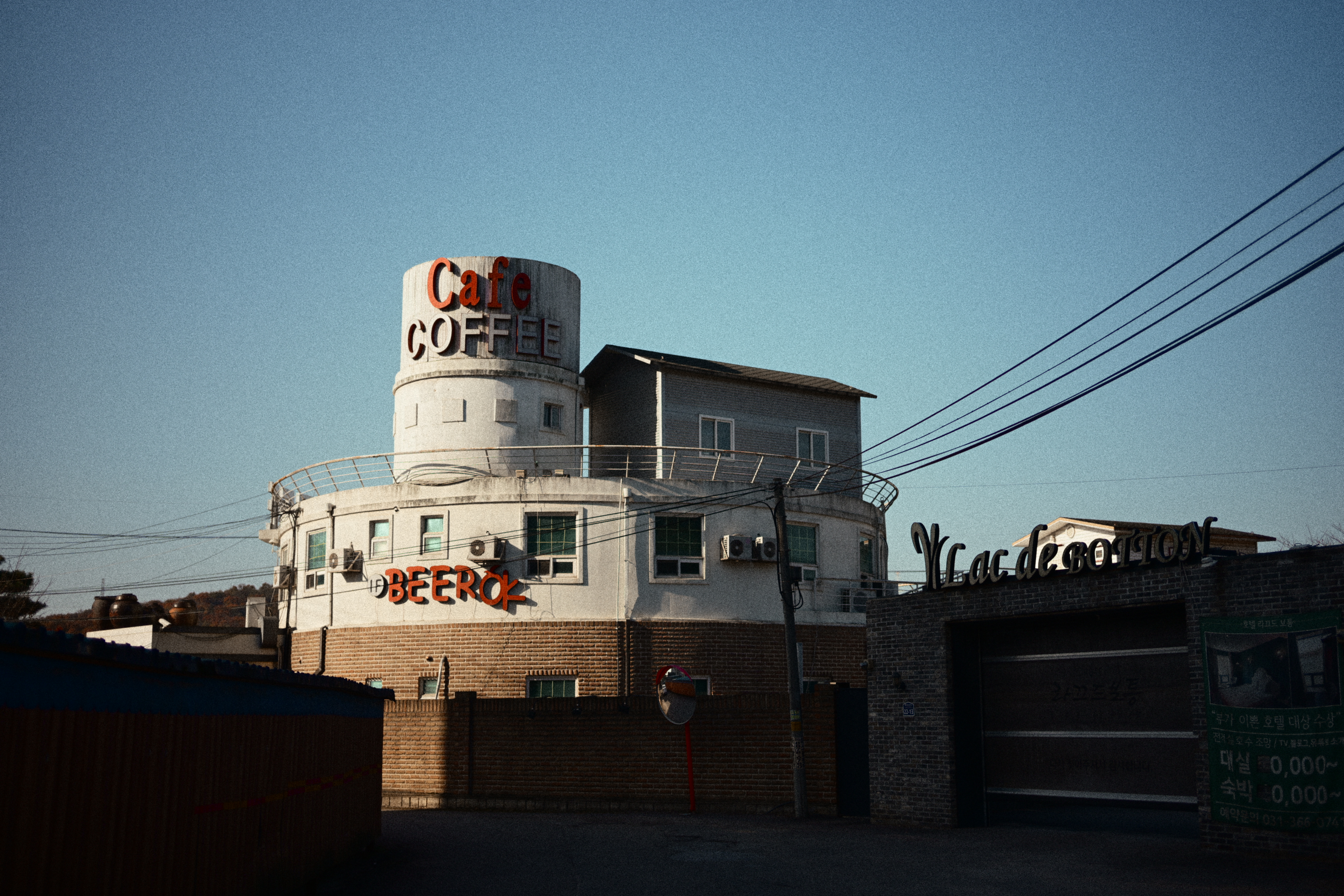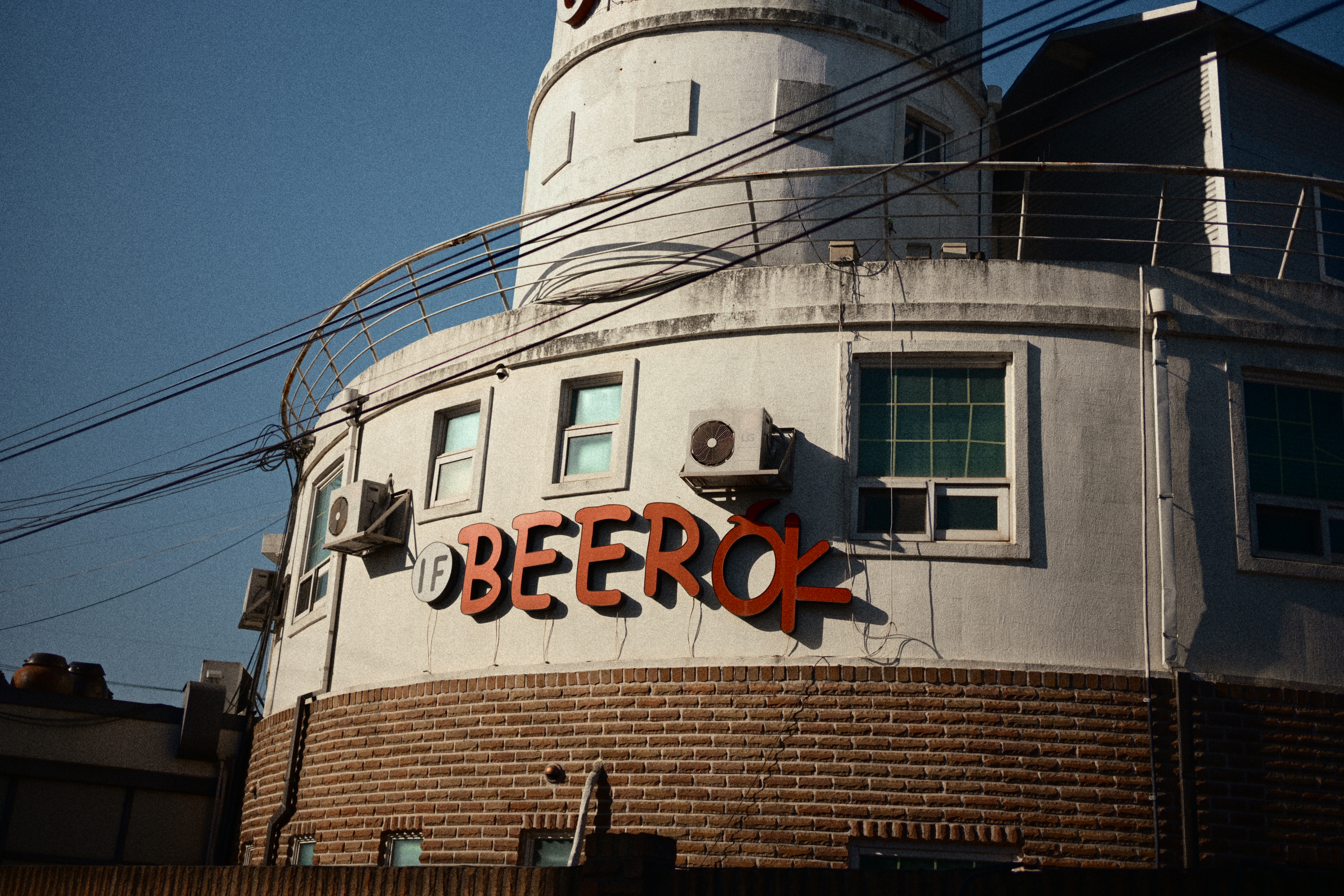 최근 찍은 사진들을 다시 들여다보면, 그레인이 얼마나 잘 어울리는지 새삼 느낀다. 이 건물 사진도 그렇다. 둥근 형태의 건물이 오래된 간판과 얽힌 전선들에 둘러싸여 있는데, 햇빛이 비스듬히 떨어지면서 만들어내는 그림자와 그레인에서 오는 거친 질감이 의도치 않게 영화 속 한 장면처럼 보이더라. 색감은 전체적으로 약간 바랜 듯하면서도 그림자 부분은 또렷하게 떨어져서, 오래된 필름으로 촬영한 듯한 분위기가 자연스럽게 잡혔다.