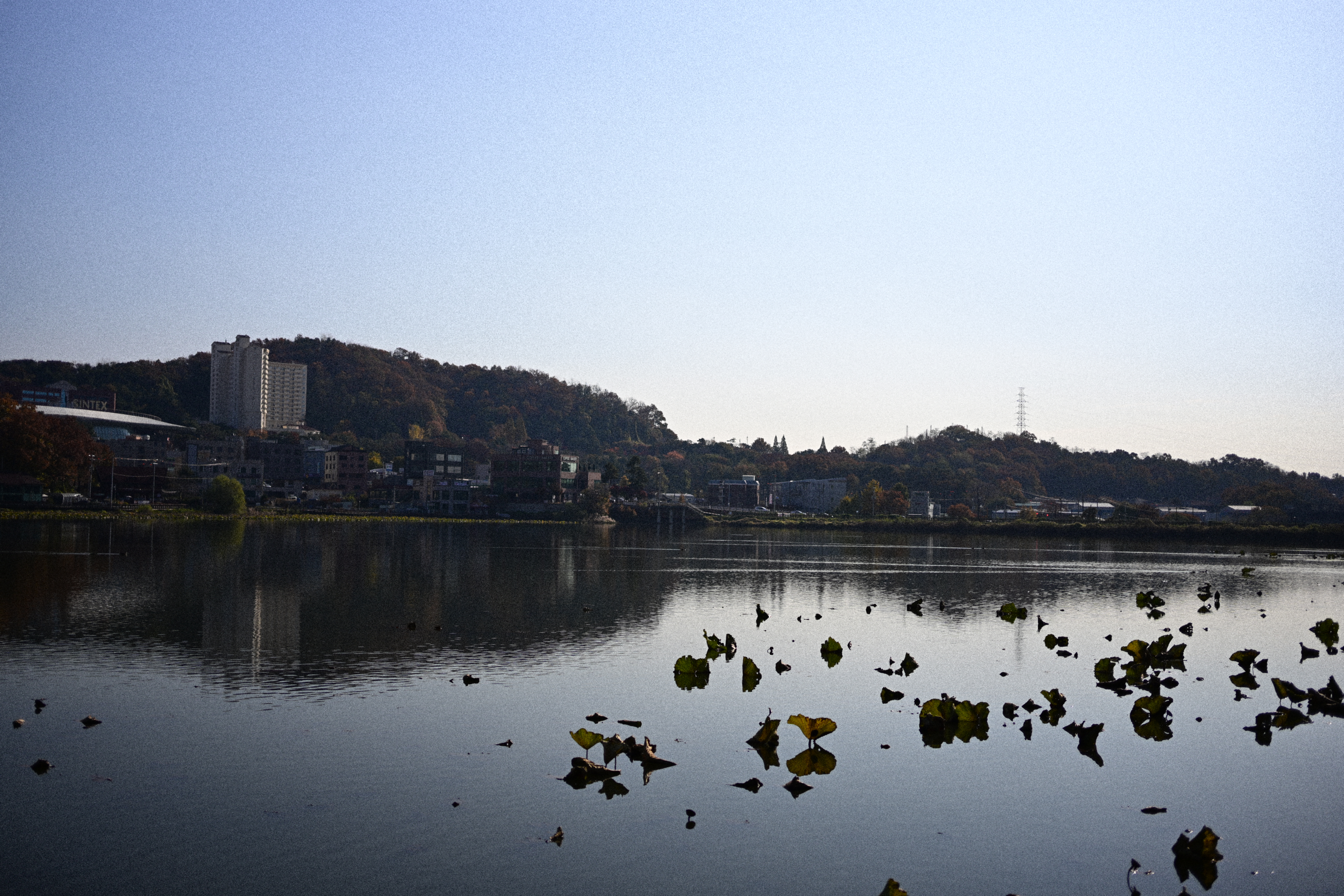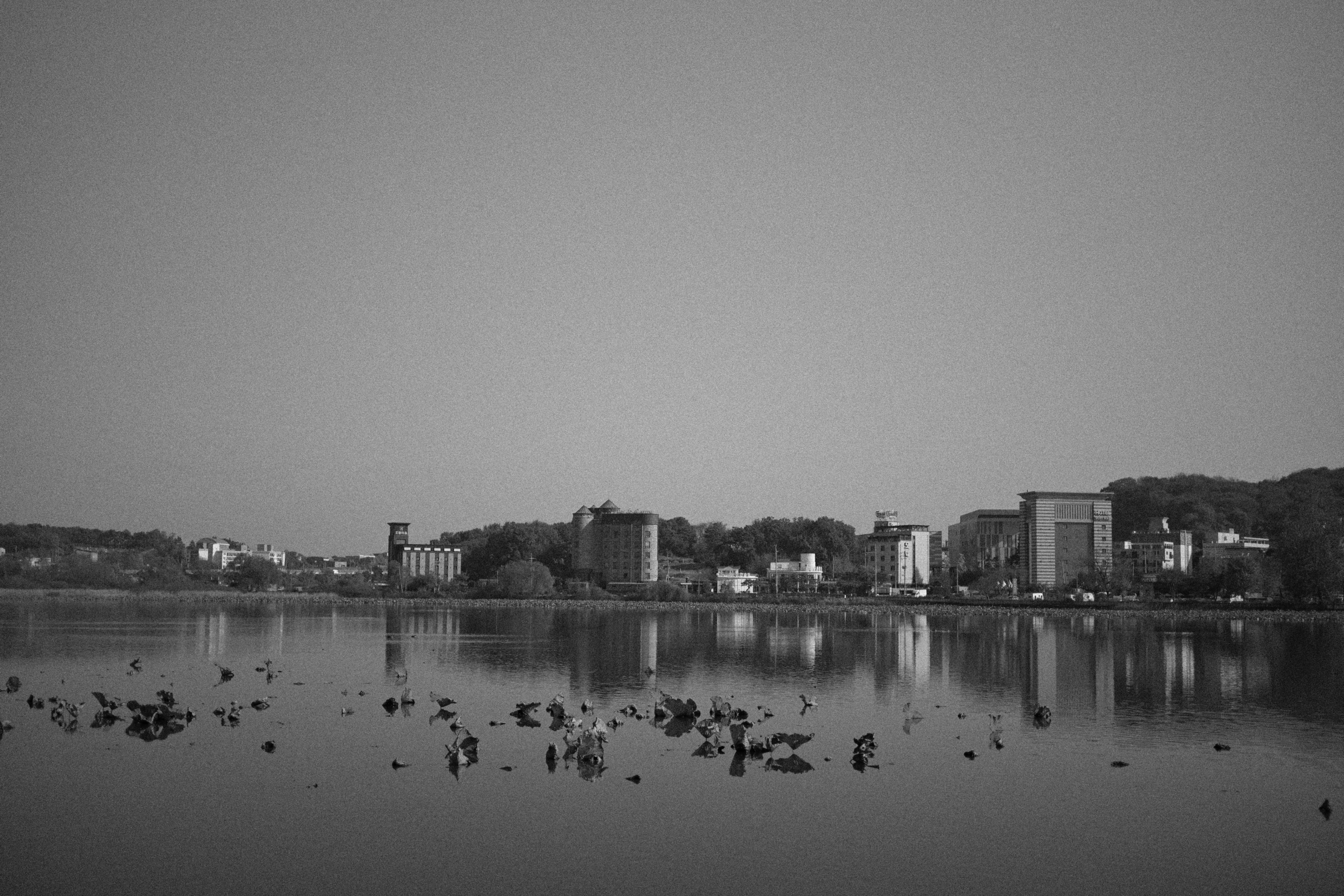 호수 앞에 서서 찍은 사진들도 비슷한 느낌이었다. 처음에는 컬러로 담아봤는데, 잔잔한 수면 위로 산과 건물들의 윤곽이 부드럽게 비쳐서 생각보다 단정한 장면이 나왔다. 멀리 있는 연잎들이 흩어져 있는 모습도 은근히 균형을 만들어주고, 전체적인 분위기가 차분하게 가라앉아 있어서 마음에 들었다. 특히 그레인이 은은하게 올라오니, 선명하기만 한 사진보다 오히려 시간이 더디게 흐르는 듯한 느낌까지 들었다.