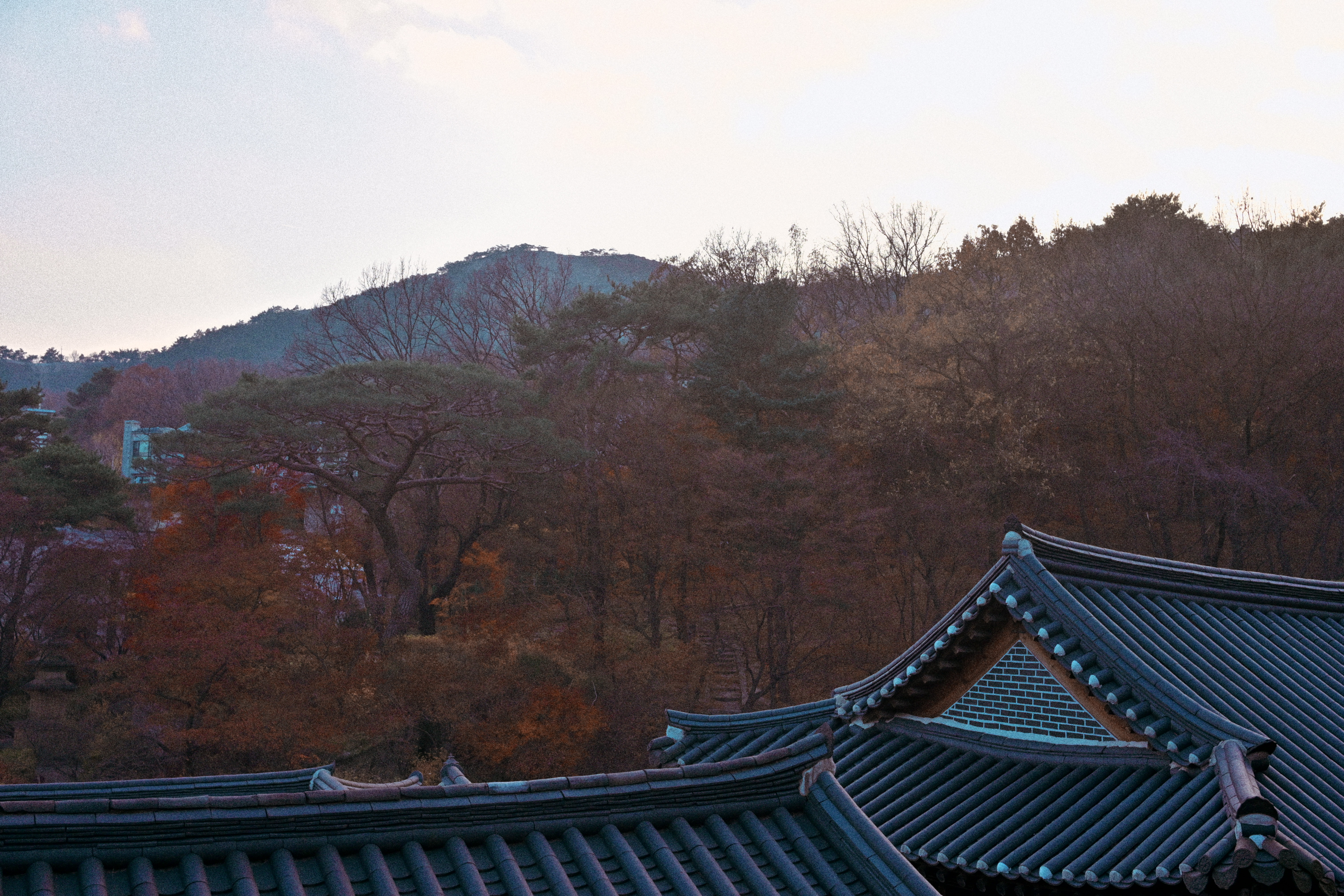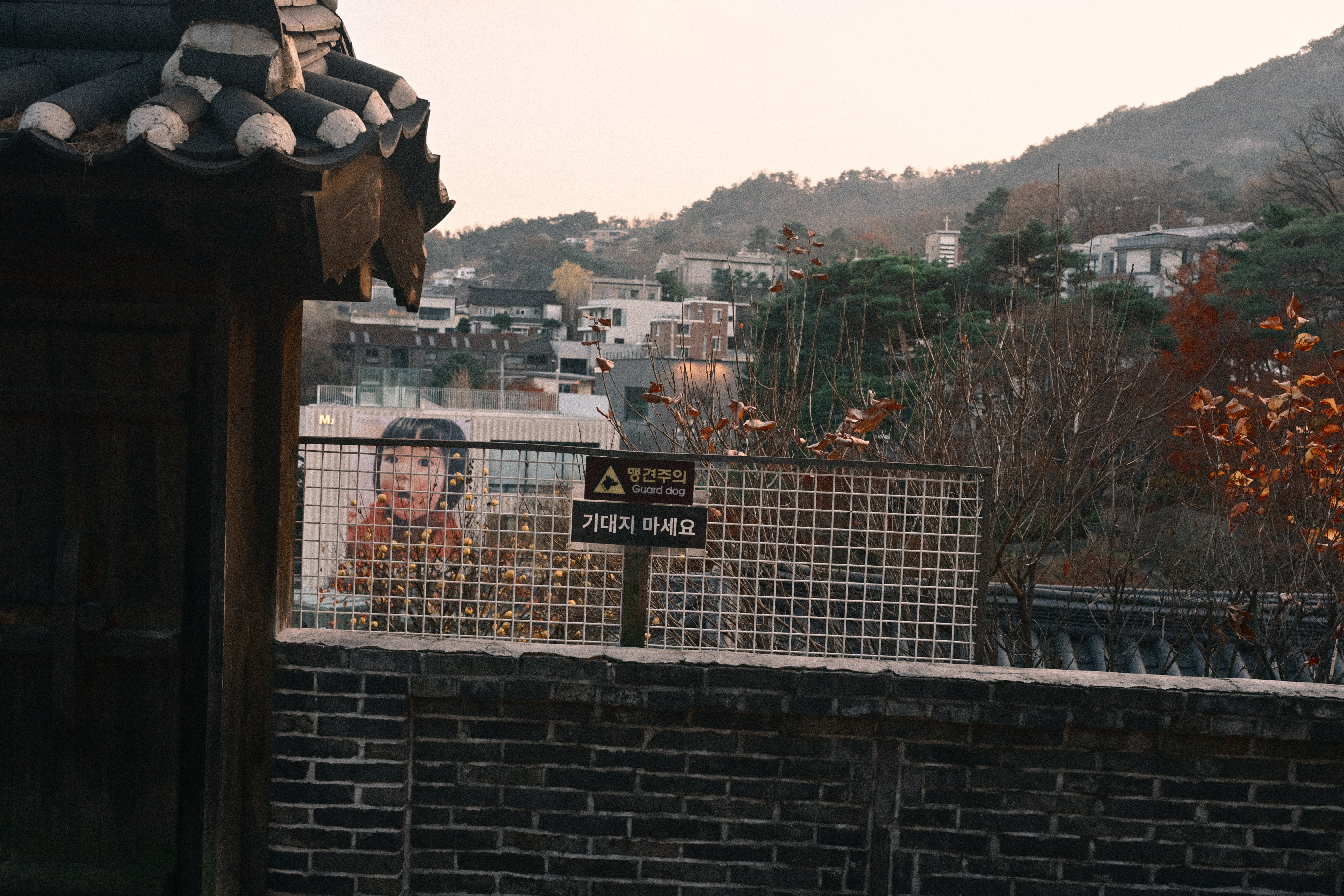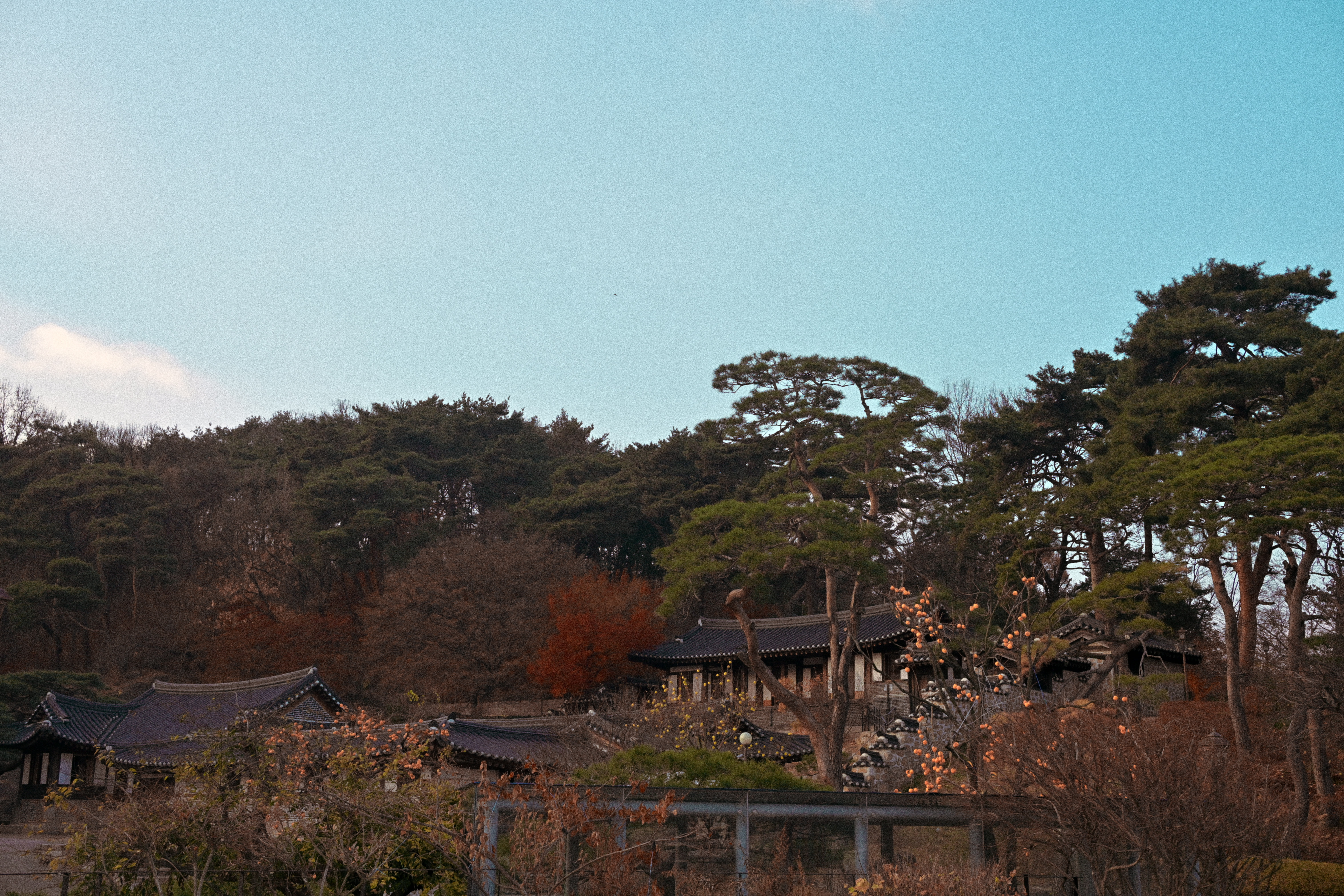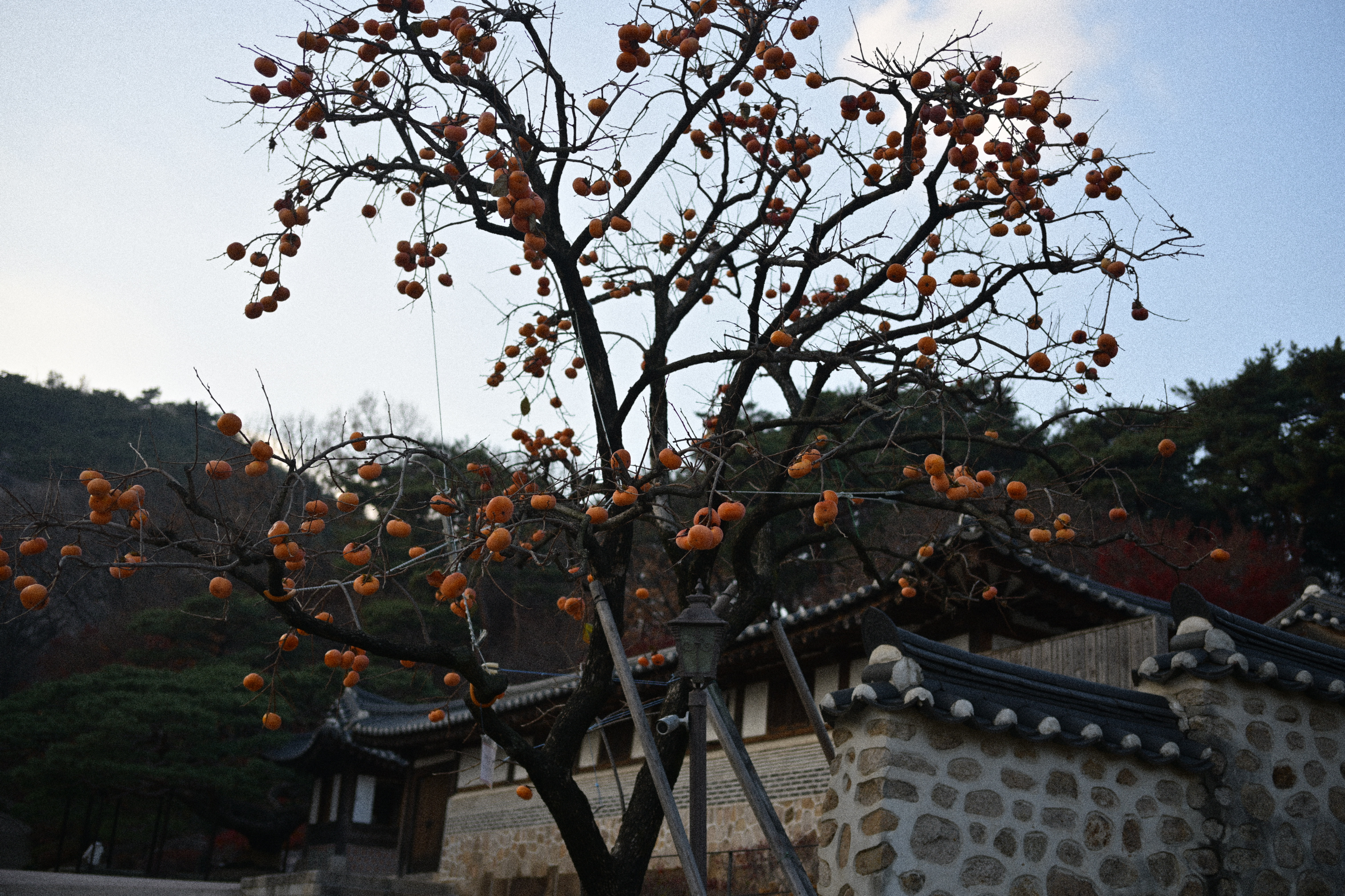 잎은 다 떨어졌는데, 감만 남았다. 제때 떠날 건 떠났고, 남은 것들만 가지에 매달려 있다. 보기엔 풍성하지만 실은 비어 있는 나무다. 감은 장식처럼 달려 있고, 계절은 이미 다음으로 넘어갈 준비를 끝냈다. 뒤편의 한옥과 담장은 오래된 풍경을 맡고 있지만, 그마저도 배경으로 밀려난다. 하늘은 맑지도 흐리지도 않다. 이 장면은 가을의 절정이 아니라, 남겨진 상태에 가깝다. 아름답다기보다는 정직하다. 남아 있는 것과 떠난 것이 분명하게 갈라진 시점이다.
