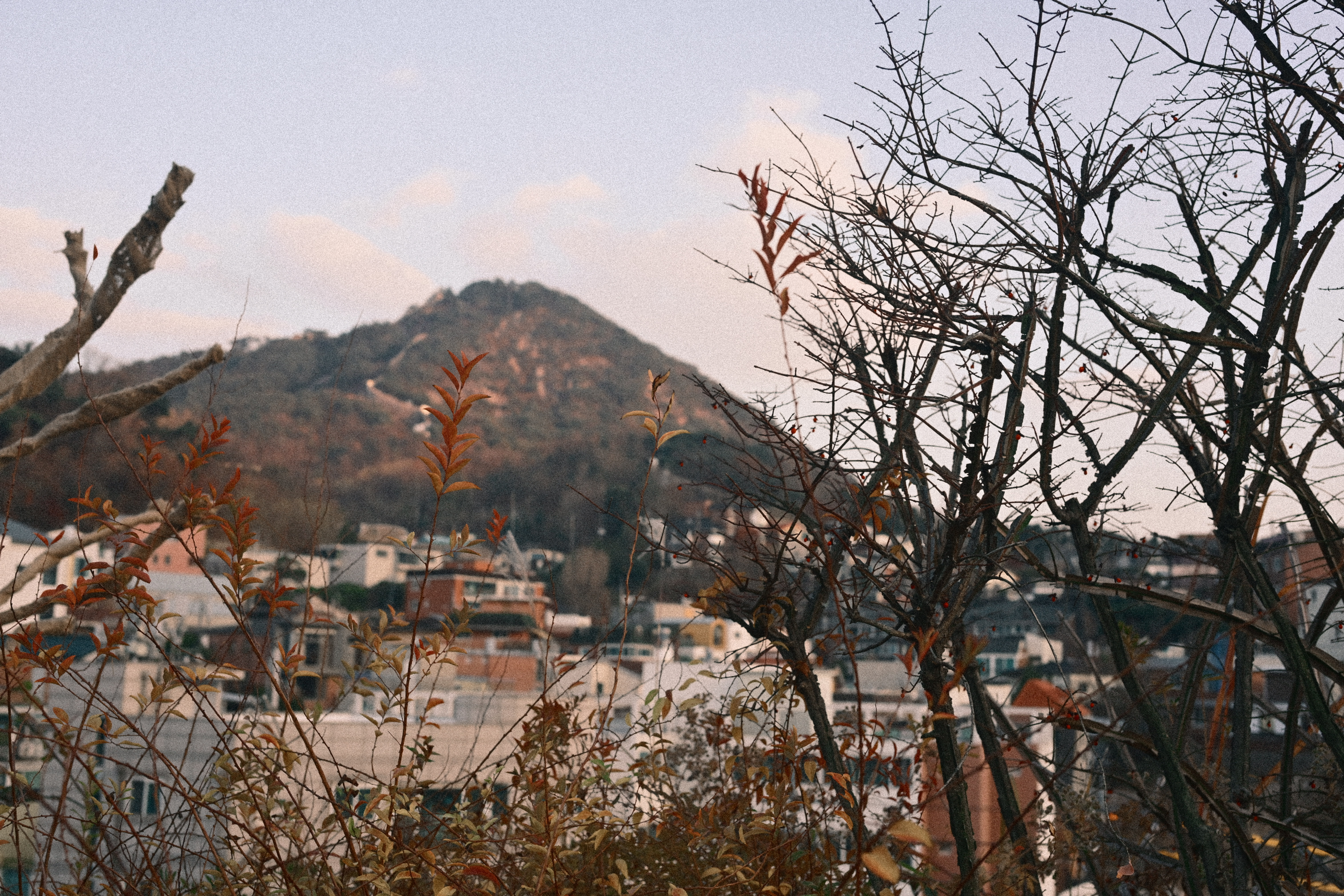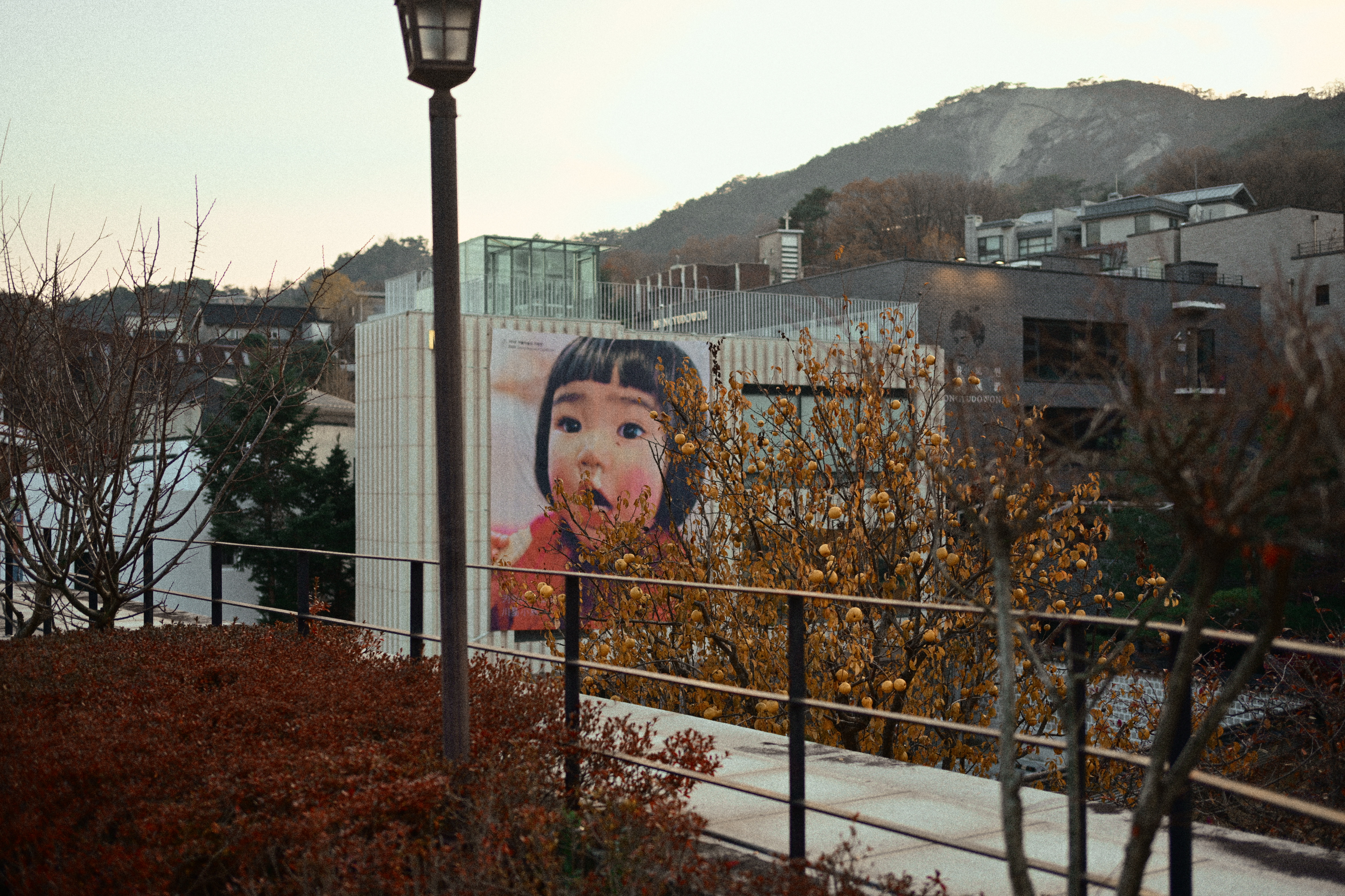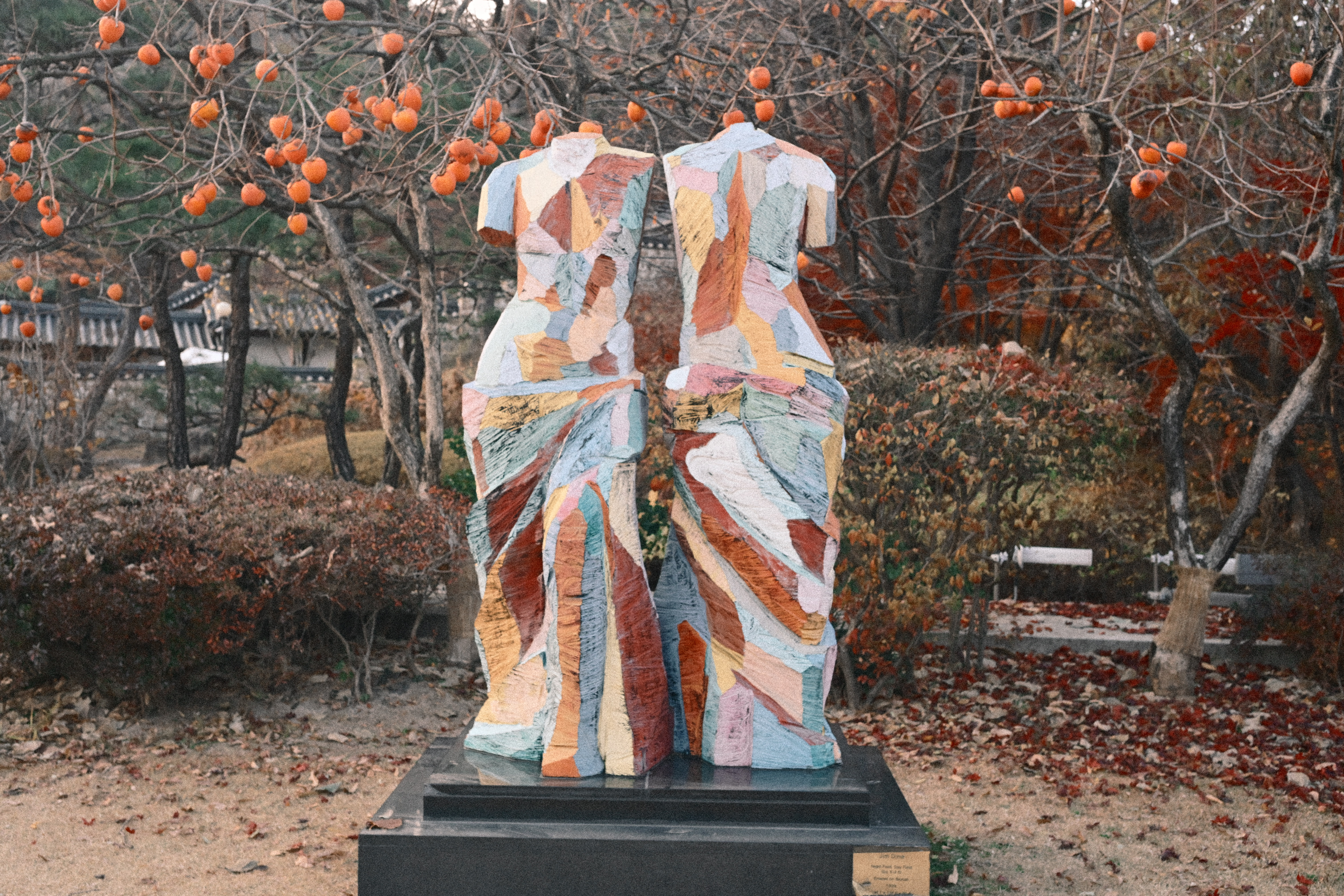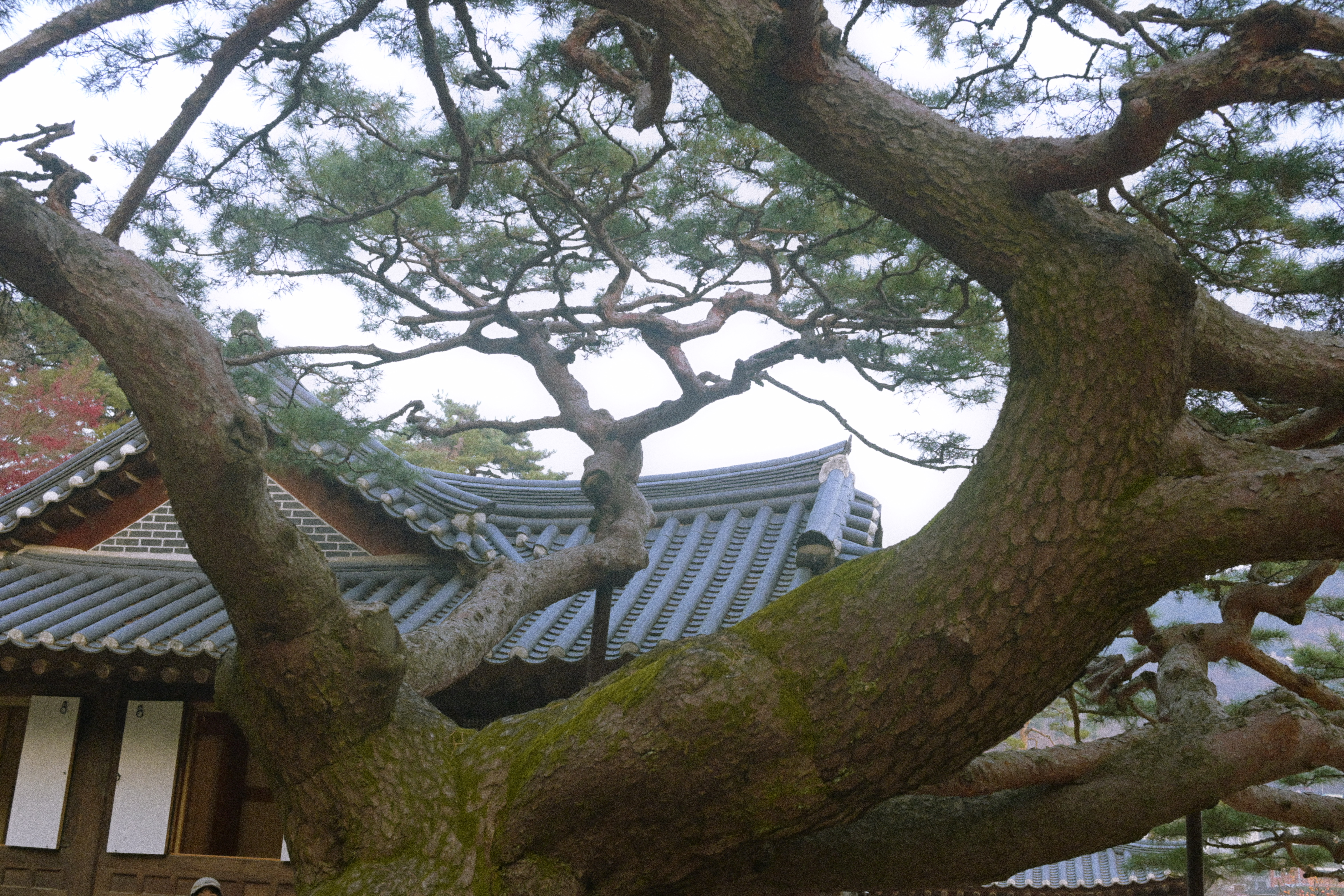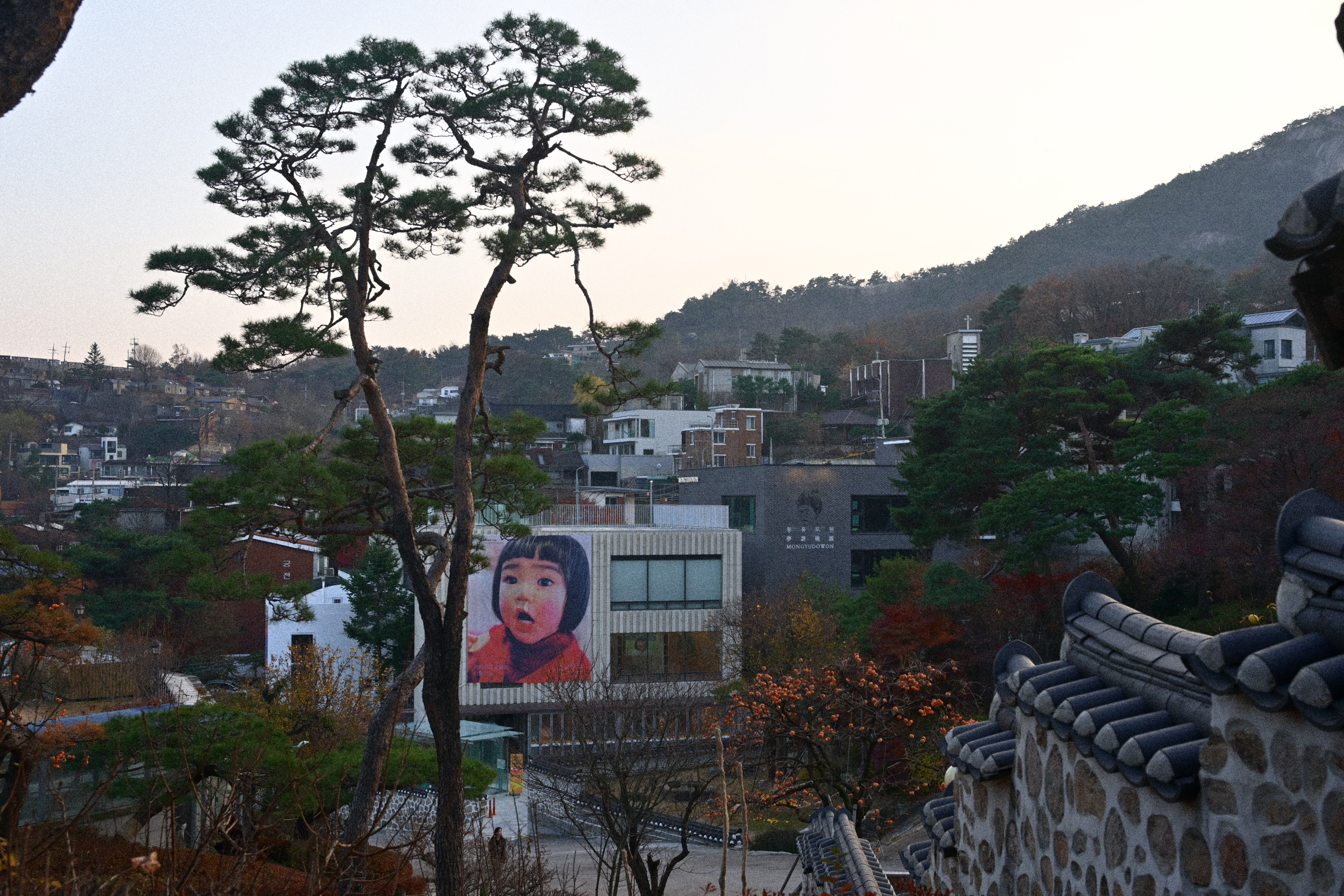 잎은 다 떨어졌는데, 감만 남았다. 제때 떠날 건 떠났고, 남은 것들만 가지에 매달려 있다. 보기엔 풍성하지만 실은 비어 있는 나무다. 감은 장식처럼 달려 있고, 계절은 이미 다음으로 넘어갈 준비를 끝냈다. 뒤편의 한옥과 담장은 오래된 풍경을 맡고 있지만, 그마저도 배경으로 밀려난다. 하늘은 맑지도 흐리지도 않다. 이 장면은 가을의 절정이 아니라, 남겨진 상태에 가깝다. 아름답다기보다는 정직하다. 남아 있는 것과 떠난 것이 분명하게 갈라진 시점이다.