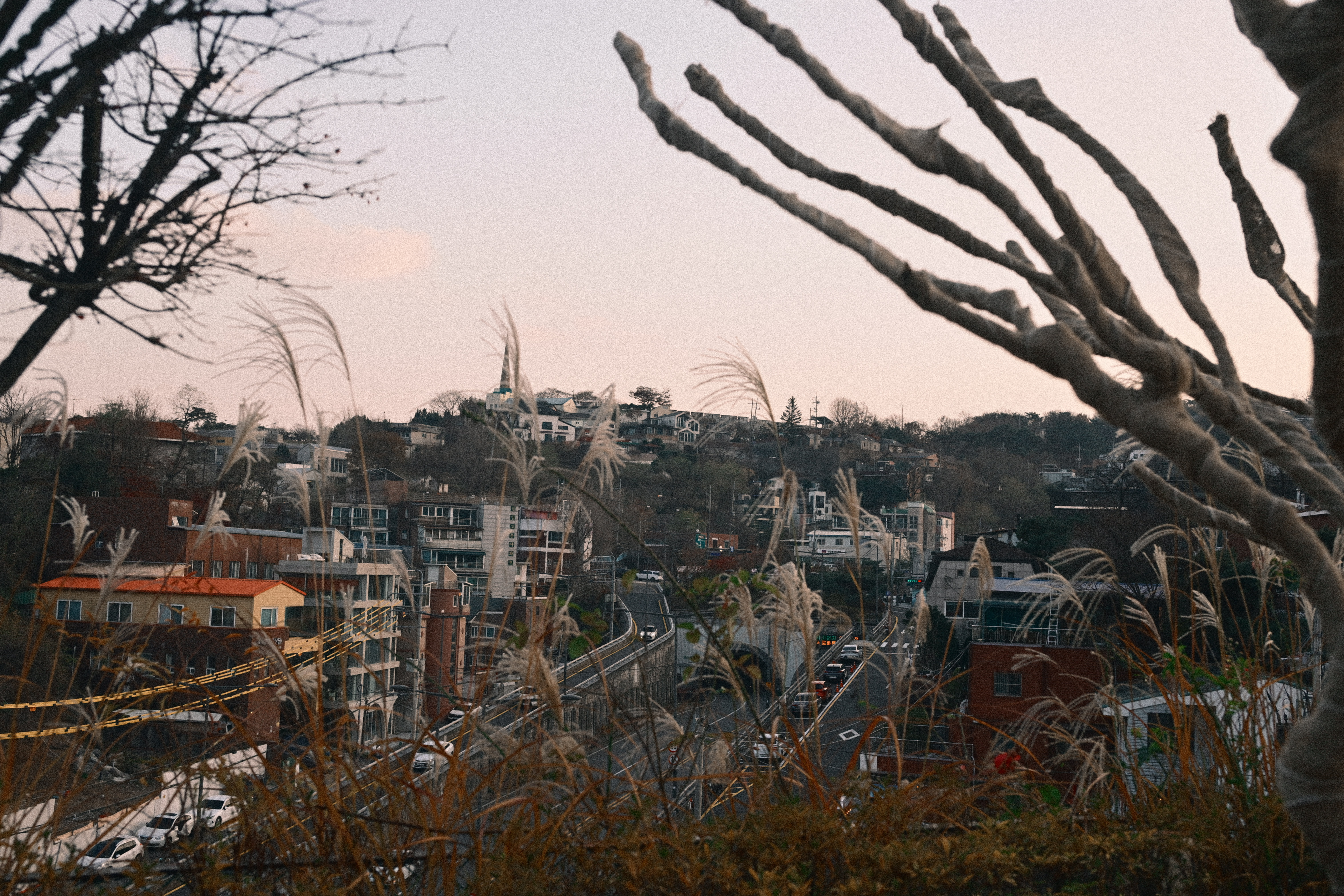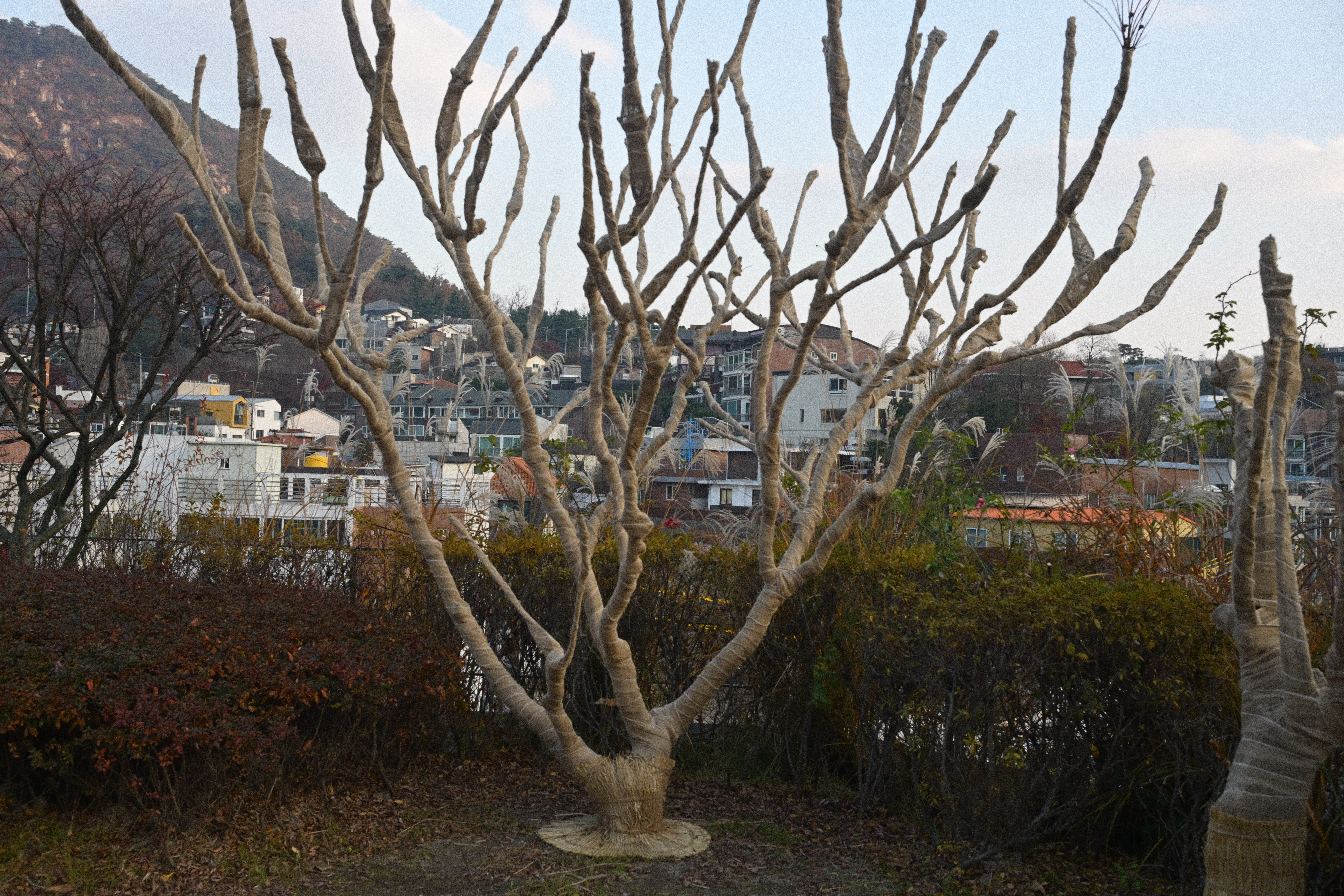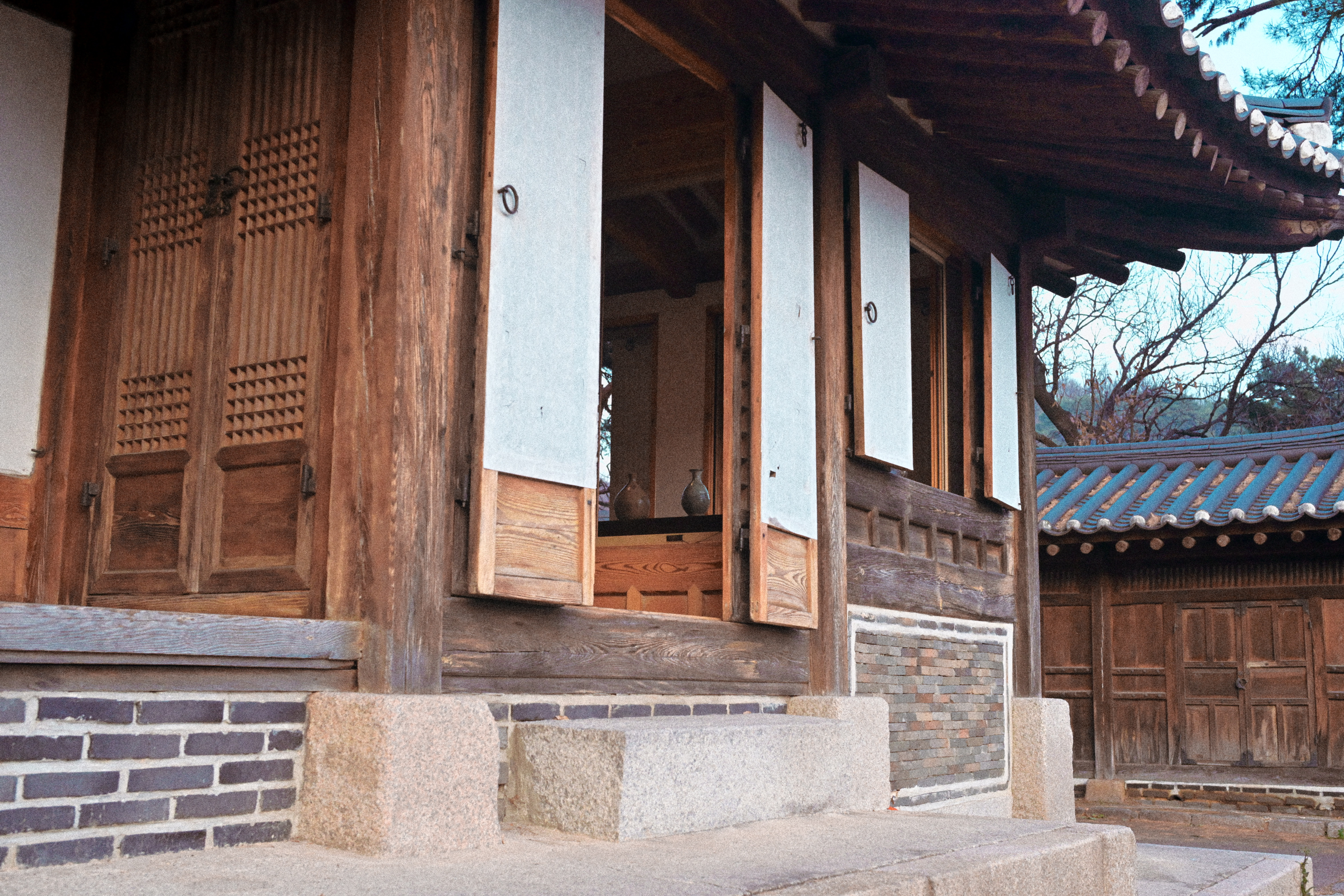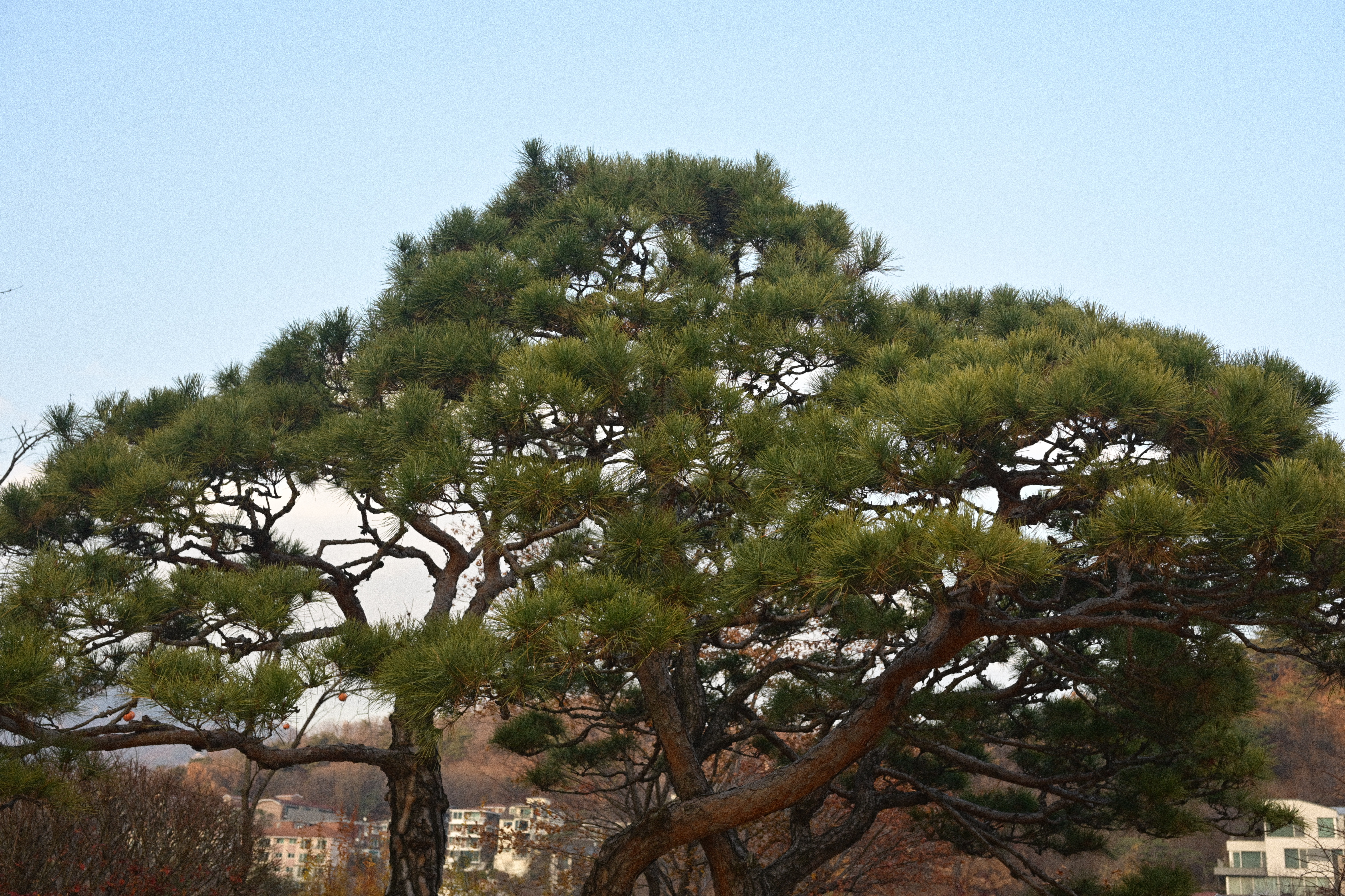 잎은 다 떨어졌는데, 감만 남았다. 제때 떠날 건 떠났고, 남은 것들만 가지에 매달려 있다. 보기엔 풍성하지만 실은 비어 있는 나무다. 감은 장식처럼 달려 있고, 계절은 이미 다음으로 넘어갈 준비를 끝냈다. 뒤편의 한옥과 담장은 오래된 풍경을 맡고 있지만, 그마저도 배경으로 밀려난다. 하늘은 맑지도 흐리지도 않다. 이 장면은 가을의 절정이 아니라, 남겨진 상태에 가깝다. 아름답다기보다는 정직하다. 남아 있는 것과 떠난 것이 분명하게 갈라진 시점이다.