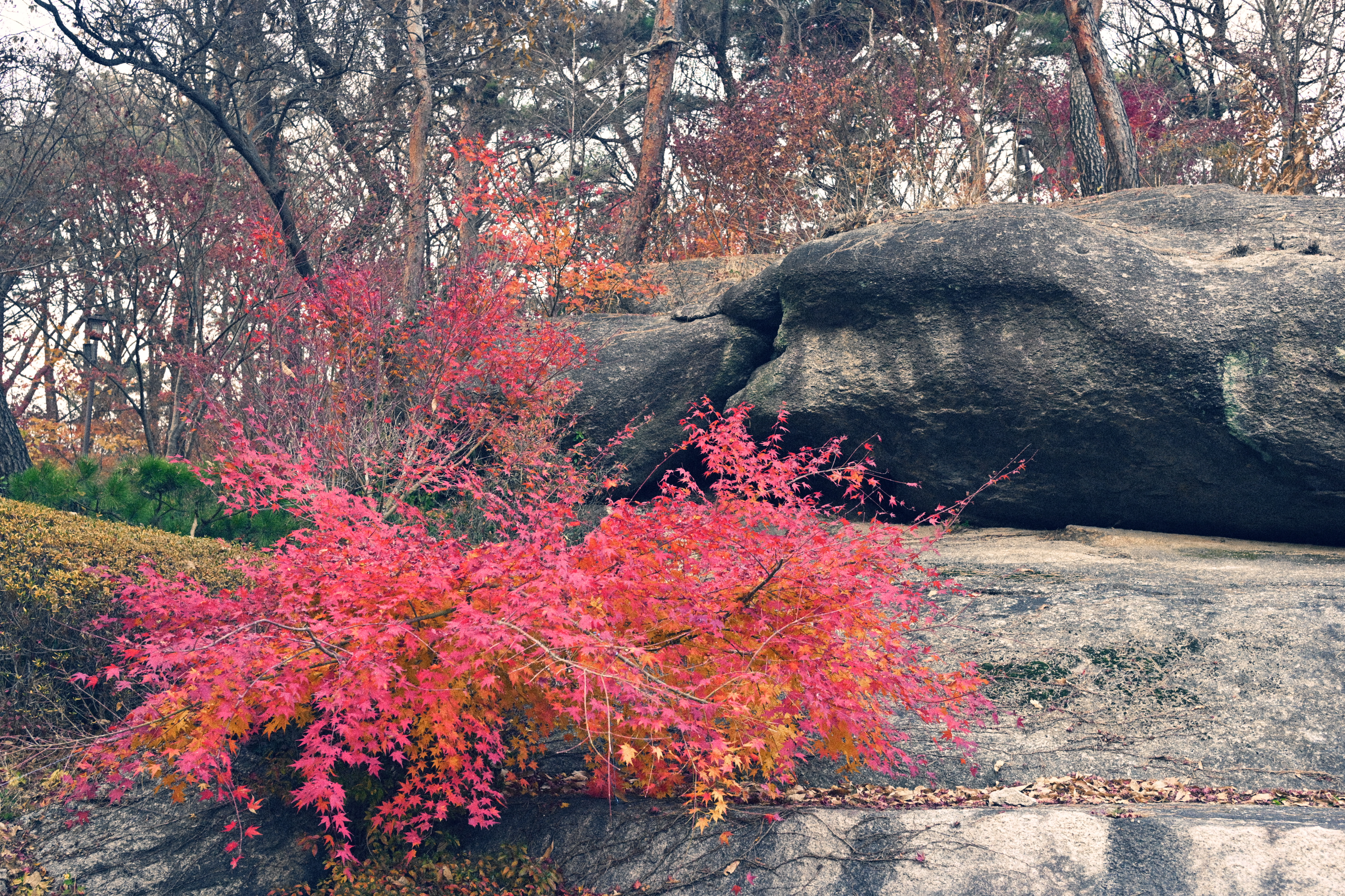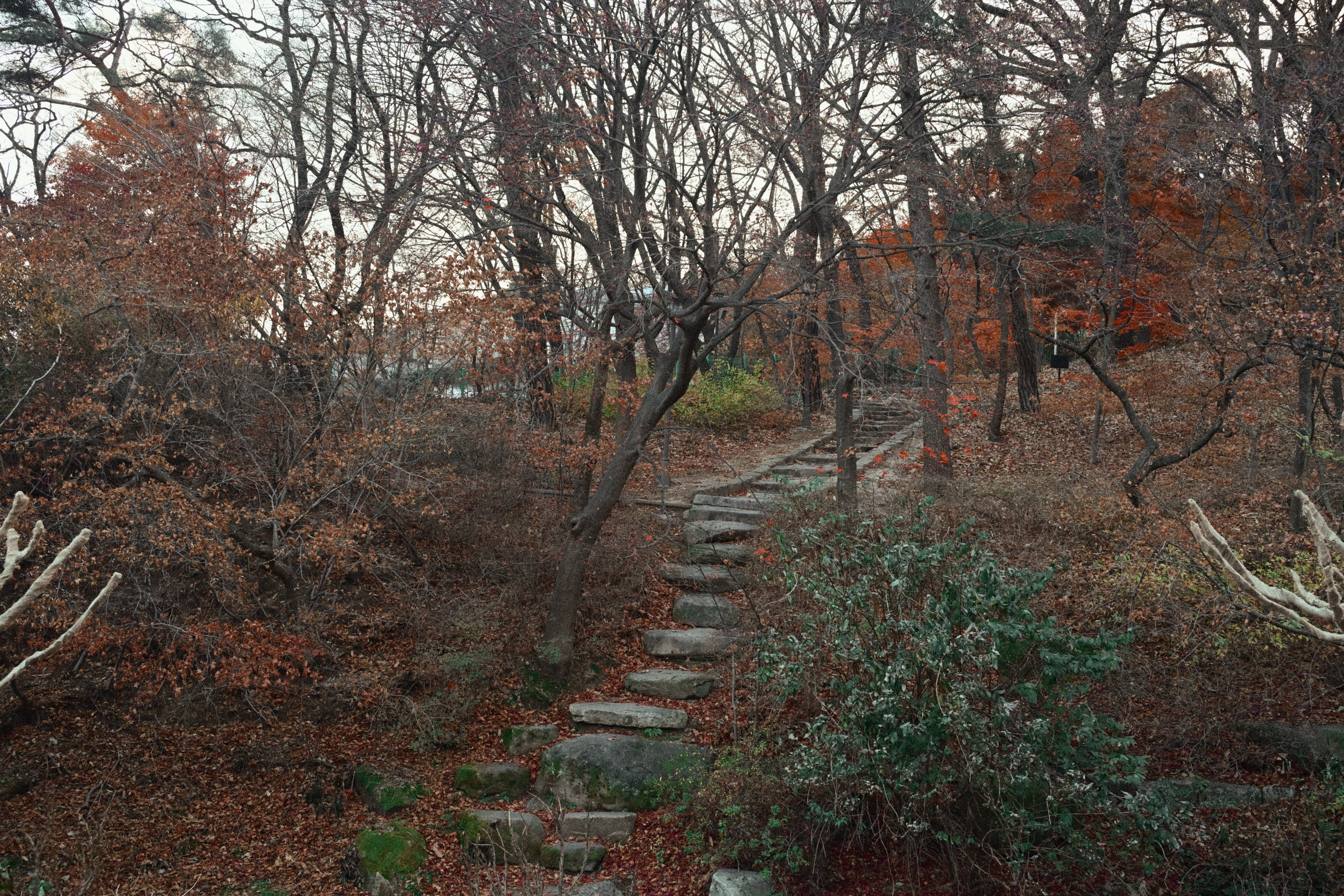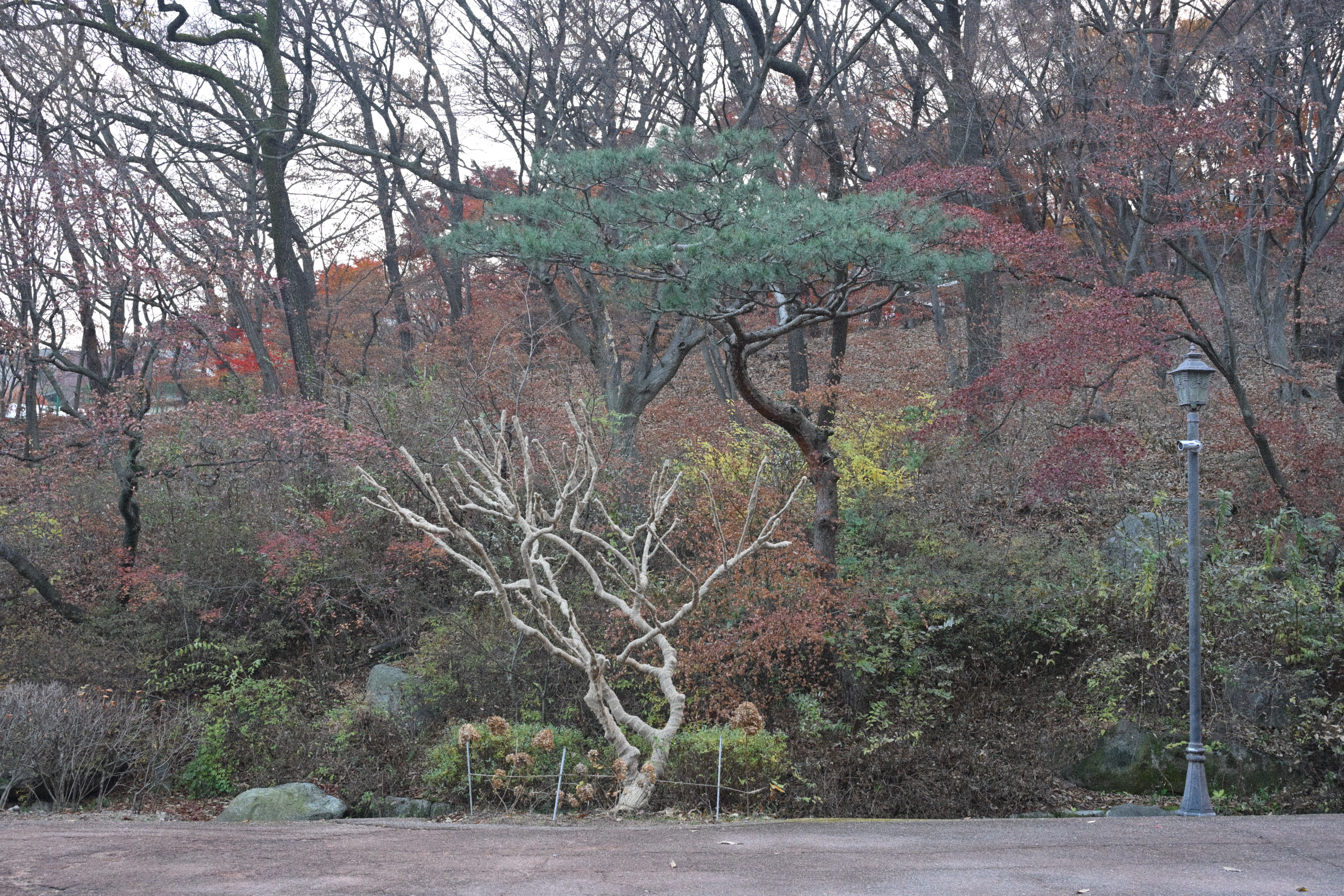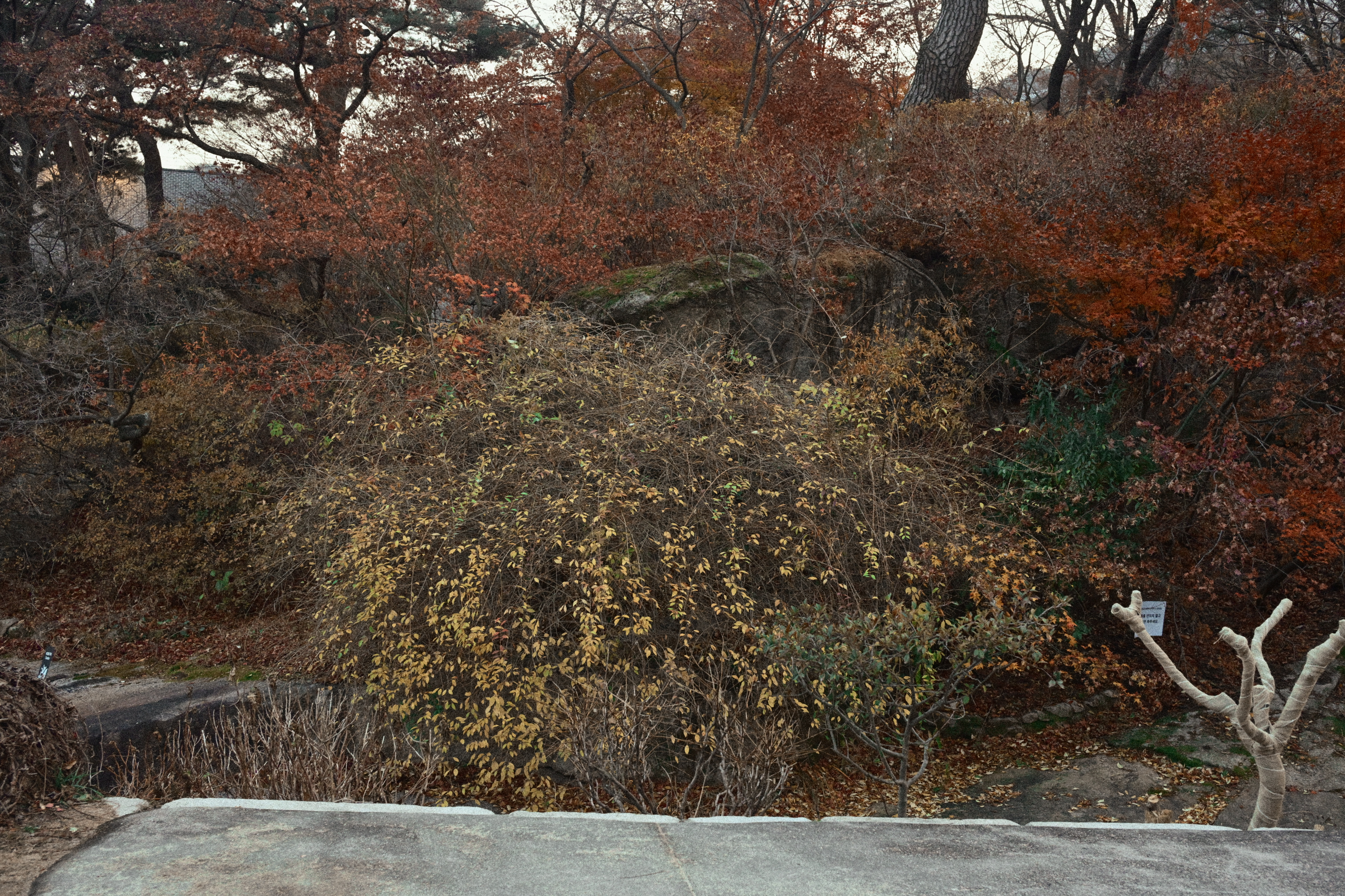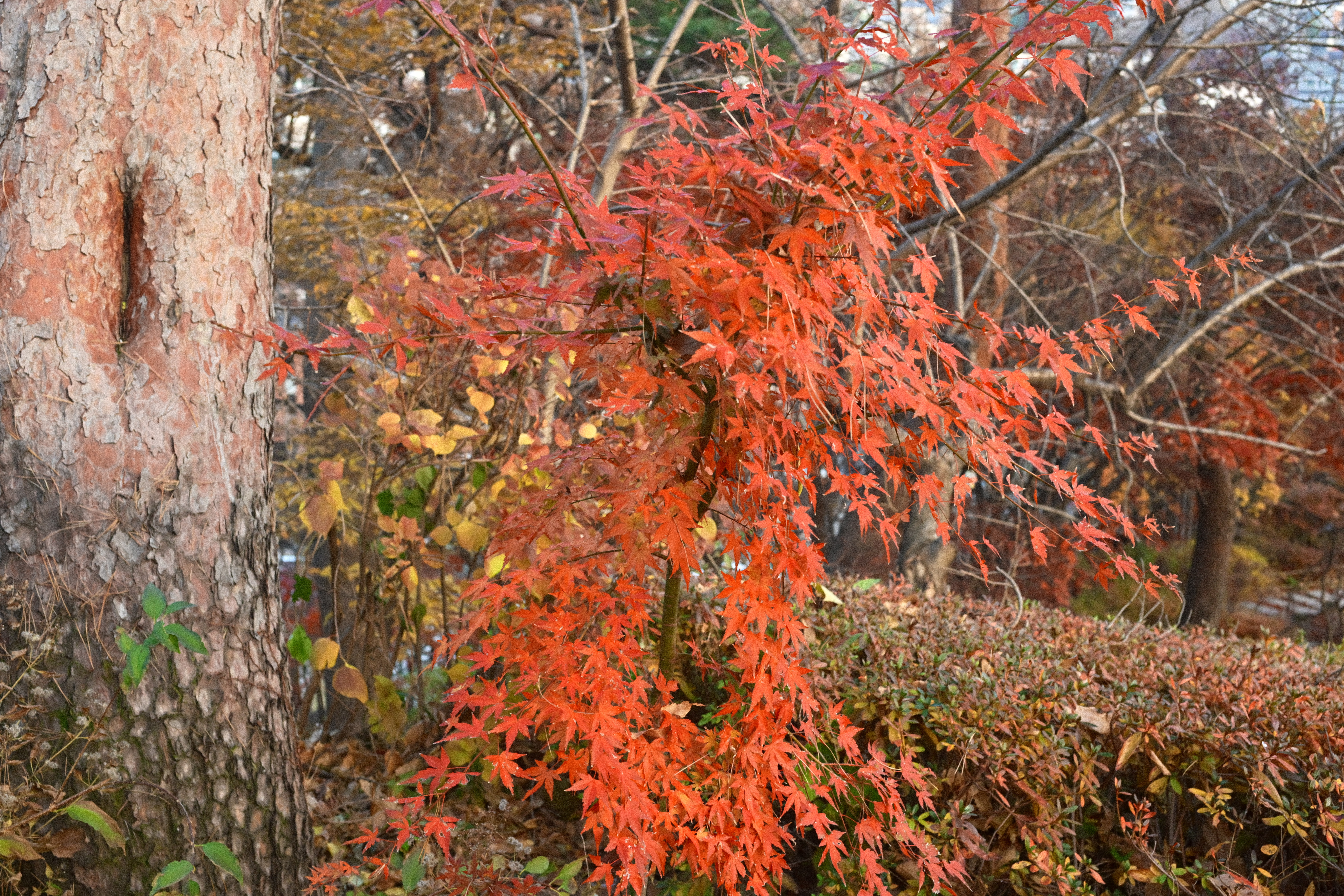 니콘 ZF로 찍은 사진이다. 니콘 ZF로 찍은 사진답게 색을 과하게 밀어 올리지 않는다. 가을에 물든 단풍나무가 가득 채우고 있다. 잎은 노랑에서 주황, 붉은색까지 자연스럽게 번지며 계절의 변화를 보여준다. 가지 사이로는 배경의 나무들과 희미한 건물 윤곽이 보이고, 전체적으로는 도심 속 작은 숲 같은 분위기다. 빛은 강하지 않고 부드러워 색이 과하지 않게 정리되어 있다. 늦가을 초입, 혹은 절정 직전의 풍경에 가깝다. 니콘을 쓰면서 가장 편한 지점은 바로 이 부분이다. 노랑은 노랑대로, 붉은색은 붉은색대로 서로를 침범하지 않고 각자 자리를 지킨다. 대비를 세게 주지 않아도 단풍의 층이 자연스럽게 드러나고, 화면 전체가 부담 없이 정리된다.