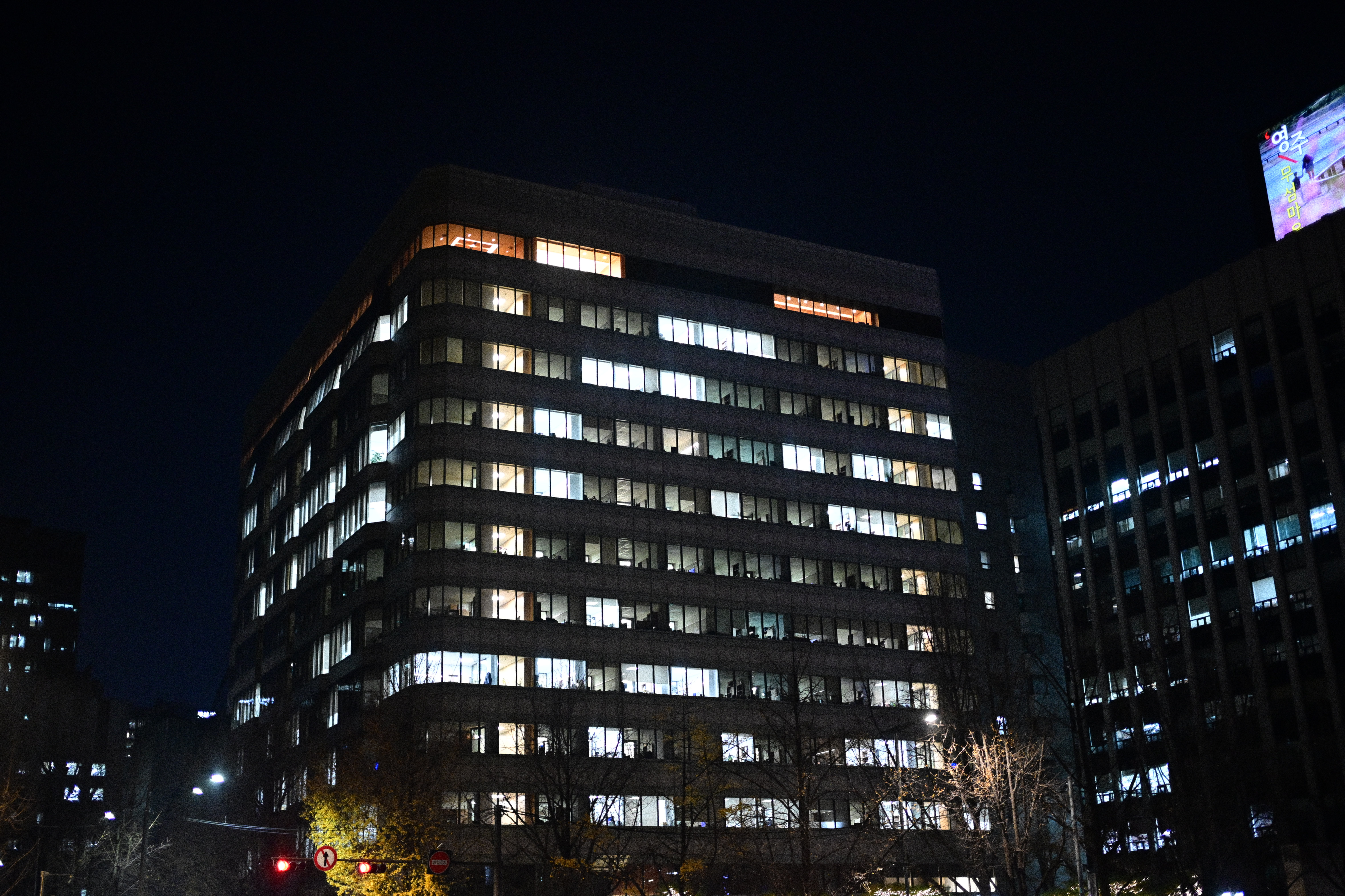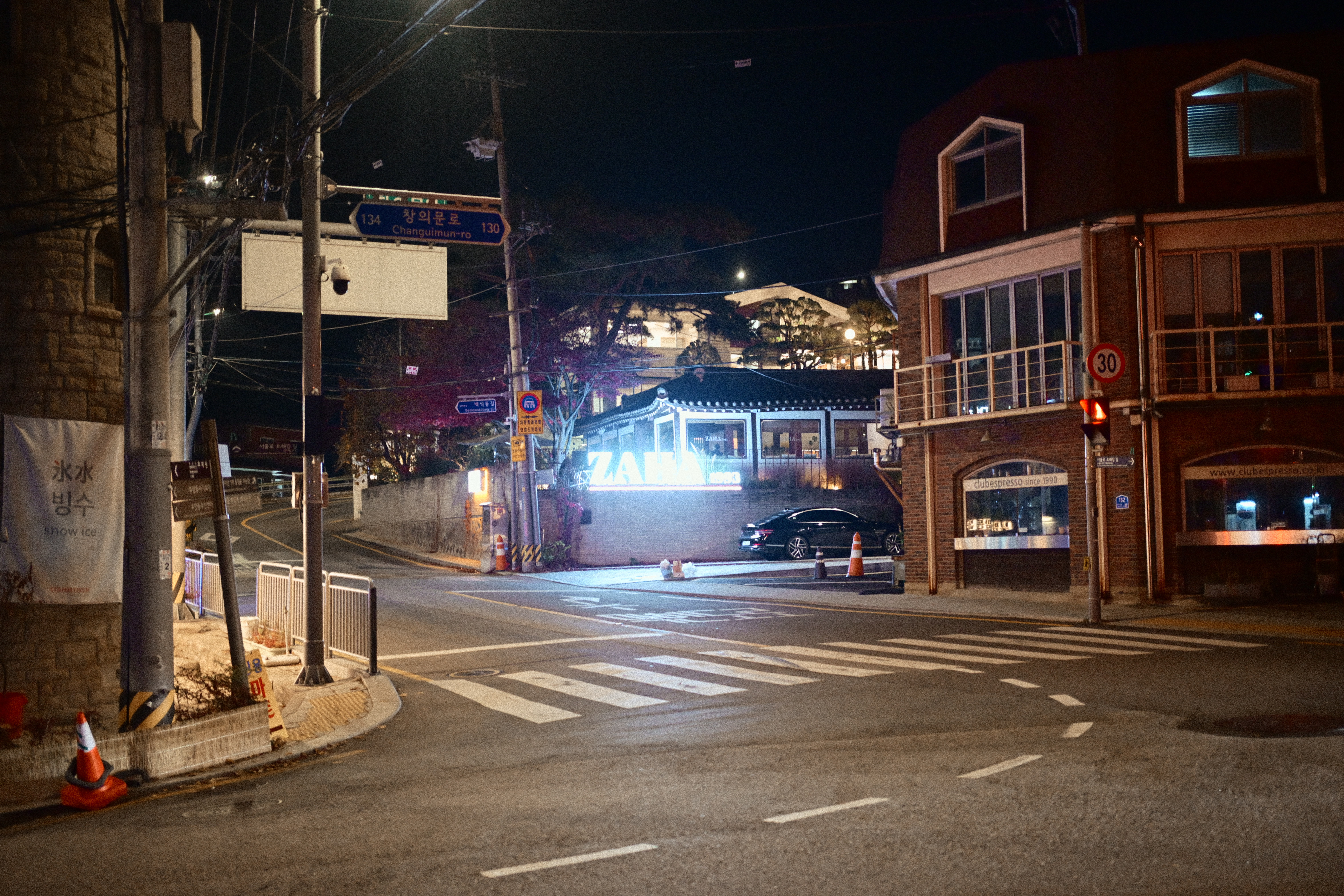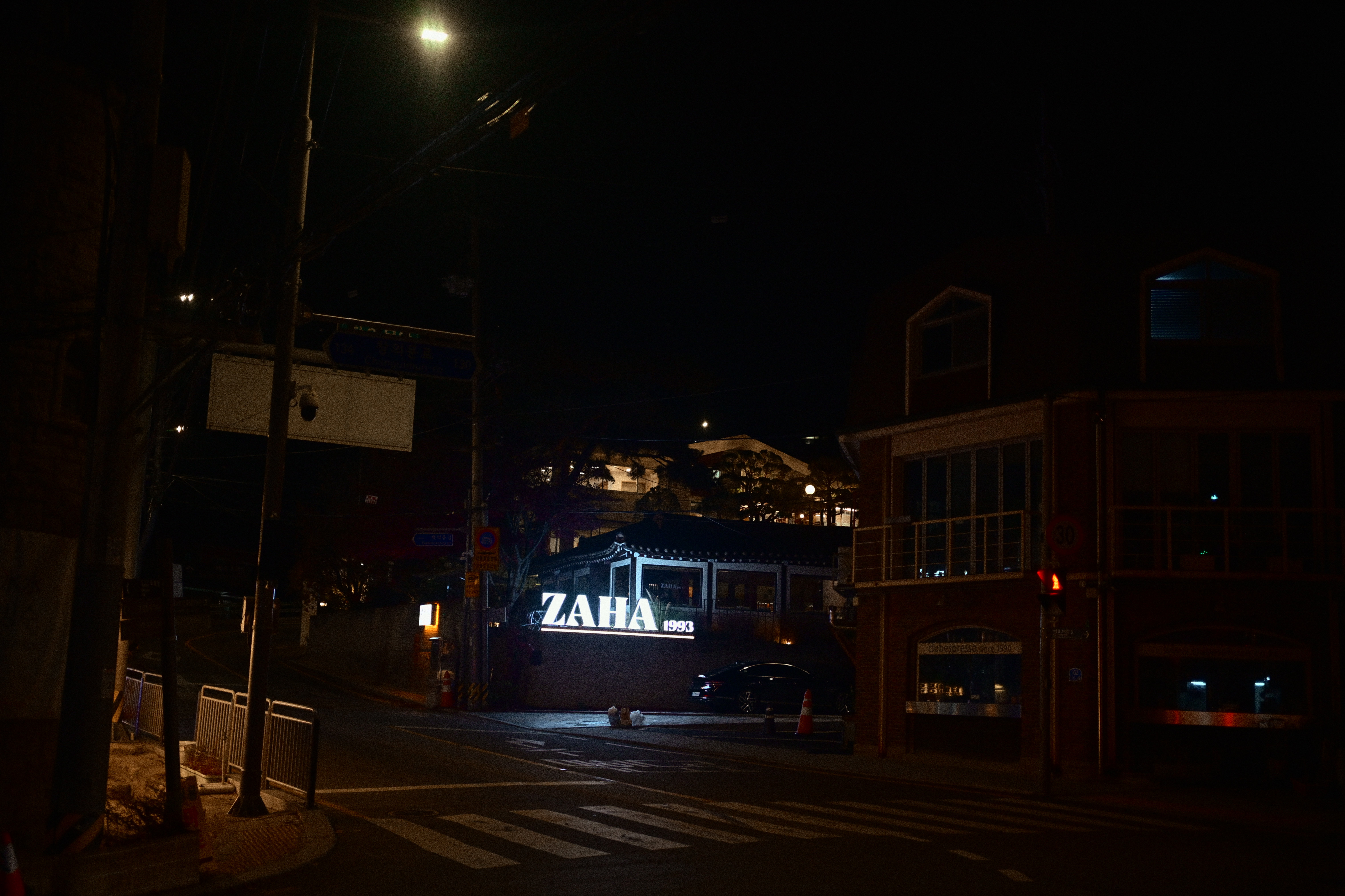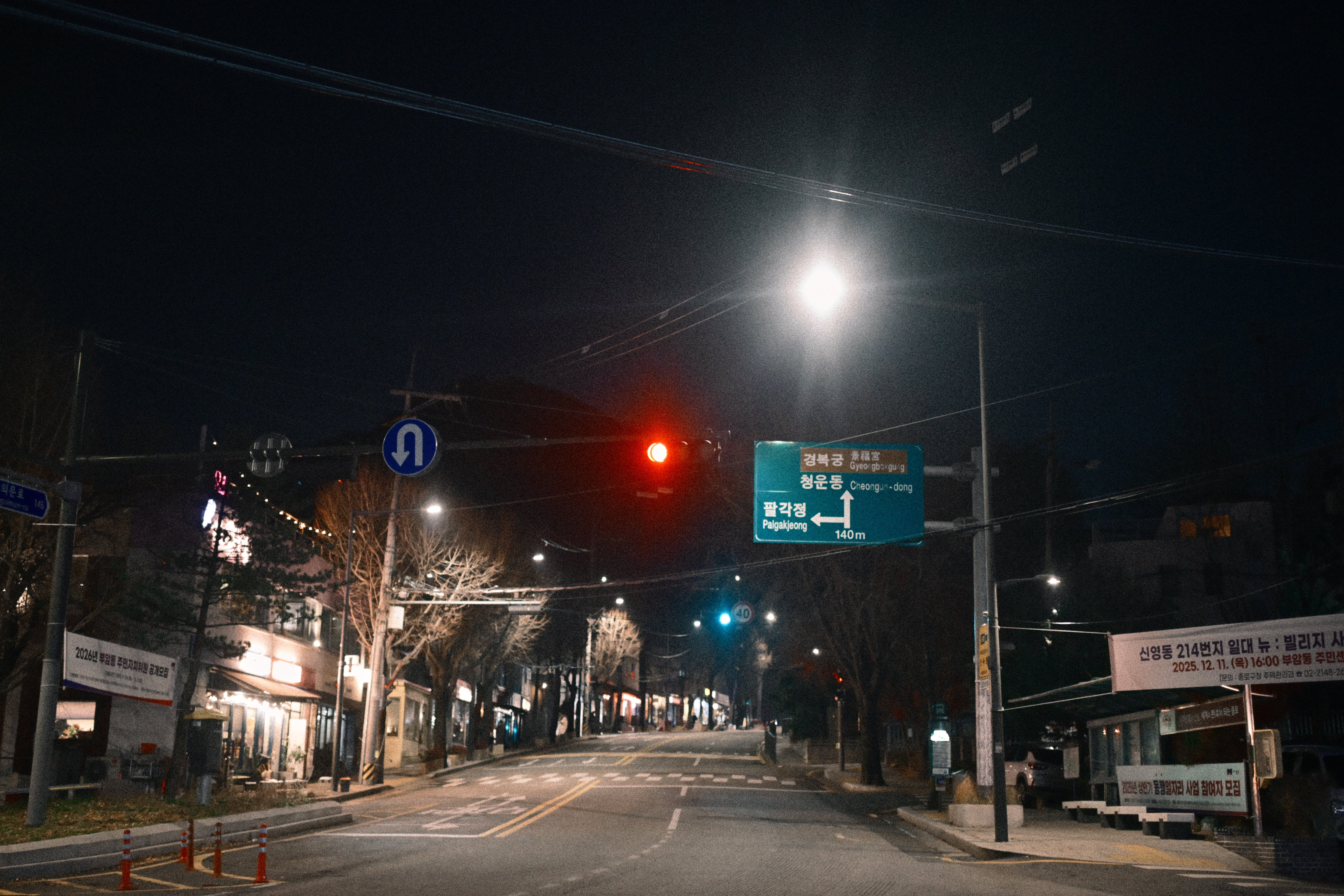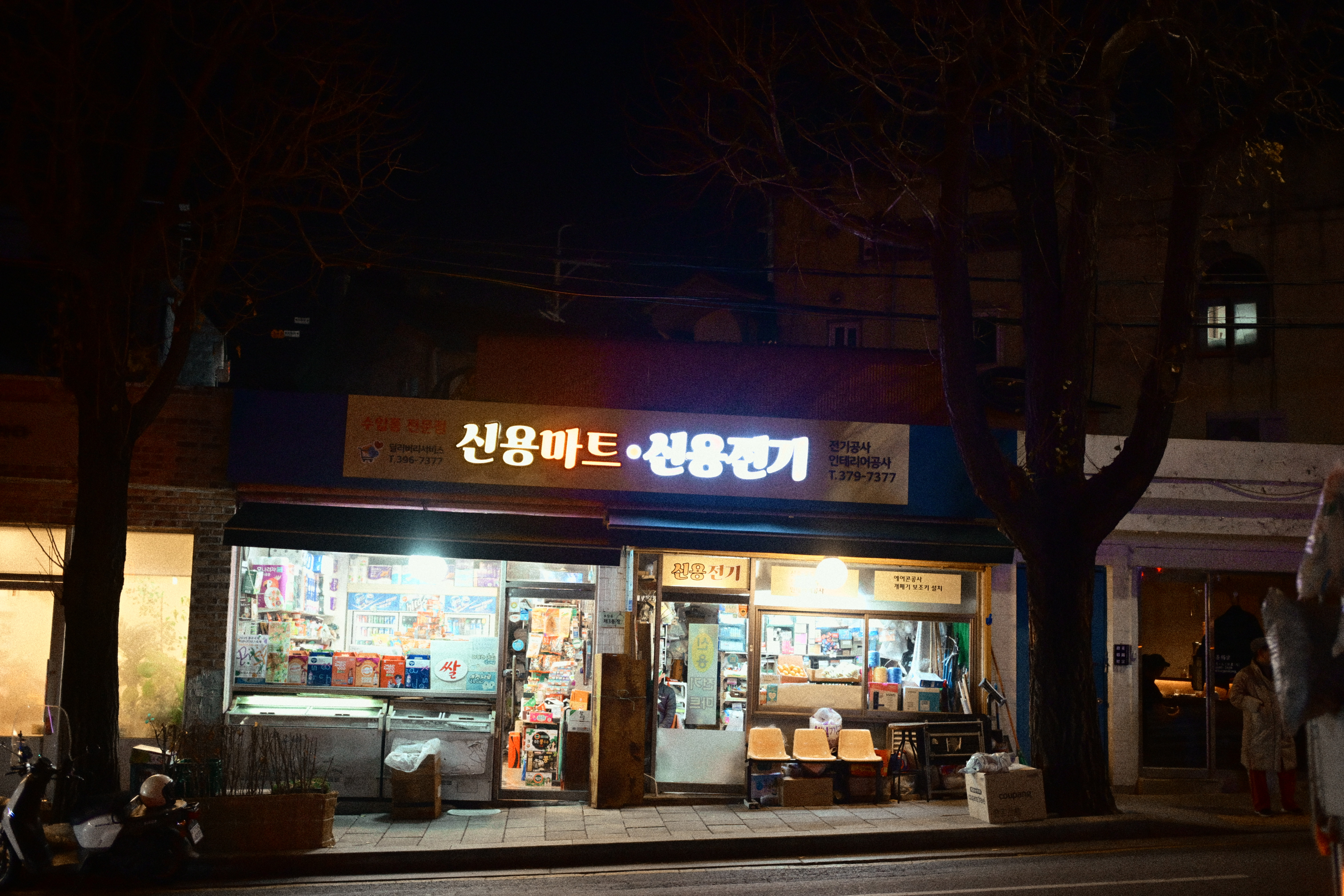 나무를 보아도 되고, 간판을 보아도 되고, 닫힌 문을 보아도 된다. 시선의 선택은 관람자에게 맡겨진다. 그래서 이 사진은 빨리 소비되지 않는다. 머무는 만큼만 말한다. 그래서 이렇게 남는다. 눈에 띄지 않게, 그러나 오래. 지나가고 나서야 다시 떠오르는 밤처럼.