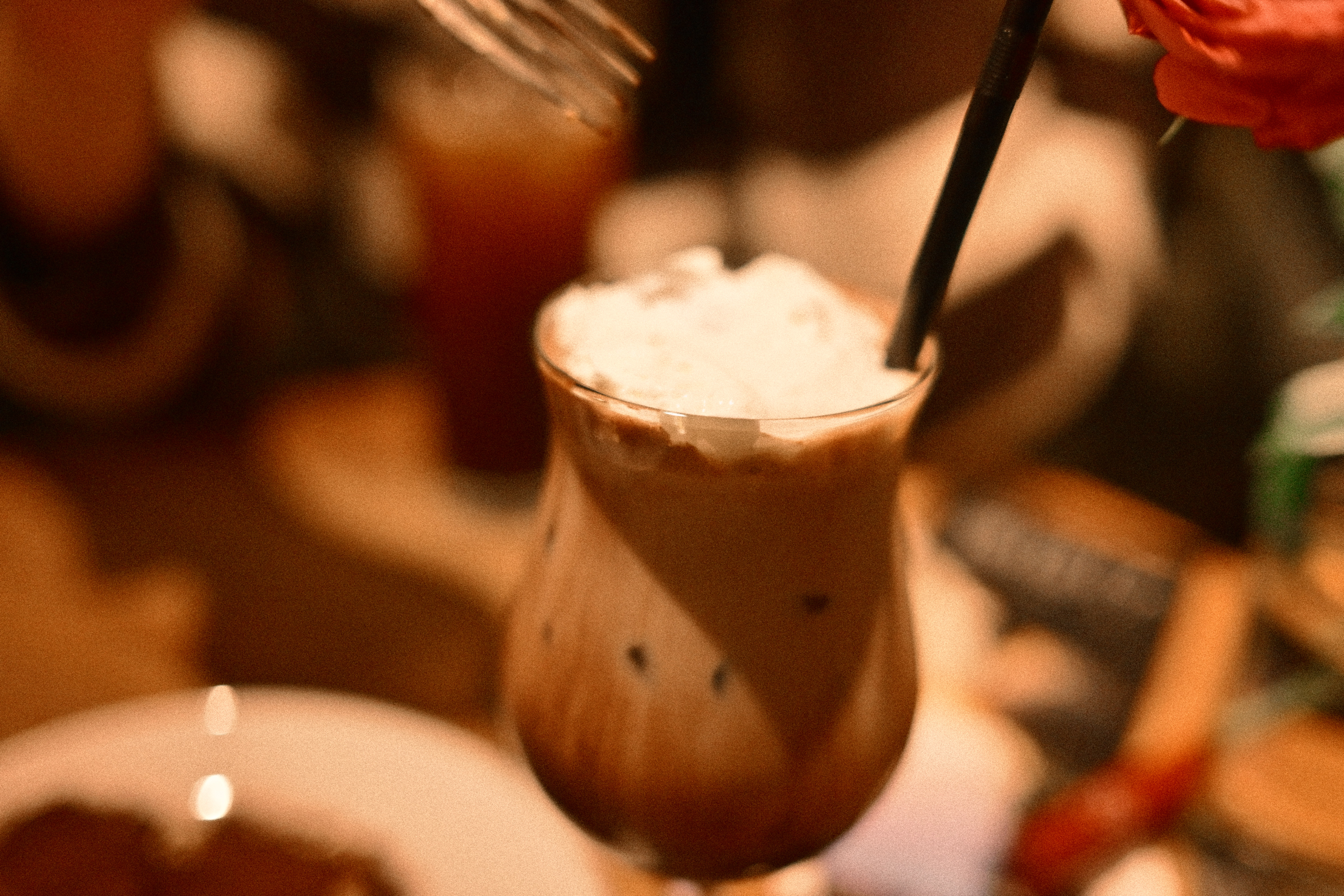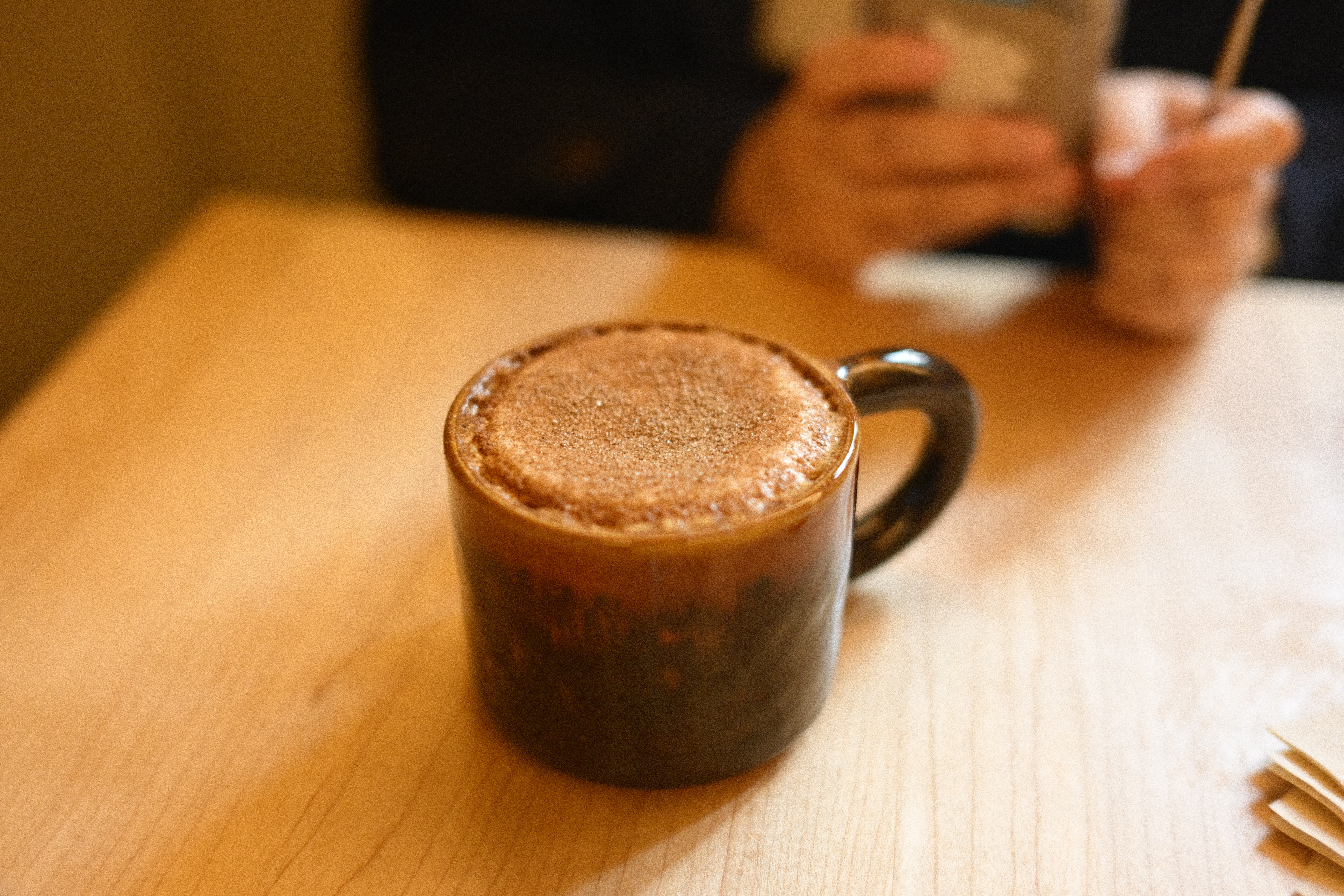 두 번째 사진은 전체적으로 따뜻한 톤이 강하다. 니콘 색감의 또다른 면모가 드러난다. 테이블의 나뭇결과 컵의 갈색이 노란 기를 많이 머금고 있고, 그림자도 차갑게 떨어지지 않는다. 조명이 조금 더 스며든 느낌이라 카페의 실내 온도가 더 따스하게 전달된다. 커피 거품은 부드럽고, 질감보다는 분위기가 먼저 보인다. 편안하고 감정적인 쪽에 가까운 색이다.