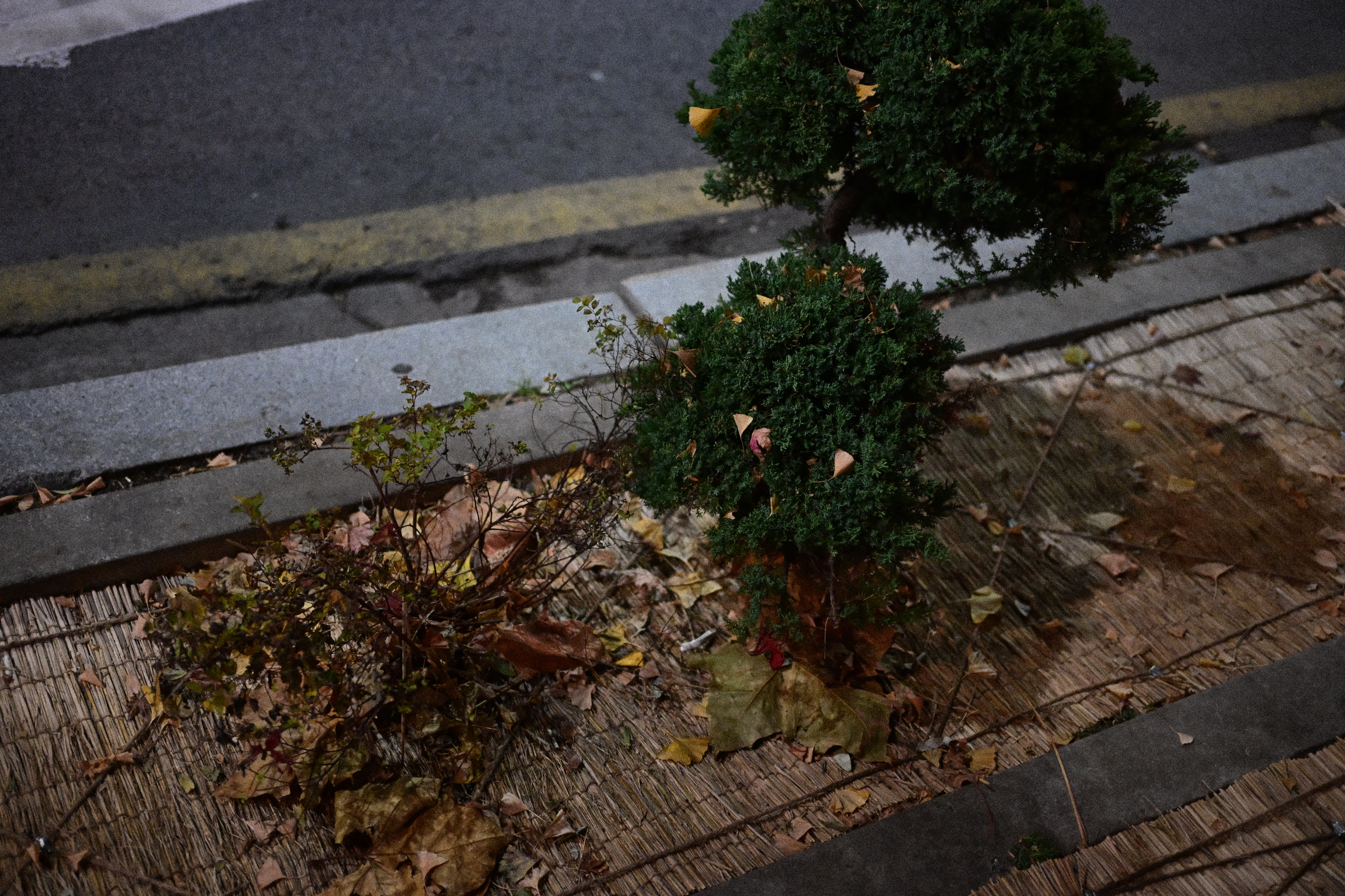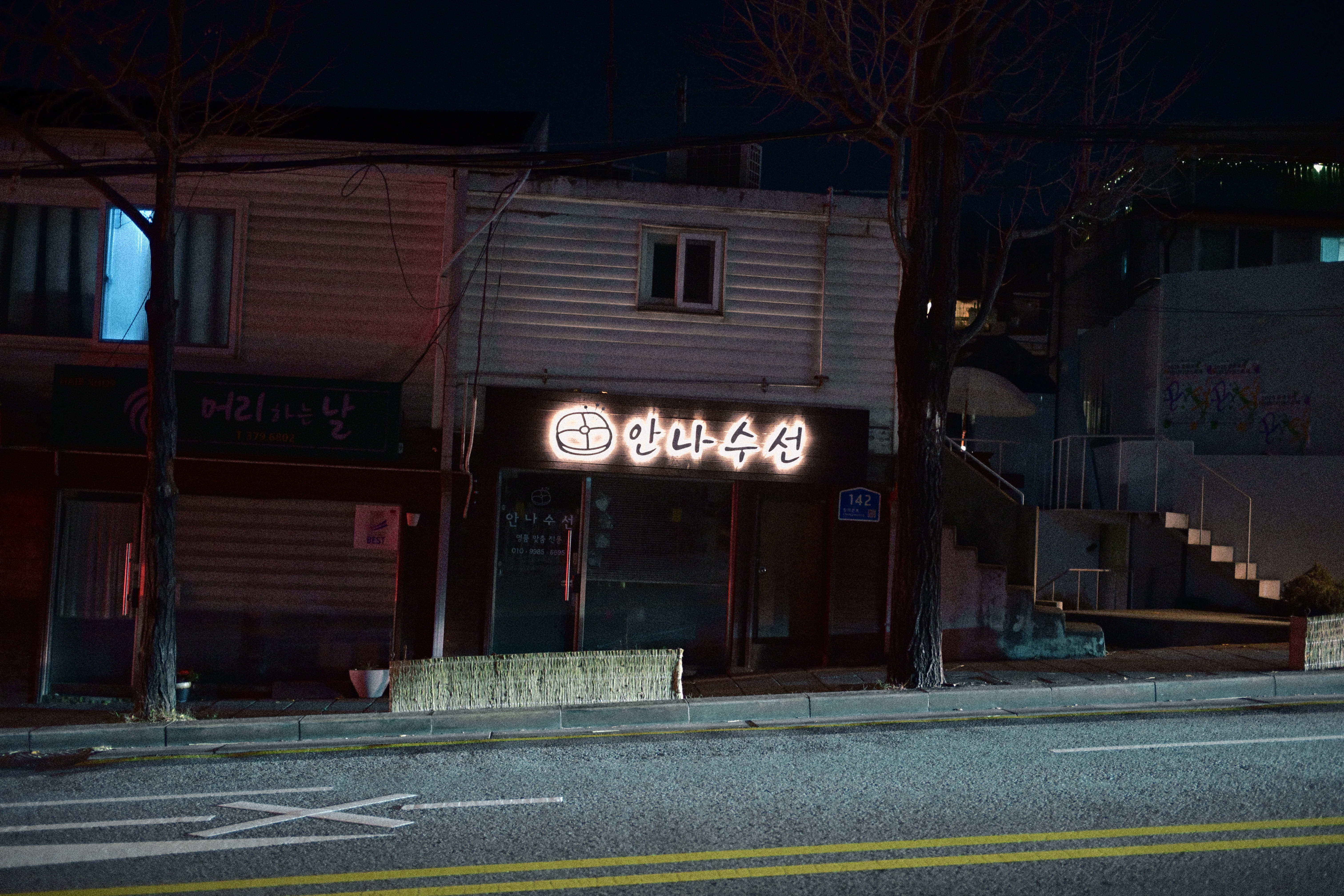 밤의 가로수, 상가의 간판, 내려간 셔터들. 늘 지나치던 비슷한 거리의 구성이다. 사람은 없고, 사건도 없다. 프레임 안에는 늘 보아온 거리의 요소들이 차분히 들어와 있을 뿐이다. 그래서 처음엔 아무 말도 하지 않는 사진처럼 보인다. 하지만 비어 있기 때문에 오히려 하루의 무게가 남아 있다. 장사를 마친 시간, 불이 꺼진 창, 내일을 기다리는 셔터.