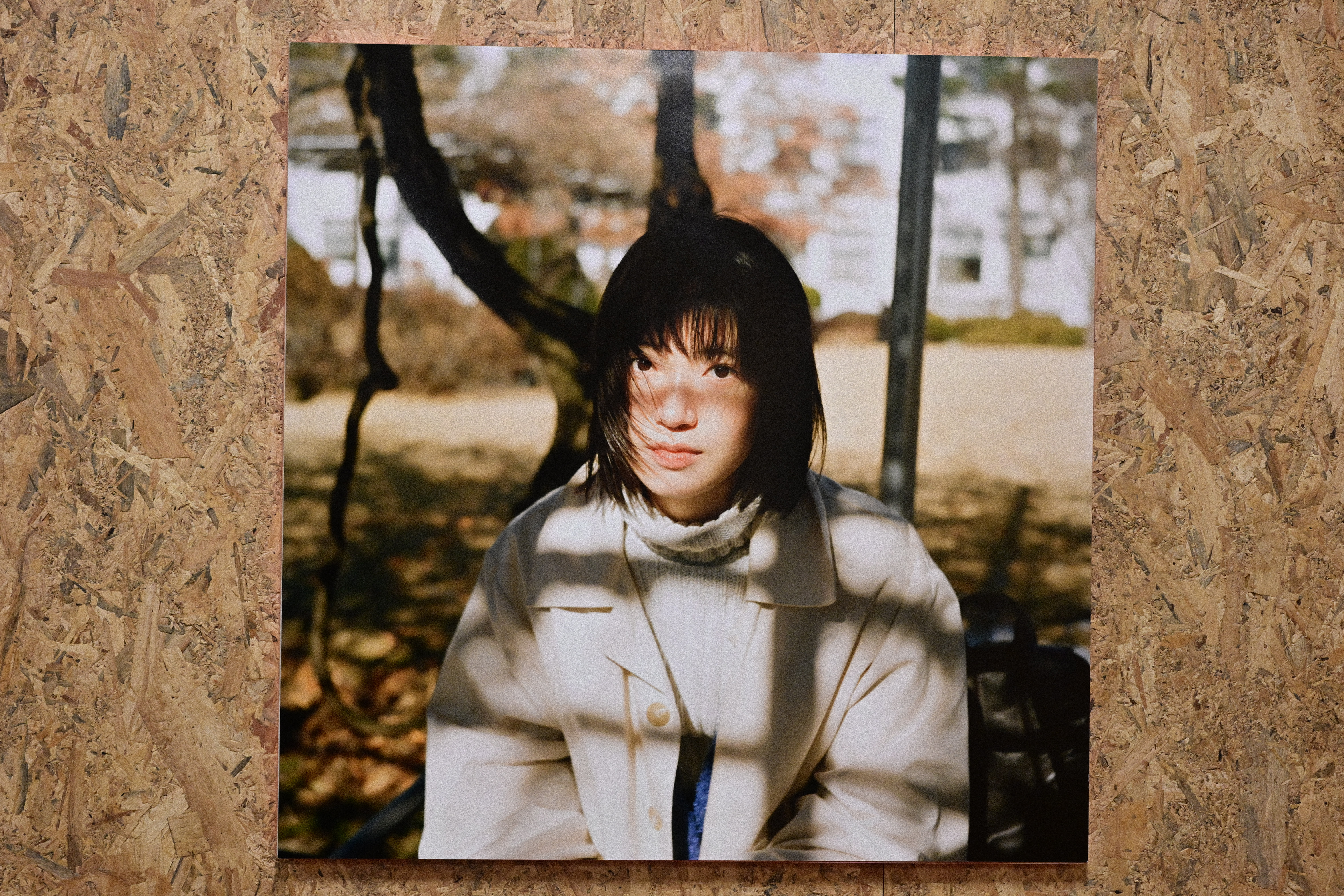 위의 사진에서는 색이 남아 있다. 햇빛은 나뭇가지 사이로 잘려 얼굴 위에 그림자가 얹히고, 바람은 머리칼을 살짝 흐트러뜨린다. 계절이 분명하다. 낙엽의 색, 코트의 질감, 공기의 온도까지 함께 들어온다. 인물은 정면을 보지만, 표정은 닫혀 있다. 감정을 드러내지 않으면서도, 지금 이 순간을 온몸으로 받는 얼굴이다. 빛은 얼굴을 비추지만, 완전히 설명하지는 않는다.