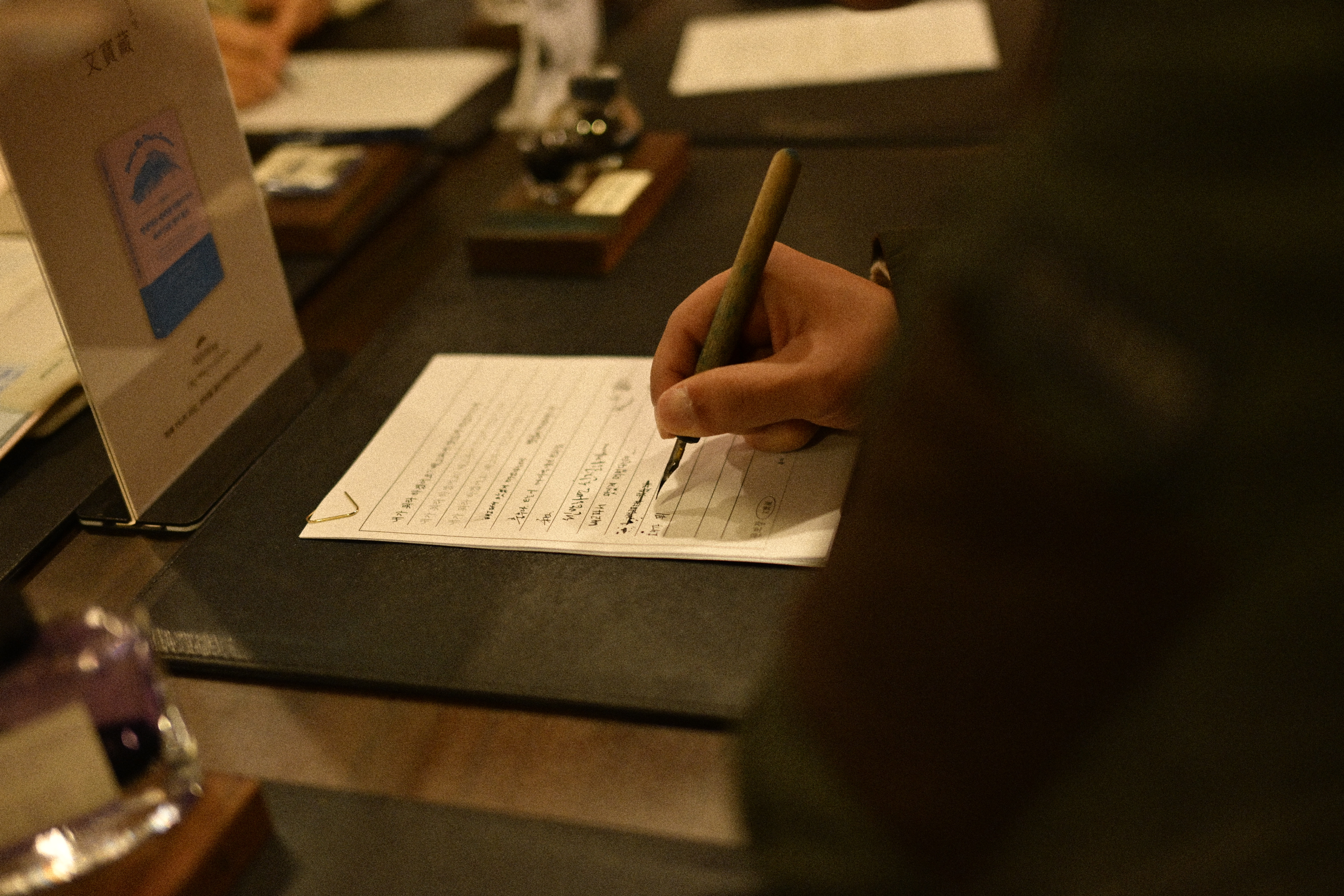실내 공간에서 종이에 펜으로 글을 쓰고 있는 장면이다. 테이블 위에는 메모지와 펜, 작은 소품들이 놓여 있고, 조명은 전반적으로 따뜻하다. 초점은 손과 종이에 맞춰져 있으며, 주변은 얕은 심도로 부드럽게 흐려져 있다. 배경에는 손이나 테이블이 희미하게 보이지만, 장면의 중심은 기록하는 행위 그 자체에 머문다. 전체적으로 조용하고 집중된 분위기의 사진이다.