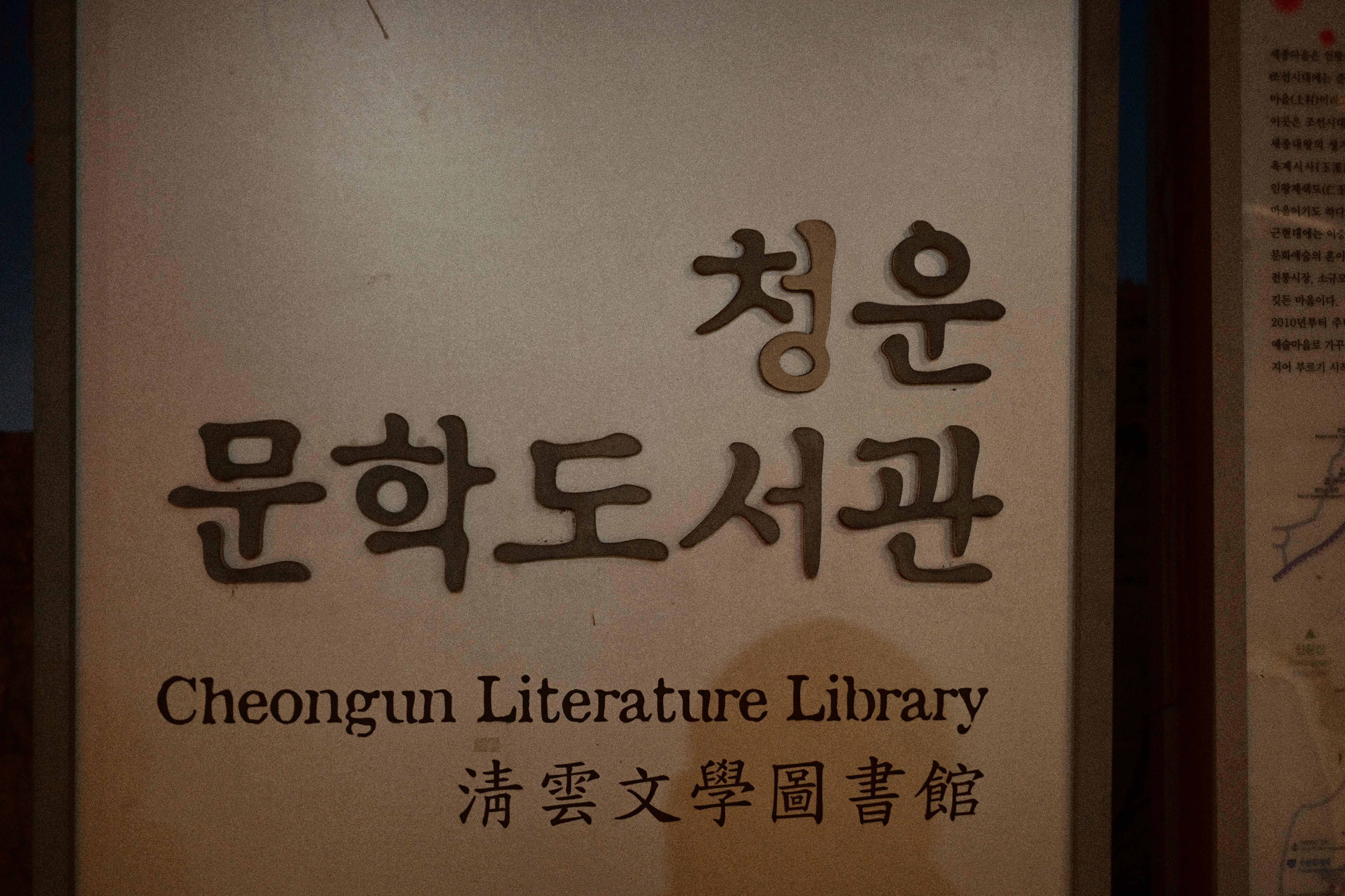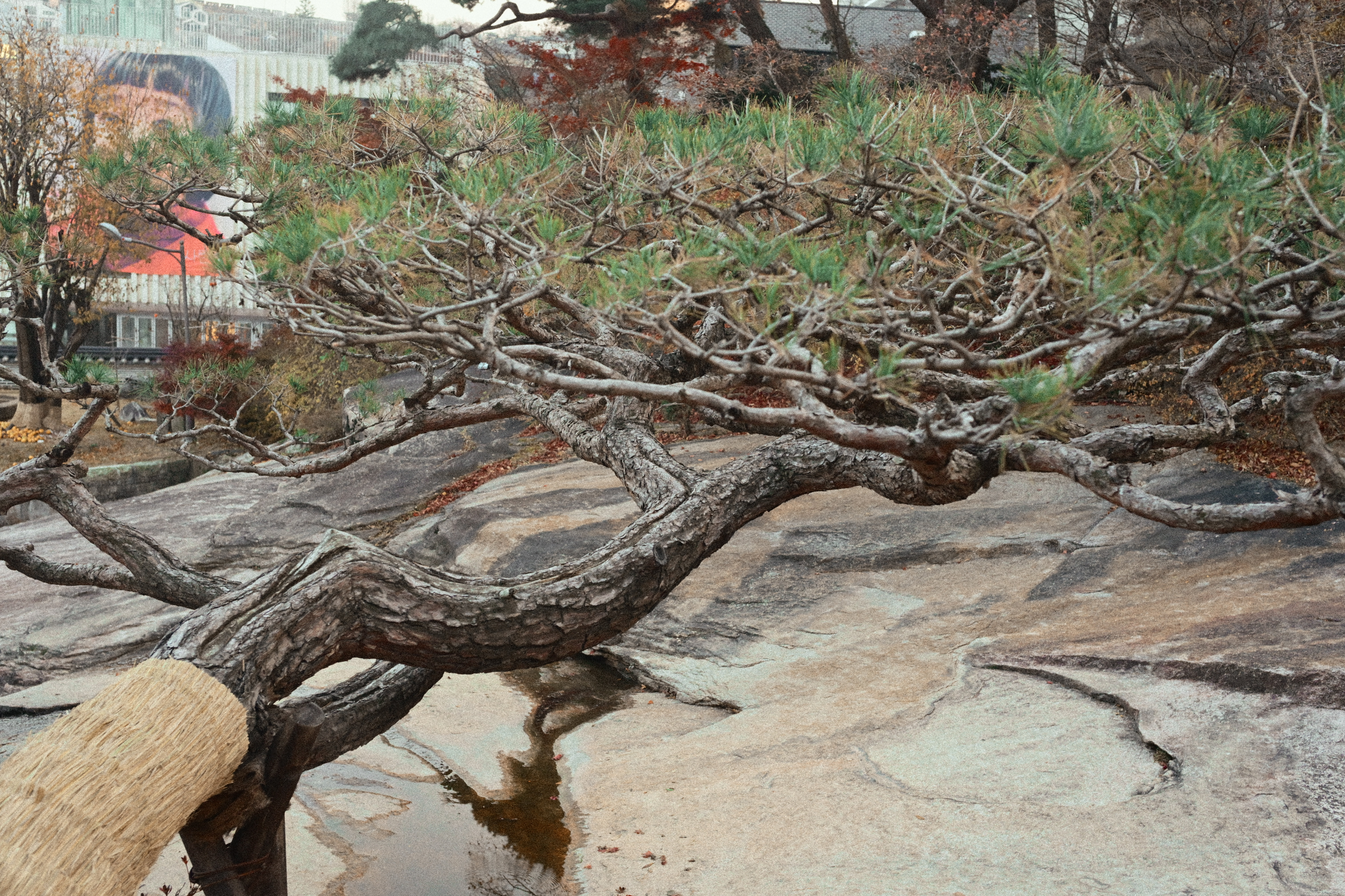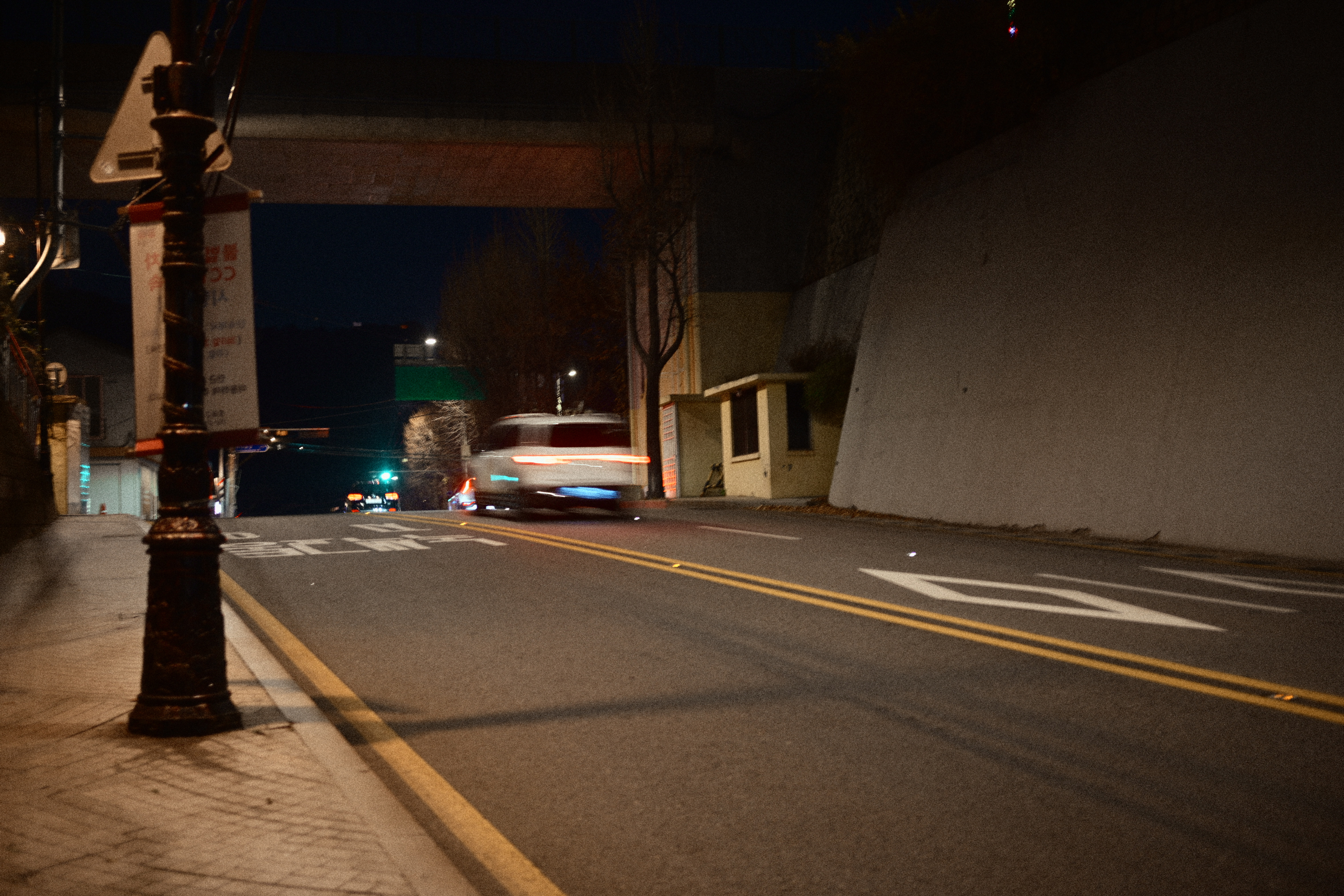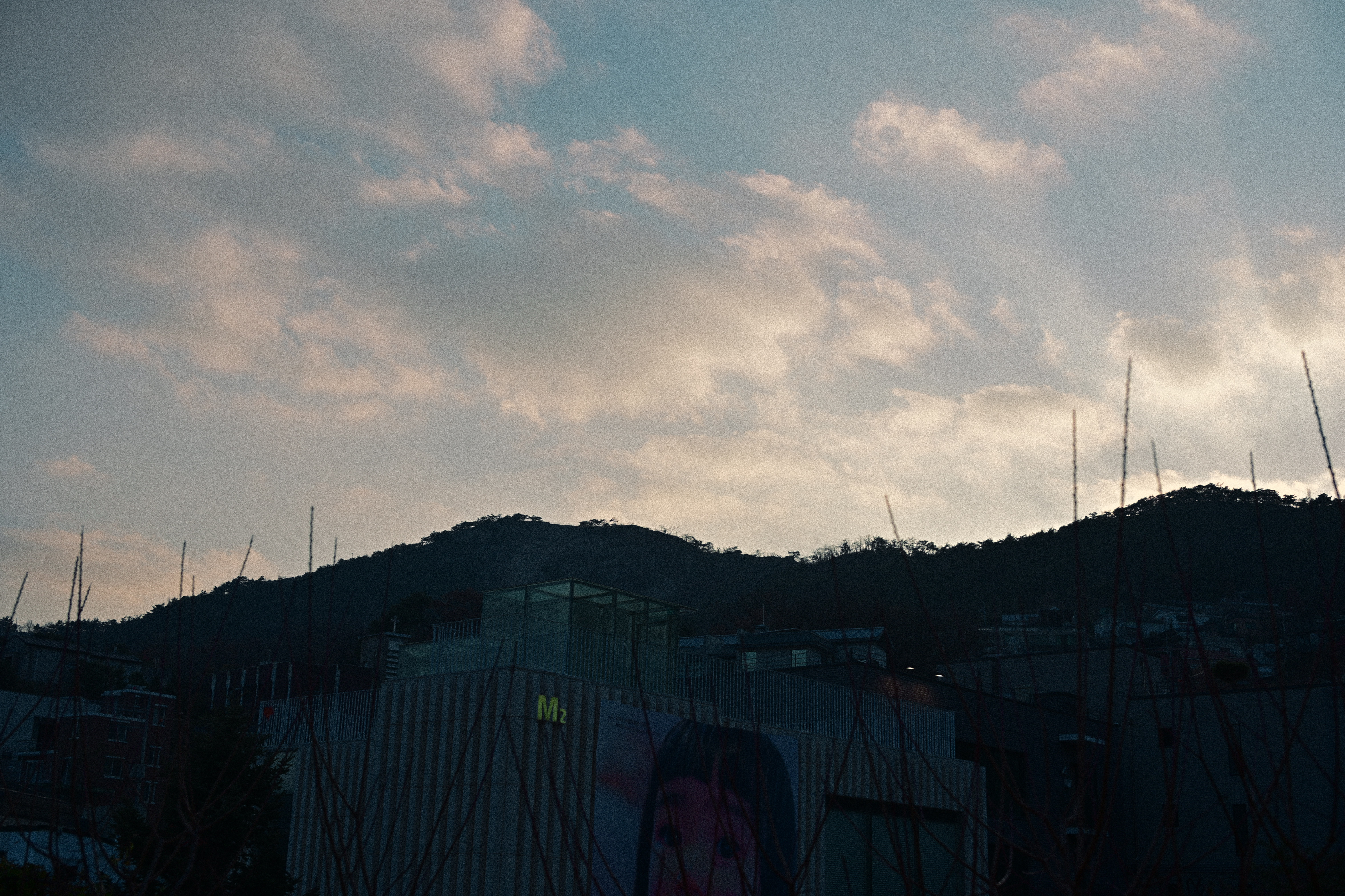 이 사진은 무언가를 보여주기보다 끝난 뒤의 공기를 붙잡는다. 빛은 충분하지만 요란하지 않다. 나무는 빛을 받아 부풀어 있는 것처럼 보이고, 간판은 제 역할을 마친 채 남아 있다. 필름의 입자감이 사진을 현재에서 한발 물러나게 하며, 이 거리를 지금이 아니라 기억에 가까운 현재로 만든다. 무엇을 보라고 지시하지 않는 방식이 이 사진의 중심이다.