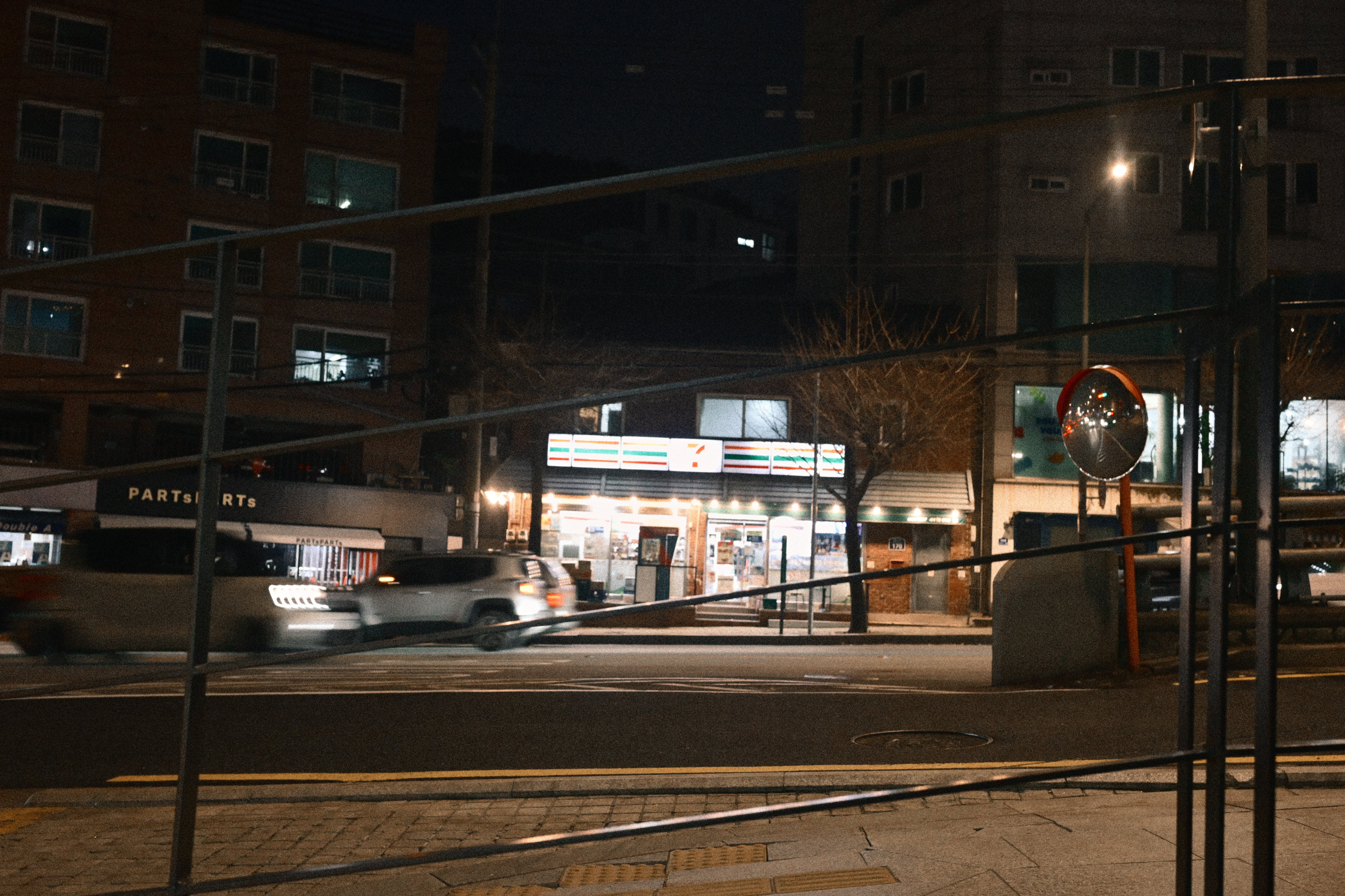 난간 너머로 보이는 장면은 특별할 게 없었다. 흔한 밤거리, 흔한 불빛, 흔한 편의점. 그런데 이상하게도 그게 좋았다. 전시에서 말하던 저마다의 속도가 이 풍경 안에서는 아주 자연스럽게 존재하고 있었기 때문이다. 사진은 늘 이렇게 남는 것 같다. 전시의 여운이 완전히 사라지기 전, 생각이 아직 정리되지 않았을 때, 아무 의미도 없는 장면에 슬쩍 기대어 찍힌다. 그래서 이 사진은 기록이라기보다 전시의 끝에 붙은 작은 꼬리표에 가깝다. 그날 내가 어떤 속도로 걸었는지, 어떤 밤으로 돌아왔는지를 조용히 증명하는 듯했다.