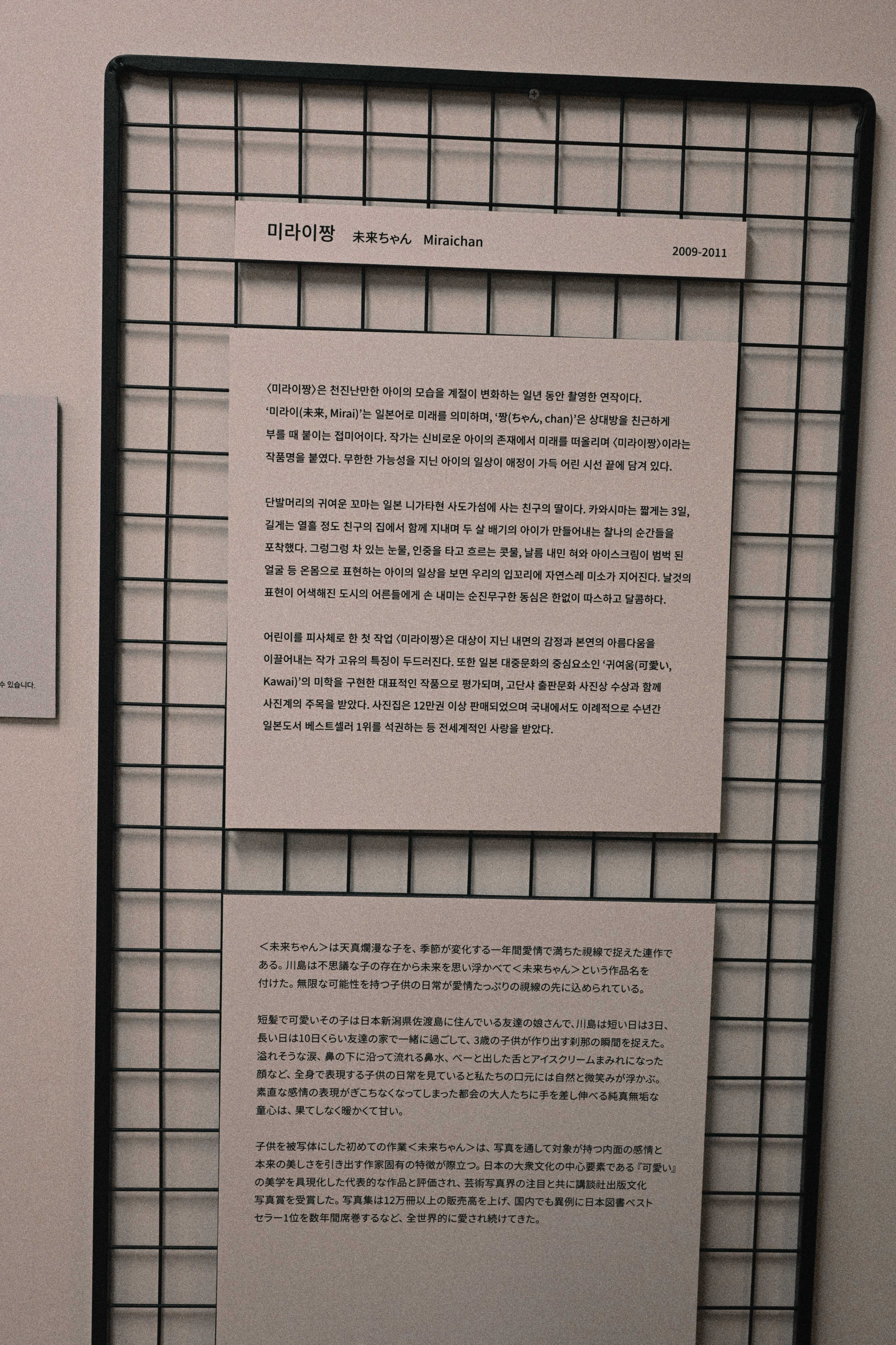 그래서 이 전시는 어떤 의미에서는 사진을 보러 간다기보다, 사진집에 대한 오래된 미련을 확인하러 가는 자리에 가까웠다. 전시장 벽에 붙은 설명을 읽으며, 왜 이 작업이 오래 기억에 남았는지 조금 더 분명해졌다. 아이를 찍었기 때문이 아니다. 귀여움을 찍었기 때문도 아니다. 이 사진들은 아이를 통해 어떤 감정을 증명하려 들지 않는다.