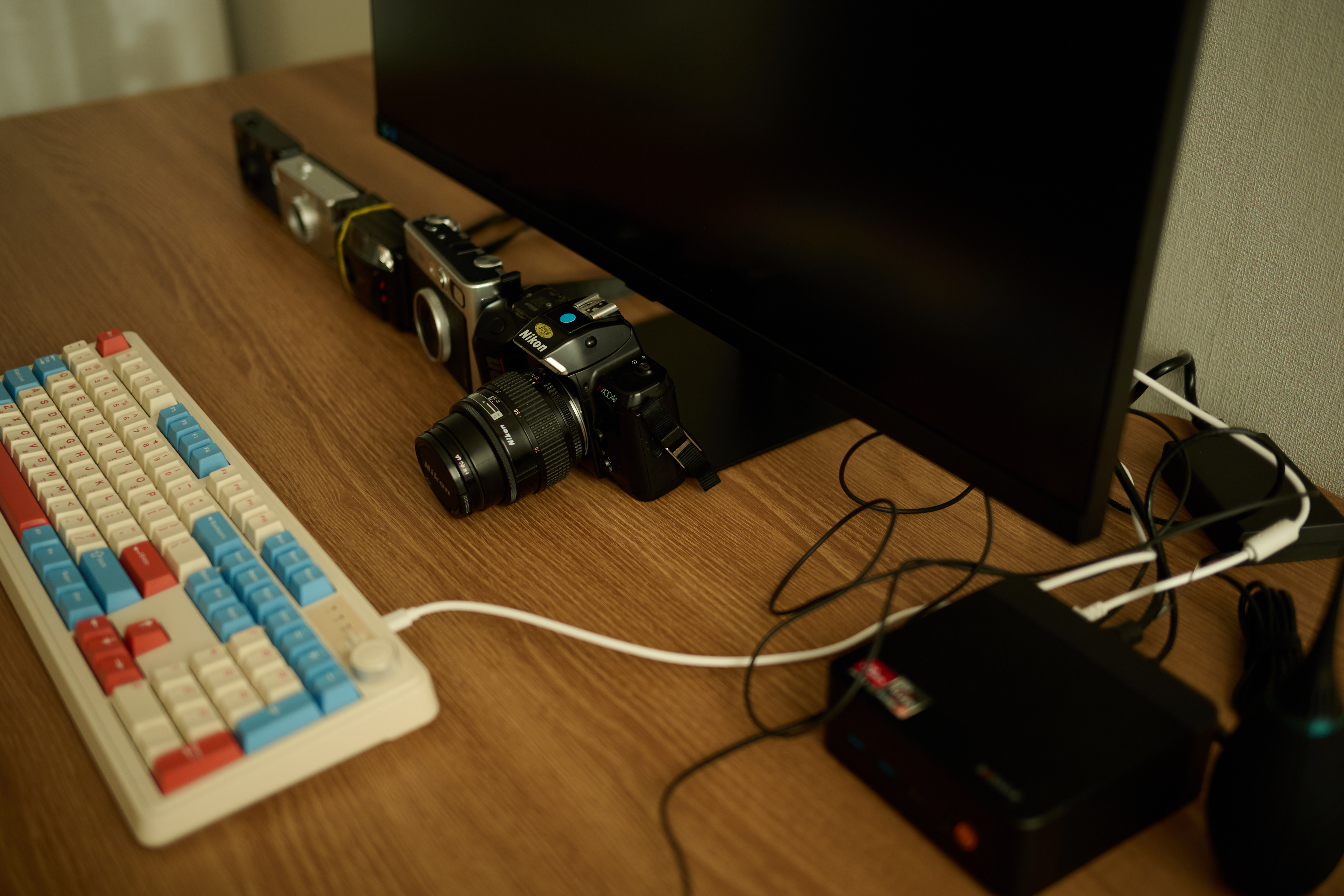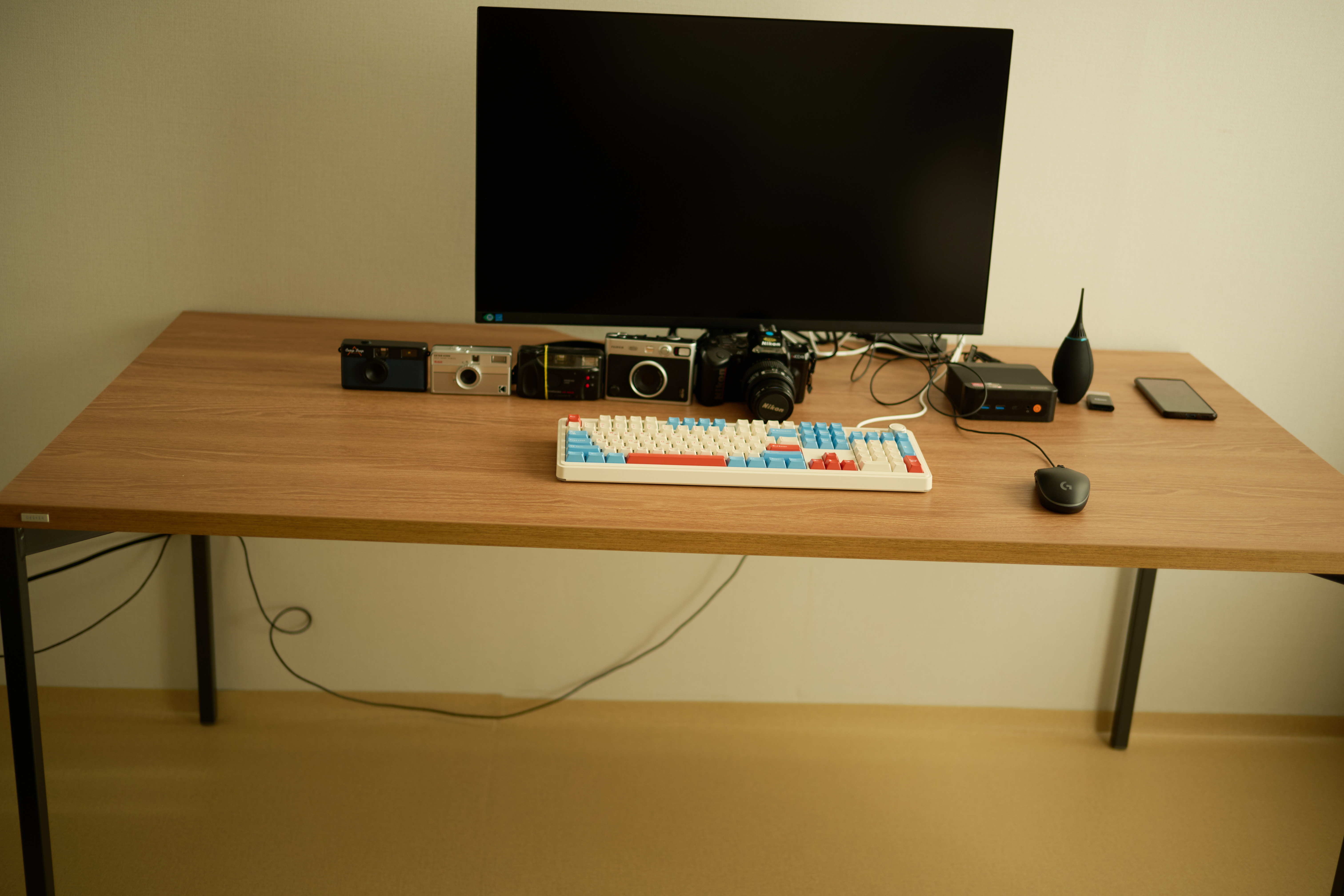 반면 1600*800은 작업 공간으로는 충분하면서도 방을 답답하게 만들지 않는 절충안처럼 느껴졌다. 결국 책상 위를 얼마나 채울지가 아니라, 책상 주변을 어떻게 비워둘지가 더 중요해졌다. 실제로는 모니터와 키보드, 마우스만 올려두고도 작업이 가능하겠지만, 언젠가는 카메라나 노트, 잡동사니들이 자연스럽게 쌓일 게 분명하다. 실제로 지금 책상에 올라간 카메라만 6대다. 그런 미래까지 감안하면 처음부터 너무 작은 책상은 피하고 싶었다. 그 점에서 1600*800은 당분간 부족함 없이 쓸 수 있는 크기라는 생각이 들었다. 아직 설치 전이지만, 책상이 들어오면 이 공간도 조금씩 자리를 잡아갈 것이다. 책상 하나 바뀌는 것뿐인데도, 생활 패턴이 달라질 것 같은 기분이 든다. 이사를 계기로 새로 맞춘 가구 중에서, 아마 가장 오래 함께하게 될 물건이 되지 않을까 싶다. 어쨌든 글을 쓰는 와중에 책상이 도착해서 사용해 봤는데, 듀얼 모니터 구성은 나중에 생각하기로 했다.
